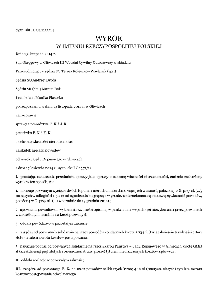Sygn. akt III Ca 1155/14 WYROK W IMIENIU RZECZYPOSPOLITEJ POLSKIEJ Dnia 13 listopada 2014 r. Sąd Okręgowy w Gliwicach III Wydział Cywilny Odwoławczy w składzie: Przewodniczący - Sędzia SO Teresa Kołeczko - Wacławik (spr.) Sędzia SO Andrzej Dyrda Sędzia SR (del.) Marcin Rak Protokolant Monika Piasecka po rozpoznaniu w dniu 13 listopada 2014 r. w Gliwicach na rozprawie sprawy z powództwa C. K. i J. K. przeciwko E. K. i K. K. o ochronę własności nieruchomości na skutek apelacji powodów od wyroku Sądu Rejonowego w Gliwicach z dnia 17 kwietnia 2014 r., sygn. akt I C 1557/12 I. prostując oznaczenie przedmiotu sprawy jako sprawy o ochronę własności nieruchomości, zmienia zaskarżony wyrok w ten sposób, że: 1. nakazuje pozwanym wycięcie dwóch topoli na nieruchomości stanowiącej ich własność, położonej w G. przy ul. (...), rosnących w odległości 1-5,7 m od ogrodzenia biegnącego w granicy z nieruchomością stanowiącą własność powodów, położoną w G. przy ul. (...) w terminie do 13 grudnia 2014r.; 2. upoważnia powodów do wykonania czynności opisanej w punkcie 1 na wypadek jej niewykonania przez pozwanych w zakreślonym terminie na koszt pozwanych; 3. oddala powództwo w pozostałym zakresie; 4. zasądza od pozwanych solidarnie na rzecz powodów solidarnych kwotę 1.234 zł (tysiąc dwieście trzydzieści cztery złote) tytułem zwrotu kosztów postępowania; 5. nakazuje pobrać od pozwanych solidarnie na rzecz Skarbu Państwa – Sądu Rejonowego w Gliwicach kwotę 65,83 zł (sześćdziesiąt pięć złotych i osiemdziesiąt trzy grosze) tytułem nieuiszczonych kosztów sądowych; II. oddala apelację w pozostałym zakresie; III. zasądza od pozwanego E. K. na rzecz powodów solidarnych kwotę 400 zł (czterysta złotych) tytułem zwrotu kosztów postępowania odwoławczego. SSR (del.) Marcin Rak SSO Teresa Kołeczko – Wacławik SSO Andrzej Dyrda Sygn. akt III Ca 1155/14 UZASADNIENIE Zaskarżonym wyrokiem Sąd Rejonowy w Gliwicach, w oparciu o przepis art. 140 k.c. w zw. z art. 222 § 2 k.c. oddalił powództwo C. K. i J. K. o nakazanie pozwanym E. K. i K. K. wycięcia dwóch kilkudziesięcioletnich topoli rosnących na ich nieruchomości w niewielkiej odległości od granicy z nieruchomością powodów. Sąd I instancji ustalił, że topole rosną wraz z innymi drzewami liściastymi i iglastymi na nieruchomości pozwanych przy granicy z nieruchomością powodów, na której rosną drzewka i krzewy iglaste. Pień jednej z nich położony jest w odległości 1,2 m od płotu dzielącego obie działki, a pień drugiej w odległości 5,6 m. Topole znacznie przewyższały wysokością budynek mieszkalny powodów położony w odległości ponad 20 m od miejsca ich posadowienia gdyż osiągały wysokość 20 m. W toku postępowania zostały przycięte przez pozwanych. Przed przycięciem znacznie się wyginały podczas wiatru, a po wichurach na działce powodów pojawiały się gałęzie. Na wiosnę topole zrzucały owocostany, które spadały również na działkę powodów, przyklejały się do obuwia oraz łap psa, a podczas kwitnienia zrzucały pyłek. Jesienią na ogród powodów spadają liście i powodowie zmuszeni są je sprzątać i wywozić. Drzewka i krzewy na działce powodów usychają, są karłowate, co powodowie łączą z bliskością topoli. Rano topole zacieniają ich działkę. Z opinii biegłego dendrologa wynika, że w miejscu poprzednich cięć topole wykazują zbutwienia, wypróchnienia, szkodniki owadzie i przejawy zgnilizny wewnętrznej. Ponieważ mają dużą zdolność regeneracji, radzą sobie z zasklepieniem ran i ubytków. Objawy osłabienia drzewek i krzewów na działce powodów mogą być spowodowane zarówno ograniczeniem dostępu światła słonecznego przez przedmiotowe topole i odbieraniem przez nie wilgotności glebie, ale również zbyt dużym zwarciem krzewów na działce i ogólnie słabym oświetleniem działki związanym z gęstą zabudową. Fragmenty gniazd nasiennych stanowiących pyłek w postaci waty nie wykazują właściwości uczulających. Biegły podkreślił, że topole pełnią dużo pozytywnych funkcji dla środowiska oczyszczając glebę, usuwając i degradując zanieczyszczenia pochodzenia chemicznego, pobierając szkodliwe metale jak cynk, ołów i kadm. Zwrócił uwagę, że z powodu złego stanu fitosanitarnego drzew, podczas złych warunków atmosferycznych może dojść do powstania złomów i wykrotów zagrażających mieniu powodów. Przycięcie topoli w toku postępowania zmniejszyło ryzyko zagrożenia dla mienia powodów, ale go nie wyeliminowało. Z uwagi na duże możliwości regeneracyjne w ciągu dwóch lat drzewa mogą odrosnąć do pierwotnego stanu. Topole są silnie zakorzenione w ziemi, stąd możliwość wyrwania ich z korzeniami jest niewielka, chociaż jak podkreślił biegły, nawet zdrowe drzewo może zostać przewrócone przez wiatr. W ocenie biegłego obecny stan topoli nie uzasadnia ich wycięcia z powodu zagrożenia dla mienia powodów. Zwrócił uwagę, że pod wpływem przycinania korony system korzeniowy topoli rozrasta się. Korzenie przechodzące na działkę powodów mogą zostać przez nich obcięte co nie wpłynie znacząco na zmniejszenie stabilności drzew, a jednocześnie zabezpieczy rośliny rosnące na działce powodów przed niekorzystnym wpływem systemu korzeniowego topoli. Podniósł, że korzenie topoli potrafią niszczyć infrastrukturę, a celem uniknięcia przechodzenia korzeni na działkę powodów koniecznym byłoby wykonanie parkanu wzdłuż granicy o głębokości 2-3m. Ustalając powyższe uznał Sąd Rejonowy - oceniając przesłanki z art. 144 k.c. - że pozwani, utrzymując topole na swej działce w bezpośrednim sąsiedztwie z nieruchomością powodów nie zakłócają im korzystania z tej nieruchomości ponad przeciętną miarę wynikającą ze społeczno-gospodarczego przeznaczenia nieruchomości i stosunków miejscowych. Podniósł, że t