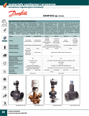 materiały sanitarne i grzewcze armatura regulacyjna instalacji DANFOSS sp. z o.o. pozostałe prezentacje AUTOMATYCZNE ZAWORY RÓWNOWAŻĄCE ASV – do instalacji grzewczych i klimatyzacyjnych z klimakonwektorami, aparatami grzewczo-wentylacyjnymi, belkami chłodzącymi; stabilizacja ciśnienia dyspozycyjnego może być prowadzona na początku gałęzi lub przed poszczególnymi urządzeniami; mogą być stosowane również w celu zapobiegania problemom z hałasem w instalacjach z termostatycznymi zaworami grzejnikowymi, poprzez kontrolowanie ciśnienia różnicowego AB-QM – stosowane gł. do automatycznego ograniczania przepływu przed urządzeniami instalacji np. centraNazwa str. 109 AB-QM Rodzaj Miejsce montażu Czynnik roboczy Średnica DN [mm] Rodzaj przyłączy Ciśnienie nominalne [MPa] Maks. ciśnienie różnicowe [MPa] Temperatura robocza [oC] Przepływ [m3/h] Współczynnik Kvs [m3/h] Nastawa Materiał korpusu Masa [kg] Gwarancja Normy, atesty ASV-P ASV-PV ze stałą ze zmienną nastawą bez złączek ze złączkami nastawą ciśnienia pomiarowych pomiarowymi ciśnienia dysdyspozycyjnego pozycyjnego 0,1 kPa bezpośrednio przed odbiornikiem na przewodzie powrotnym woda, mieszanina wody z glikolem 10-100 10-32 15-40 15-100 AB-QM PLUS gwintowane (Ø10-50), kołnierzowe (Ø 60-100) gwintowane ASV-M ASV-I zawór odcinający zawór odcinający z nastawą wstępna na przewodzie zasilającym 15-40 gwintowane (GW lub GZ), kołnierzowe 1,6 0,4 0,15 od -10 do +120 0,30-41,00 1,0 procentowa przepływu mosiądz (Ø 10-32) lub żeliwo szare GG25 (Ø 40-100) 0,38-2,21 7,00-57,00 od -20 do +120 (Ø 15-40), od -10 do +120 (Ø 50-100) 0,25-25,00 1,6-10,0 wstępna, z możliwością zablokowania AB-QM DN 65-100 30 lami klimatyzacyjnymi, klimakonwektorami, itp. lub na jej odgałęzieniach, do instalacji zmiennoprzepływowych, stałoprzypływowych (instalacje klimatyzacyjne) lub na pionach świecowych (instalacje grzewcze); zawory mają wbudowany regulator różnicy ciśnienia, zapewniający stały spadek jej na zaworze regulacyjnym, dzięki czemu występują mniejsze zakłócenia w regulacji temperatury i zmniejsza się ilość włączeń siłownika; nie występuje zjawisko nadprzepływów i podprzepływów Katalog Inżyniera Inżynieria Środowiska 2008/2009 mosiądz (Ø 10-40) lub żeliwo szare GG25 (Ø 50-100) 0,70-3,46 0,75-65,00 0,32-1,49 0,34-1,50 2 lata DZ nr 533 AB-QM DN 10-32 DZ nr 608 AB-QM DN 40-50 ASV-PV DN 50-100 materiały sanitarne i grzewcze armatura regulacyjna instalacji RĘCZNE ZAWORY RÓWNOWAŻĄCE MSV-I/M – do instalacji grzewczych i klimatyzacyjnych o stałych przepływach; zawory MSV-I umożliwiają wykonanie nastawy wstępnej, odcięcie pionu oraz pomiar spadku ciśnienia (przepływu) na zaworze, a z MSV-M – pomiar spadku ciśnienia w pionie; utrzymują stały spadek ciśnienia w instalacjach stałoprzepływowych MSV-C – do instalacji grzewczych i klimatyzacyjnych o stałym przepływie oraz instalacji c.w.u.; z wbudowaną kryzą pomiarową, na której prowadzony jest pomiar spadku ciśnienia z dokładnością ± 5%, iglicowe złączki na kryzie; pokrętło ma funkcję odcięcia, wartość nastawy widoczna jest wokół podstawy pokrętła MSV-F2 – przeznaczone do równoważenia hydraulicznego instalacji grzewczych i klimatyzacyjnych (woda lodowa); w instalacjach stałoprzepływowych utrzymują stały spadek ciśnienia, jego wartość zależy od nastawy pozostałe prezentacje MSV-I MSV-C str. 109 MSV-F2 MSV-M Nazwa MSV-I MSV-M MSV-C MSV-F2 Rodzaj ze złączkami pomiarowymi z kurkiem odwadniającym ze złączkami lub bez ze zmienną nastawą ciśnienia dyspozycyjnego Miejsce montażu na przewodzie zasilającym na przewodzie zasilającym lub powrotnym na przewodzie powrotnym Czynnik roboczy woda, mieszanina wody z glikolem Średnica DN [mm] 15-50 Rodzaj przyłączy 15-400 gwintowane (GW lub GZ) gwintowane GW kołnierzowe Ciśnienie nominalne [MPa] 1,6 1,6; 2,5 Maks. ciśnienie różnicowe [MPa] 0,15 0,15 (PN 1,6); 0,20 (PN 2,5) Temperatura robocza [oC] Przepływ [m3/h] Współczynnik Kvs [m3/h] Nastawa od -20 do +120 od -10 do +120 od -10 do +130 (PN 1,6); od -10 do +150 (PN 2,5) 0,02-19,50 0,05-61,00 0,04- 3000,00 (PN 1,6); 0,04-3700,00 (PN 2,5) 1,6-16,0 1,8-41,0 3,1-2584,6 nastawa wstępna, możliwość odcięcia przepływu Materiał korpusu możliwość odcięcia przepływu mosiądz lub mosiądz DZR żeliwo szare GG25 (PN 1,6) lub żeliwo sferoidalne GGG40.3 (PN 2,5) 0,475-3,645 1,900-805 DZ nr 594, PZH HK/ W0499/01/2002 DZ nr 597 mosiądz Masa [kg] 0,260-1,980 Gwarancja 2 lata Normy, atesty POZOSTAŁE PRODUKTY nastawa wstępna i możliwość jej zablokowania, możliwość odcięcia przepływu DZ nr 608 pompy ciepła, ogrzewanie podłogowe i ścienne elektryczne lub wodne, ogrzewanie przeciwzamarzaniowe i przeciwoblodzeniowe, termostaty grzejnikowe, regulatory pogodowe, zawory kulowe, zawory i napędu elektryczne, regulatory ciśnienia i przepływu, regulatory temperatury, wymienniki ciepła, kompaktowe węzły cieplne, komponenty do palników olejowych, ciepłomierze, wentylatory www.heating.danfoss.pl informacja techniczna informacja handlowa [email protected] 0 22 755 06 00, [email protected] 0 22 755 09 21 adres firmy – str. 258 Katalog Inżyniera Inżynieria Środowiska 2008/2009 31