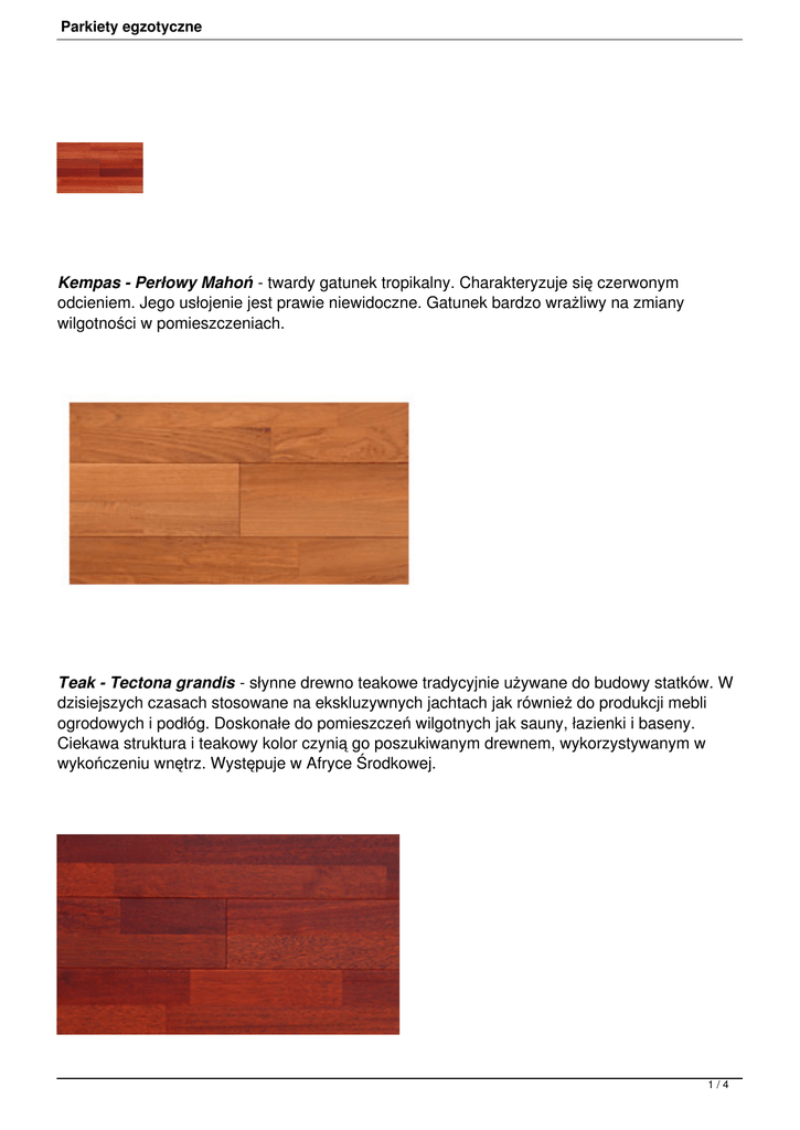 Parkiety egzotyczne Kempas - Perłowy Mahoń - twardy gatunek tropikalny. Charakteryzuje się czerwonym odcieniem. Jego usłojenie jest prawie niewidoczne. Gatunek bardzo wrażliwy na zmiany wilgotności w pomieszczeniach. Teak - Tectona grandis - słynne drewno teakowe tradycyjnie używane do budowy statków. W dzisiejszych czasach stosowane na ekskluzywnych jachtach jak również do produkcji mebli ogrodowych i podłóg. Doskonałe do pomieszczeń wilgotnych jak sauny, łazienki i baseny. Ciekawa struktura i teakowy kolor czynią go poszukiwanym drewnem, wykorzystywanym w wykończeniu wnętrz. Występuje w Afryce Środkowej. 1/4 Parkiety egzotyczne Merbau solid oraz Merbau Maritim panel - gatunek szeroko stosowany na podłogi ze względu na doskonale parametry twardości i stabilności. Ma kolor brązowy czasami brązowo czerwony. Występuje na Półwyspie Malezyjskim i w Indonezji. Palisander - drewno to niezwykle szlachetny materiał, który dodaje wnętrzom elegancji i ciepła. Wielość dostępnych gatunków, sprawia, że wzór i barwę drewna można dobrać do indywidualnego stylu i gustu. Iroko - Kambala, Odum, Rokko - drewno przyjmuje kolor od żółto-brązowego do ciemnobrązowego. Pod wpływem światała zmienia kolor na złocisto-miodowy. 2/4 Parkiety egzotyczne Lingue -kolor Doussie , Red Apa, Afzelia - drewno zmienia wygląd. z jasnobrązowego do ciemno czerwonego. ciepło rudawej Parkiet barwie. nadajePod pomieszczeniu wpływem światła ciepły i zmysłowy Jatoba - Diamentowa czerwono-brązowym, przez USA. Pochodzi o z Czereśnia Ameryki dużej twardości Płd. - szeroko i stabilności. stosowany Nr 1gatunek wśród gatunków w kolorze importowanych Merbau Line panel drewniany oraz Merbau Merbau zbudowane nadając im jednocześnie z małych elegancki paseczków. charakter ObaIndustrial wzory wizualnie - nowe,powiększają interesującepomieszczenie wersje podłogi Ipe -z drewno jest bardzo wysokiej w kolorze odporności oliwkowo-brązowym na warunki do atmosferyczne, czekoladowego. To często stosowane eleganckiena drewno zewnątrz. znane Sucupira - Sapurira charakteryzujący się równomierną - Południowo barwą, Amerykański wysokągatunek twardością w kolorze i widocznym brązowo usłojeniem. - kawowym Zebrano - drewno w kolorze żółtym z ciemnobrązowymi, regularnymi pasami przypominającymi zebrę. 3/4 Parkiety egzotyczne Wenge - drewno bardzo ciemne, czekoladowo-brązowe do czarnego z elementami bieli. 4/4