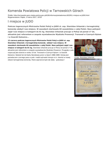 Komenda Powiatowa Policji w Tarnowskich Górach Źródło: http://tarnowskie-gory.slaska.policja.gov.pl/k26/informacje/wiadomosci/63291,I-miejsce-w-JUDO.html Wygenerowano: Piątek, 3 marca 2017, 19:03 I miejsce w JUDO Podczas tegorocznych Mistrzostw Polski Policji w JUDO st. asp. Stanisław Urbaniak z tarnogórskiej komendy zdobył I-sze miejsce. W zawodach startowało 60 zawodników z całej Polski. Nasz policjant zajął I-sze miejsce w kategorii do 81 kg. Stanisław Urbaniak pracuje w Policji od ponad 17 lat, aktualnie jest referentem w zespole wywiadowców Wydziału Prewencji. Trenował w Czarnych Bytom i w Gwardii Katowice... 13 czerwca podczas tegorocznych Mistrzostw Polski Polcji w JUDO st. asp. Stanisław Urbaniak z tarnogórskiej komendy zdobył I-sze miejsce. W zawodach startowało 60 zawodników z całej Polski. Nasz policjant zajął I-sze miejsce w kategorii do 81 kg. Stanisław Urbaniak pracuje w Policji od ponad 17 lat, aktualnie jest referentem w zespole wywiadowców Wydziału Prewencji. Przygodę z judo rozpoczął jako dziecko w wieku 10 lat. Trenował w Czarnych Bytom i w Gwardii Katowice. Należał też do Kadry Narodowej junior w latach 1986-1989. Dzisiaj jest posiadaczem czarnego pasa w judo i nadal wytrwale trenuje m.in. również w nowej siłowni tarnogórskiej komendy. Panie aspirancie byle tak dalej – gratulacje ! st.asp. Stanisław Urbaniak Ocena: 0/5 (0) Tweetnij