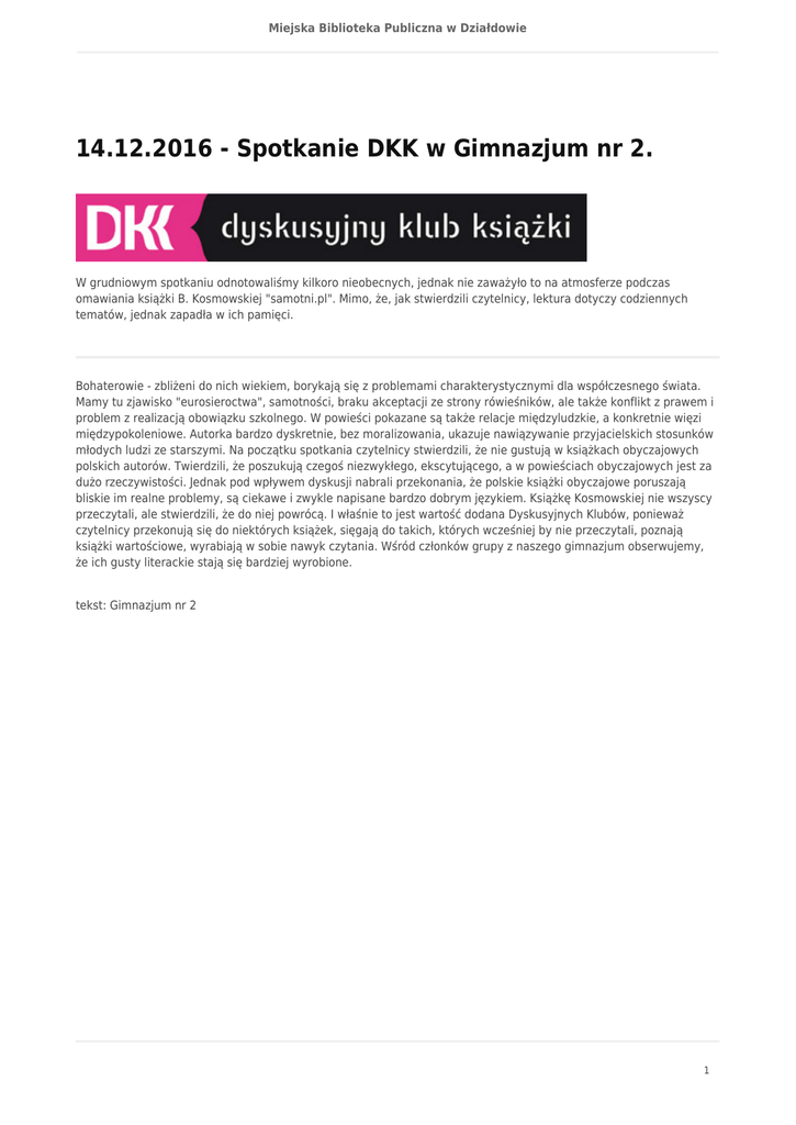 Miejska Biblioteka Publiczna w Działdowie 14.12.2016 - Spotkanie DKK w Gimnazjum nr 2. W grudniowym spotkaniu odnotowaliśmy kilkoro nieobecnych, jednak nie zaważyło to na atmosferze podczas omawiania książki B. Kosmowskiej "samotni.pl". Mimo, że, jak stwierdzili czytelnicy, lektura dotyczy codziennych tematów, jednak zapadła w ich pamięci. Bohaterowie - zbliżeni do nich wiekiem, borykają się z problemami charakterystycznymi dla współczesnego świata. Mamy tu zjawisko "eurosieroctwa", samotności, braku akceptacji ze strony rówieśników, ale także konflikt z prawem i problem z realizacją obowiązku szkolnego. W powieści pokazane są także relacje międzyludzkie, a konkretnie więzi międzypokoleniowe. Autorka bardzo dyskretnie, bez moralizowania, ukazuje nawiązywanie przyjacielskich stosunków młodych ludzi ze starszymi. Na początku spotkania czytelnicy stwierdzili, że nie gustują w książkach obyczajowych polskich autorów. Twierdzili, że poszukują czegoś niezwykłego, ekscytującego, a w powieściach obyczajowych jest za dużo rzeczywistości. Jednak pod wpływem dyskusji nabrali przekonania, że polskie książki obyczajowe poruszają bliskie im realne problemy, są ciekawe i zwykle napisane bardzo dobrym językiem. Książkę Kosmowskiej nie wszyscy przeczytali, ale stwierdzili, że do niej powrócą. I właśnie to jest wartość dodana Dyskusyjnych Klubów, ponieważ czytelnicy przekonują się do niektórych książek, sięgają do takich, których wcześniej by nie przeczytali, poznają książki wartościowe, wyrabiają w sobie nawyk czytania. Wśród członków grupy z naszego gimnazjum obserwujemy, że ich gusty literackie stają się bardziej wyrobione. tekst: Gimnazjum nr 2 1