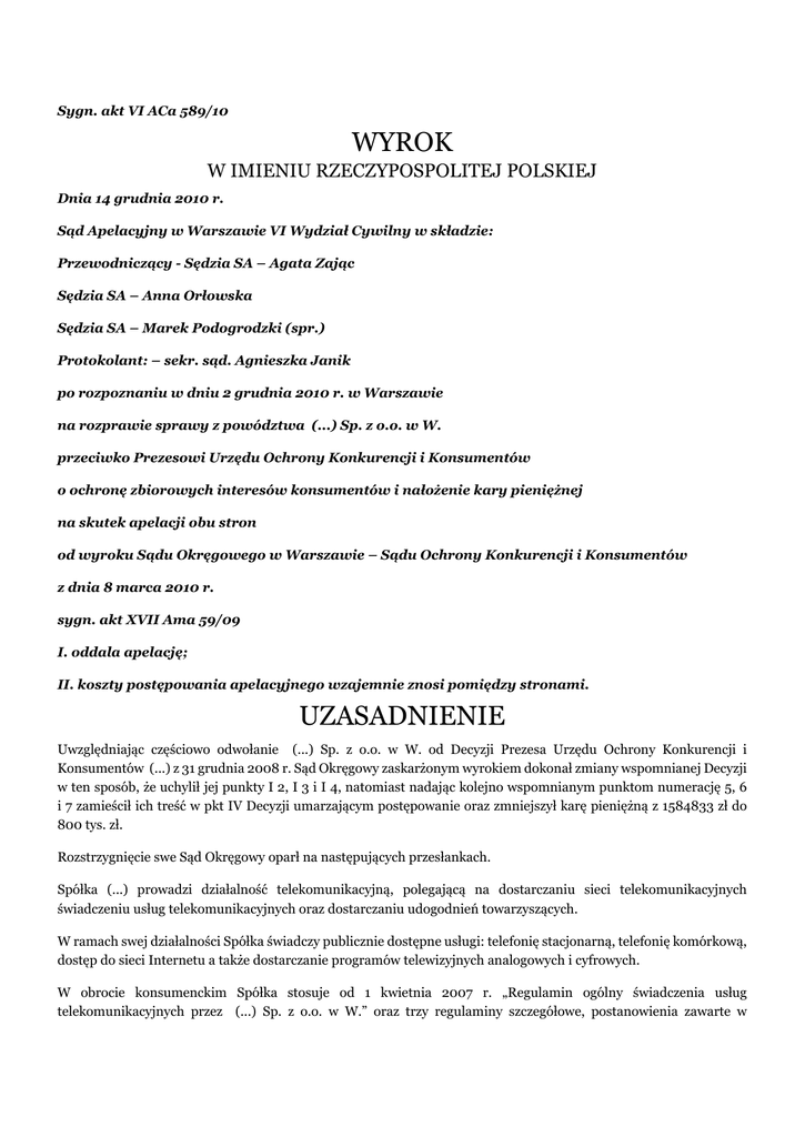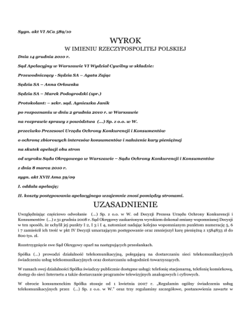 Sygn. akt VI ACa 589/10 WYROK W IMIENIU RZECZYPOSPOLITEJ POLSKIEJ Dnia 14 grudnia 2010 r. Sąd Apelacyjny w Warszawie VI Wydział Cywilny w składzie: Przewodniczący - Sędzia SA – Agata Zając Sędzia SA – Anna Orłowska Sędzia SA – Marek Podogrodzki (spr.) Protokolant: – sekr. sąd. Agnieszka Janik po rozpoznaniu w dniu 2 grudnia 2010 r. w Warszawie na rozprawie sprawy z powództwa (...) Sp. z o.o. w W. przeciwko Prezesowi Urzędu Ochrony Konkurencji i Konsumentów o ochronę zbiorowych interesów konsumentów i nałożenie kary pieniężnej na skutek apelacji obu stron od wyroku Sądu Okręgowego w Warszawie – Sądu Ochrony Konkurencji i Konsumentów z dnia 8 marca 2010 r. sygn. akt XVII Ama 59/09 I. oddala apelację; II. koszty postępowania apelacyjnego wzajemnie znosi pomiędzy stronami. UZASADNIENIE Uwzględniając częściowo odwołanie (...) Sp. z o.o. w W. od Decyzji Prezesa Urzędu Ochrony Konkurencji i Konsumentów (...) z 31 grudnia 2008 r. Sąd Okręgowy zaskarżonym wyrokiem dokonał zmiany wspomnianej Decyzji w ten sposób, że uchylił jej punkty I 2, I 3 i I 4, natomiast nadając kolejno wspomnianym punktom numerację 5, 6 i 7 zamieścił ich treść w pkt IV Decyzji umarzającym postępowanie oraz zmniejszył karę pieniężną z 1584833 zł do 800 tys. zł. Rozstrzygnięcie swe Sąd Okręgowy oparł na następujących przesłankach. Spółka (...) prowadzi działalność telekomunikacyjną, polegającą na dostarczaniu sieci telekomunikacyjnych świadczeniu usług telekomunikacyjnych oraz dostarczaniu udogodnień towarzyszących. W ramach swej działalności Spółka świadczy publicznie dostępne usługi: telefonię stacjonarną, telefonię komórkową, dostęp do sieci Internetu a także dostarczanie programów telewizyjnych analogowych i cyfrowych. W obrocie konsumenckim Spółka stosuje od 1 kwietnia 2007 r. „Regulamin ogólny świadczenia usług telekomunikacyjnych przez (...) Sp. z o.o. w W.” oraz trzy regulaminy szczegółowe, postanowienia zawarte w Regulaminie ogólnym odnoszą się do wszystkich usług świadczonych przez Spółkę znajdując zastosowanie w zakresie nie uregulowanym przez regulaminy szczegółowe. W obrocie konsumenckim Spółka stosuje cenniki świadczenia usług dotyczące usług telefonicznych, internetowych i telewizyjnych. W dniu 1 maja 2007 r. oraz 5 lipca 2007 r. Spółka wprowadziła zmiany w wybranych postanowieniach Regulaminu ogólnego i w regulaminach szczegółowych, jednakże treść kwestionowanych w niniejszym postępowaniu postanowień umownych nie uległa zmianie. Wśród używanych przez Spółkę wzorców umownych są wszystkie objęte decyzją Prezesa Urzędu Ochrony Konkurencji i Konsumentów (...). Część z zakwestionowanych w Decyzji wzorców umownych odpowiada zdaniem Sądu Okręgowego swą treścią klauzulom zabronionym wpisanym do rejestru prowadzonego przez Prezesa Urzędu Ochrony Konkurencji i Konsumentów. Odnosi się to do: zapisu § 3 ust. 1 Regulaminu (pkt I 1a Decyzji) odpowiadającego klauzuli wpisanej do rejestru pod numerem 821, zapisu § 3 ust. 4 Regulaminu (pkt I 1 b Decyzji) odpowiadającego klauzulom wpisanym do rejestru pod numerem 502 i 1169 oraz do zapisu § 4 ust. 3 Regulaminu odpowiadającego klauzuli wpisanej do Rejestru pod numerem 1084. Za niezasadny uznał Sąd Okręgowy podnoszony w odwołaniu Spółki zarzut niezastosowania się przy orzekaniu do prawomocnego wyroku Sądu Okręgowego XVII AmC 84/06 z powództwa S. O. (1) przeciwko (...) Sp. z o.o. gdyż wyrok ten zdaniem Sądu Okręgowego ma powagę rzeczy osądzonej, między tymi stronami a nie wywołuje żadnych skutków w zakresie tzw. prawomocności rozszerzonej. Podzielając stanowisko Prezesa Urzędu Ochrony Konkurencji i Konsumentów co do oceny klauzul umownych, których dotyczy pkt I-1 a,b, c Decyzji Sąd Okręgowy oddalił w tym zakresie odwołanie Spółki. Odmiennie natomiast ocenił Sąd Okręgowy zakwestionowane w Decyzji postanowienia wzorców umów z punktów I 1, 2 i 3. W ocenie Sądu Okręgowego brak jest w prowadzonym przez Prezesa Urzędu Ochrony Konkurencji i Konsumentów Rejestrze niedozwolonych klauzul umownych postanowień o analogicznej treści. O ile strona zobowiązana do wniesienia stosownych opłat nie czyni tego, to stosownie do art. 488 § 2 k.c. druga strona upoważniona jest do powstrzymania się ze swym świadczeniem. Zarówno czynność odłączenia jak ponownego przyłączenia do sieci wymaga ze strony powoda dodatkowych działań, z którymi łączą się dodatkowe koszty, co zdaniem Sądu Okręgowego uzasadnia umorzenie postępowania odnośnie wspomnianych zapisów w myśl art. 105 § 1 k.p.a. i art. 83 ustawy o ochronie konkurencji i konsumentów. Uwzględniając częściowo odwołanie powoda od Decyzji Prezesa Urzędu Ochrony Konkurencji i Konsumentów Sąd Okręgowy uznał za zasadne obniżenie nałożonej na Spółkę kary pieniężnej, nie znalazł natomiast podstaw do zwolnienia powoda z obowiązku publikacji Decyzji o jakiej mowa w jej punkcie II. Od wyroku Sądu Okręgowego apelacje wniosły obie strony. Powód w swej apelacji skierowanej do pkt II, III i IV wyroku zarzuca: naruszenie art. 379 pkt 6 k.p.c. poprzez pozbawienie go możności obrony swoich praw; naruszenie art. 24 ust. 1 i 2 ustawy z 16 lutego 2007 r. o ochronie konkurencji i konsumentów oraz art. 106 ust. 1 pkt 4 i art. 111 tejże ustawy poprzez niewłaściwe zastosowanie; naruszenie art. 233 § 1 i art. 316 k.p.c. poprzez dowolną i pozbawioną wszechstronności ocenę dowodów a także art. 227 k.p.c. poprzez przyjęcie, iż zawnioskowane przez powoda dowody dotyczyły faktów nieistotnych dla rozstrzygnięcia sprawy; naruszenie art. 3851 § 1 k.c. poprzez błędne zastosowanie; naruszenie art. 365 i 366 k.p.c. poprzez nie zastosowanie się do wyroku Sądu Okręgowego XVII AmC 84/06; naruszenie art. 328 § 2 k.p.c. poprzez nie podanie podstawy prawnej rozstrzygnięcia, nadto brak ustalenia wszystkich okoliczn