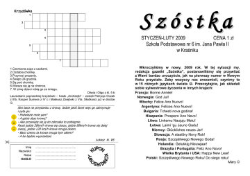 Krzyżówka Szóstka 1 2 3 STYCZEŃ-LUTY 2009 CENA 1 zł Szkoła Podstawowa nr 6 im. Jana Pawła II w Kraśniku 4 5 6 7 1.Czerwona zupa z uszkami. 2.Ozdabia choinkę. 3.Przynosi prezenty. 4.Święto 24 grudnia. 5.Są pod choinką. 6.Wiesza się ją na choince. 7. W zimę dzieci robią go ze śniegu. Oliwia i Olga z kl. 5 b Laureatami poprzedniej krzyżówki – hasło „Andrzejki” – zostali Patrycja Oczak z IIIb, Kacper Sumera z IV c i Mateusz Zarębski z VIa. Słodkości już w drodze . Stoi baca na przystanku z krową. Jedzie jakiś facet więc go zatrzymuje i pyta go: - Podwiezie mnie pan? - A gdzie dasz krowę? - Aaa przywiążę się ją do zderzaka to pobiegnie. Facet jedzie 20km/h krowa się cieszy, jedzie 80km/h krowa się dalej cieszy, jedzie 120 km/h krowa mruga okiem. - Baco czemu ta krowa mruga tym okiem? - A bo będzie wyprzedzać. Łukasz kl. VB Imię Nazwisko Klasa HASŁO ................................................. ................................................. ................................................. ................................................. Wkroczyliśmy w nowy, 2009 rok. W tej sytuacji my, redakcja gazetki „Szóstka”, postanowiliśmy się przywitać z Wami bardzo uroczyście, jak na pierwszy numer w Nowym Roku przystało. Żeby wszyscy nas zrozumieli, czynimy to w 15 różnych językach świata . Przeczytajcie, jak składali sobie sylwestrowe życzenia w innych krajach: Francja: Bonne Année! Norwegia: God Jul! Włochy: Felice Ano Nuovo! Argentyna: Felices Ano Nuevo! Bułgaria: Tchesti nova godina! Hiszpania: Prospero Ano Nevo! Litwa: Linkemu Naujuju Metu! Łotwa: Laimi ‘gu Jauno Gadu! Niemcy: Glückliches neues Jar! Słowacja: A stastlivy Novy Rok! Rosja: Szczęśliwego Nowego Goda! Holandia: Gelukkig Nieuwjaar! Brazylia i Portugalia: Feliz Ano Novo! Wielka Brytania i USA: Happy New Lear! Polski: Szczęśliwego Nowego Roku/ Do siego roku! Mary Jasełka To warto obejrzeć Uczniowie klasy III a pod opieką Pani Teresy Błaszczyk oraz Marzeny Babisz, przygotowali jasełka. Zostały one przestawione na wigilii nauczycieli oraz dla rodziców i uczniów. Dzieci bardzo wczuwały się w swoje role i grały je wspaniale. Widzowie nagrodzili występ gorącymi brawami. Rozmowa przeprowadzona z aniołkiem. Wiemy, że jesteś aniołkiem ale zdradź nam swoje imię. Nazywam się Zuzia Lebowa. Jesteś zadowolona ze swojej roli czy może marzyłaś o innej ? Tak jestem zadowolona, zawsze marzyłam o roli aniołka. Jak myślisz, czy jasełka podobały się innym? Według mnie jasełka były ładne i podobały się. Czy w następnym roku też chciałabyś wystąpić jasełkach i jaką role byś chciała grać ? Z wielką chęcią wzięłabym w nich udział i tym razem chciałabym grać Maryję. Olcia z VIc Kolegium redakcyjne: Kilka fajnych osób z klas IVb, VIa, Va i Vc Pan Paweł Szymański (opieka literacka) Pani Joanna Cybulak (opieka graficzno–techniczna) Kilka miesięcy temu w polskich kinach pokazał się film wytwórni Walta Disneya „Piorun”. Tytuł tu akurat odnosi się do słodkiego psiaczka o takim właśnie imieniu. On wraz ze swoimi wiernymi przyjaciółmi: bezdomną kotką i szalonym chomikiem zabawiają telewidzów swoim…życiem. Taki niewinny piesek, ze znamieniem w kształcie pioruna, myśli, że posiada niezwykłe moce. Niestety tak nie jest. Planuje jednak zmienić świat i przemierza pełną niespodzianek drogę do Hollywood. Czy mu się to uda – obejrzyjcie sami. Film jest już dostępny na płytach DVD. Katie To warto przeczytać Tym razem mamy dla Was dwie propozycje książek. Pierwsza z nich to „Tunele” autorstwa B.Cunningham. Głównym bohaterem książki jest czternastoletni chłopiec - Will Burrows, który wraz z rodzicami oraz siostrą Rebeką mieszka w małym miasteczku Highfield pod Londynem. Najlepiej dogaduje się z tatą, zapalonym archeologiem, z którym łączy go pasja do wykopalisk i poszukiwania niesamowitych skarbów. Gdy dr Burrows nagle znika w gęstej sieci tuneli, Will i jego przyjaciel Chester wyruszają w niebezpieczną i ekscytującą podróż do podziemnego świata, aby mu pomóc. Druga książka to „Szkoła dla blondynek”. Annisa ma poważny problem – w nowej szkole na Florydzie wszystkie dziewczyny to blondynki. Poza nią samą, oczywiście. Niewłaściwy kolor włosów i skłonność do wpadania w kłopoty wcale nie pomagają nawiązać przyjaźni. Co najgorsze, nie pozwalają też spełnić marzenia o zostaniu cheerleaderką. Annisa się jednak nie poddaje i wprowadza niezłe zamieszanie… Książka nadaje się idealnie dla nastolatek, które borykają się z problemami wkraczania w dorosłe życie. Bohaterka przeżywa wiele wewnętrznych rozterek, które zmuszają młode czytelniczki do poważnego zastanowienia się nad własnym życiem, jego celem i wartościami. Fakty dziwne i ciekawe Ludzkie uszy i nos rosną przez całe życie. Błyskawica jest pięć razy gorętsza niż powierzchnia Słońca. Przeciętna góra lodowa osiąga ciężar 20 milionów ton. Mrówki nigdy nie śpią. Dokumentacja techniczna samolotu Jumbo Jet waży więcej niż sam samolot. Podczas lizania znaczka pocztowego wchłaniamy 1/10 kalorii. Czego się boimy? Psychologia zna wiele rodzajów fobii. Najbardziej znane to: klaustrofobia – lek przed zamkniętym pomieszczeniem, agorafobia – lek przed otwarta przestrzenią. Często boimy się jednak innych rzeczy lub czynności: colligafobia – lęk przed pakowaniem się discimedikofobia – lek przed badaniem przez studenta medycyny insistofobia – obawa przed parkowaniem własnego samochodu occuviafobia – obawa przed kontaktem wzrokowym z przechodniami na ulicy uxorfobia – lęk przed własną żoną paremusfobia – lęk przed słuchaniem muzyki pokolenia rodziców Muzyka Dalej zima, a gdy brak śniegu i trzeba „nudzić się” w domu, można posłuchać kilku fajnych piosenek. Oto moje propozycje: Miley Cyrus – I thought I lost you Patrycja Mar