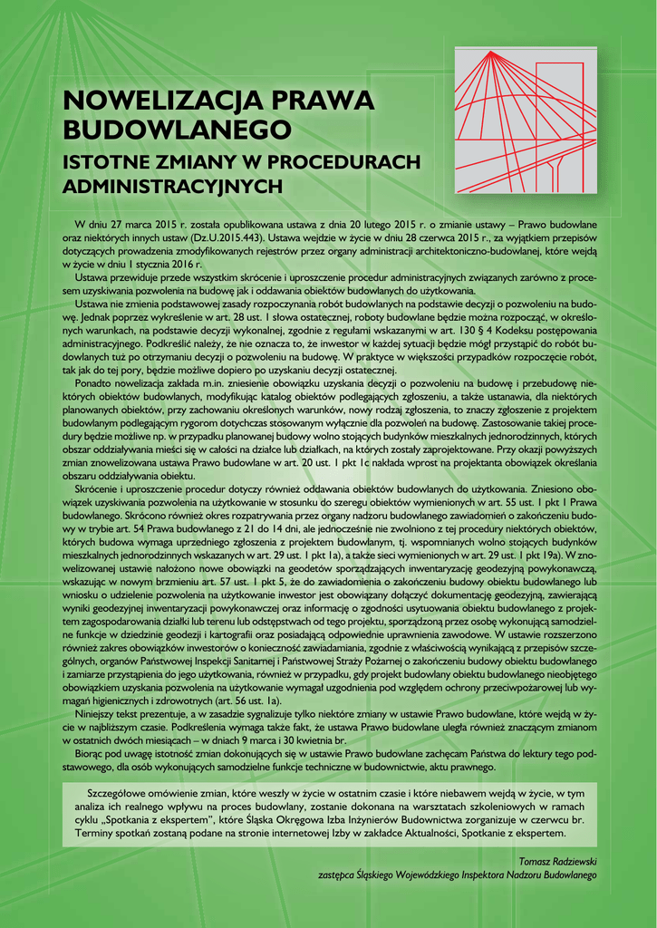 NOWELIZACJA PRAWA BUDOWLANEGO ISTOTNE ZMIANY W PROCEDURACH ADMINISTRACYJNYCH W dniu 27 marca 2015 r. została opublikowana ustawa z dnia 20 lutego 2015 r. o zmianie ustawy – Prawo budowlane oraz niektórych innych ustaw (Dz.U.2015.443). Ustawa wejdzie w życie w dniu 28 czerwca 2015 r., za wyjątkiem przepisów dotyczących prowadzenia zmodyfikowanych rejestrów przez organy administracji architektoniczno-budowlanej, które wejdą w życie w dniu 1 stycznia 2016 r. Ustawa przewiduje przede wszystkim skrócenie i uproszczenie procedur administracyjnych związanych zarówno z procesem uzyskiwania pozwolenia na budowę jak i oddawania obiektów budowlanych do użytkowania. Ustawa nie zmienia podstawowej zasady rozpoczynania robót budowlanych na podstawie decyzji o pozwoleniu na budowę. Jednak poprzez wykreślenie w art. 28 ust. 1 słowa ostatecznej, roboty budowlane będzie można rozpocząć, w określonych warunkach, na podstawie decyzji wykonalnej, zgodnie z regułami wskazanymi w art. 130 § 4 Kodeksu postępowania administracyjnego. Podkreślić należy, że nie oznacza to, że inwestor w każdej sytuacji będzie mógł przystąpić do robót budowlanych tuż po otrzymaniu decyzji o pozwoleniu na budowę. W praktyce w większości przypadków rozpoczęcie robót, tak jak do tej pory, będzie możliwe dopiero po uzyskaniu decyzji ostatecznej. Ponadto nowelizacja zakłada m.in. zniesienie obowiązku uzyskania decyzji o pozwoleniu na budowę i przebudowę niektórych obiektów budowlanych, modyfikując katalog obiektów podlegających zgłoszeniu, a także ustanawia, dla niektórych planowanych obiektów, przy zachowaniu określonych warunków, nowy rodzaj zgłoszenia, to znaczy zgłoszenie z projektem budowlanym podlegającym rygorom dotychczas stosowanym wyłącznie dla pozwoleń na budowę. Zastosowanie takiej procedury będzie możliwe np. w przypadku planowanej budowy wolno stojących budynków mieszkalnych jednorodzinnych, których obszar oddziaływania mieści się w całości na działce lub działkach, na których zostały zaprojektowane. Przy okazji powyższych zmian znowelizowana ustawa Prawo budowlane w art. 20 ust. 1 pkt 1c nakłada wprost na projektanta obowiązek określania obszaru oddziaływania obiektu. Skrócenie i uproszczenie procedur dotyczy również oddawania obiektów budowlanych do użytkowania. Zniesiono obowiązek uzyskiwania pozwolenia na użytkowanie w stosunku do szeregu obiektów wymienionych w art. 55 ust. 1 pkt 1 Prawa budowlanego. Skrócono również okres rozpatrywania przez organy nadzoru budowlanego zawiadomień o zakończeniu budowy w trybie art. 54 Prawa budowlanego z 21 do 14 dni, ale jednocześnie nie zwolniono z tej procedury niektórych obiektów, których budowa wymaga uprzedniego zgłoszenia z projektem budowlanym, tj. wspomnianych wolno stojących budynków mieszkalnych jednorodzinnych wskazanych w art. 29 ust. 1 pkt 1a), a także sieci wymienionych w art. 29 ust. 1 pkt 19a). W znowelizowanej ustawie nałożono nowe obowiązki na geodetów sporządzających inwentaryzację geodezyjną powykonawczą, wskazując w nowym brzmieniu art. 57 ust. 1 pkt 5, że do zawiadomienia o zakończeniu budowy obiektu budowlanego lub wniosku o udzielenie pozwolenia na użytkowanie inwestor jest obowiązany dołączyć dokumentację geodezyjną, zawierającą wyniki geodezyjnej inwentaryzacji powykonawczej oraz informację o zgodności usytuowania obiektu budowlanego z projektem zagospodarowania działki lub terenu lub odstępstwach od tego projektu, sporządzoną przez osobę wykonującą samodzielne funkcje w dziedzinie geodezji i kartografii oraz posiadającą odpowiednie uprawnienia zawodowe. W ustawie rozszerzono również zakres obowiązków inwestorów o konieczność zawiadamiania, zgodnie z właściwością wynikającą z przepisów szczególnych, organów Państwowej Inspekcji Sanitarnej i Państwowej Straży Pożarnej o zakończeniu budowy obiektu budowlanego i zamiarze przystąpienia do jego użytkowania, również w przypadku, gdy projekt budowlany obiektu budowlanego nieobjętego obowiązkiem uzyskania pozwolenia na użytkowanie wymagał uzgodnienia pod względem ochrony przeciwpożarowej lub wymagań higienicznych i zdrowotnych (art. 56 ust. 1a). Niniejszy tekst prezentuje, a w zasadzie sygnalizuje tylko niektóre zmiany w ustawie Prawo budowlane, które wejdą w życie w najbliższym czasie. Podkreślenia wymaga także fakt, że ustawa Prawo budowlane uległa również znaczącym zmianom w ostatnich dwóch miesiącach – w dniach 9 marca i 30 kwietnia br. Biorąc pod uwagę istotność zmian dokonujących się w ustawie Prawo budowlane zachęcam Państwa do lektury tego podstawowego, dla osób wykonujących samodzielne funkcje techniczne w budownictwie, aktu prawnego. Szczegółowe omówienie zmian, które weszły w życie w ostatnim czasie i które niebawem wejdą w życie, w tym analiza ich realnego wpływu na proces budowlany, zostanie dokonana na warsztatach szkoleniowych w ramach cyklu „Spotkania z ekspertem”, które Śląska Okręgowa Izba Inżynierów Budownictwa zorganizuje w czerwcu br. Terminy spotkań zostaną podane na stronie internetowej Izby w zakładce Aktualności, Spotkanie z ekspertem. Tomasz Radziewski zastępca Śląskiego Wojewódzkiego Inspektora Nadzoru Budowlanego
