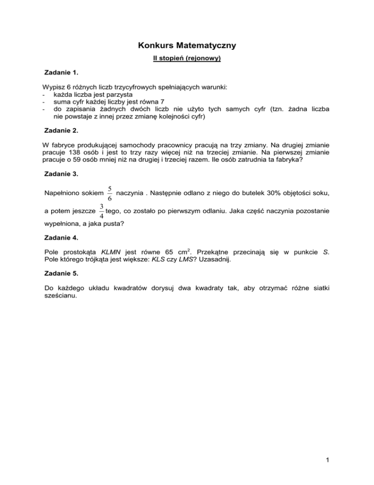 Konkurs Matematyczny II stopień (rejonowy) Zadanie 1. Wypisz 6 różnych liczb trzycyfrowych spełniających warunki: - każda liczba jest parzysta - suma cyfr każdej liczby jest równa 7 - do zapisania żadnych dwóch liczb nie użyto tych samych cyfr (tzn. żadna liczba nie powstaje z innej przez zmianę kolejności cyfr) Zadanie 2. W fabryce produkującej samochody pracownicy pracują na trzy zmiany. Na drugiej zmianie pracuje 138 osób i jest to trzy razy więcej niż na trzeciej zmianie. Na pierwszej zmianie pracuje o 59 osób mniej niż na drugiej i trzeciej razem. Ile osób zatrudnia ta fabryka? Zadanie 3. Napełniono sokiem a potem jeszcze 5 naczynia . Następnie odlano z niego do butelek 30% objętości soku, 6 3 tego, co zostało po pierwszym odlaniu. Jaka część naczynia pozostanie 4 wypełniona, a jaka pusta? Zadanie 4. Pole prostokąta KLMN jest równe 65 cm2. Przekątne przecinają się w punkcie S. Pole którego trójkąta jest większe: KLS czy LMS? Uzasadnij. Zadanie 5. Do każdego układu kwadratów dorysuj dwa kwadraty tak, aby otrzymać różne siatki sześcianu. 1 2 III stopień (wojewódzki) Zadanie 1. Średnia arytmetyczna trzech liczb jest równa 13. Co to za liczby, jeżeli wiadomo, że pierwsza z nich jest o 4 większa od drugiej, a trzecia stanowi połowę drugiej liczby? Zadanie 2. Ojciec, syn i córka zakupili dużą działkę i podzielili ją na trzy części. Ojciec wziął 40 % całej działki, syn 5 reszty, a córka otrzymała pozostałość równą 120 a. Jaką część całej działki 6 wzięła córka ? Ile hektarów miała cała działka? Kto otrzymał największą część działki? Zadanie 3. Obwód czworokąta ABCD jest równy 42 cm. Przekątna AC dzieli ten czworokąt na trójkąty o obwodach 28 cm i 26 cm. Jaką długość ma przekątna AC? Zadanie 4. Ile wynosi pole trójkąta HBC (rys.), jeżeli pole trójkąta AGD równe jest 4 cm2, pole trójkąta GHF równe jest 13 cm2, pole trójkąta DGF równe jest 6 cm2, a pole trójkąta FHC równe jest 17 cm2. A H Zadanie 5. Szklaną szkatułkę wypełniono jednakowymi sześciennymi nieprzezroczystymi kostkami. Wzdłuż każdej krawędzi szkatułki układano 4 kostki. Ilu kostek nie można zobaczyć przez ścianki szkatułki? Odpowiedź uzasadnij. 3