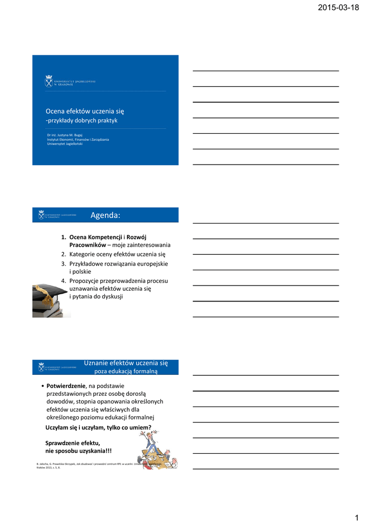 2015-03-18 Ocena efektów uczenia się -przykłady dobrych praktyk Dr inż. Justyna M. Bugaj Instytut Ekonomii, Finansów i Zarządzania Uniwersytet Jagielloński Agenda: 1. Ocena Kompetencji i Rozwój Pracowników – moje zainteresowania 2. Kategorie oceny efektów uczenia się 3. Przykładowe rozwiązania europejskie i polskie 4. Propozycje przeprowadzenia procesu uznawania efektów uczenia się i pytania do dyskusji Uznanie efektów uczenia się poza edukacją formalną • Potwierdzenie, na podstawie przedstawionych przez osobę dorosłą dowodów, stopnia opanowania określonych efektów uczenia się właściwych dla określonego poziomu edukacji formalnej Uczyłam się i uczyłam, tylko co umiem? Sprawdzenie efektu, nie sposobu uzyskania!!! B. Jałocha, G. Prawelska-Skrzypek, Jak zbudować i prowadzić centrum RPL w uczelni. Uniwersytet Jagielloński. Kraków 2013, s. 5, 8. 1 2015-03-18 Uczenie się • Pozaformalne instytucjonalnie poza programami kształcenia (np. szkolenia, kursy prowadzone przez znane ośrodki z wysoką jakością świadczenia usług) • Nieformalne -niezorganizowane instytucjonalnie, formy realizowane w sposób zamierzony lub niezamierzony • Incydentalne … A. Kraśniewski Dlaczego szkoła wyższa powinna włączać uczenie się przez całe życie (Lifelong Learning) do swojej misji i strategii, prezentacja wygłoszona podczas . Seminarium bolońskiego, UMK w Toruniu, 5 kwietnia 2013 Kategorie oceny efektów kształcenia prosto Wiedza Umiejętności Kompetencje społeczne trudno Ocena wiedzy • Dokument potwierdzający uzyskanie/posiadanie określonego poziomu wiedzy (np. certyfikat językowy, dyplom, świadectwo, inne…) Posiadane efekty Opinia??? Rekomendacja??? Doświadczenie??? kształcenia • Sprawdzenie: egzamin testowy lub problemowy, rozmowa weryfikującosprawdzająca 2 2015-03-18 Ocena umiejętności i kompetencji społecznych • Dokument potwierdzający uzyskanie/posiadanie określonego poziomu umiejętności i/ lub kompetencji społecznych Posiadane efekty Opinia??? Rekomendacja??? kształcenia • Sprawdzenie: rozmowa weryfikująca, prośba o przygotowanie analizy przypadku (w tym testy sytuacyjne, zadaniowe), egzamin ustny, symulacja, obserwacja, esej, wystąpienie publiczne (w tym prezentacja multimedialna), inne Praktyki europejskie • Niezależne/ zależne od systemu formalnego • Inne rozumienie procesu: – Walidacja w kształceniu formalnym, na potrzeby dalszej edukacji, wynikająca z potrzeb osobistych, zawodowych uczącego się, nie prowadząca do nadania kwalifikacji – Walidacja prowadząca do nadania kwalifikacji pełnych lub cząstkowych bez potrzeby uczestniczenia w formalnym procesie kształcenia • Różny poziom zaawansowania (od Francji, krajów Norweskich, Anglię i Niemcy, po Polskę) D. Piotrowska, T. Saryusz-Wolski , „Krajowe Ramy Kwalifikacji – zmiana sposobu kształcenia” Walidacja i weryfikacja efektów uczenia się oraz dobór właściwych metod kształcenia , POLITECHNIKA ŁÓDZKA SEMINARIUM BOLOŃSKIE „ZMIANY W KSZTAŁCENIU NA POLSKICH UCZELNIACH” Łódź, 25 listopada 2013 r. Uniwersytet Łódzki Wybrane praktyki europejskie • Francja: Prawo każdego obywatela uwzględnianie doświadczenia zawodowego, krótkich kursów wewnątrz-organizacyjnych w procesie uzyskania Kraje z dominującym systemem centralnym dyplomu w systemie formalnym, ułatwienie korzystania z kształcenia formalnego bez dodatkowych wymogów wstępnych Kraje z dominującymi praktykami lokalnymi • Hiszpania: Egzaminy weryfikujące posiadanie kompetencji (w np. dla osób nie posiadających wykształcenia średniego) (pod red.) G. Prawelska-Skrzypek, B.Jałocha, Uznawanie efektów uczenia się nabytych poza edukacją formalną (RPL) w szkolnictwie wyższym –wyzwania projektowania systemu, Institute for the Development of Education, Zagreb, Croatia, 2013 3 2015-03-18 Praktyki polskie: • Przykłady – Zdanie egzaminów w trybie eksternistycznym – Zaliczenie efektów kształcenia przypisanych do przedmiotów na podstawie przedstawionych dokumentów (certyfikatów, dyplomów, itd.… była mowa wcześniej) – Centra uznawania efektów zdobytych poza kształceniem formalnym – np. Uniwersytet Ekonomiczny we Wrocławiu jasne zasady, regulamin, sprawdzenie efektów do przedmiotów Zalety dla studentów: • Oszczędność czasu i (czasem) pieniędzy (możliwość pracy i studiowania), poprzez uczestnictwo w mniejszej liczbie zajęć, mniejszej intensywności zajęć, skrócenie czasu studiowania… • Wsparcie kariery zawodowej: nabywanie doświadczenie i rozwój zgodny z zainteresowaniami, motywacja do rozwoju • Potwierdzenie posiadanych efektów uzyskanych w inny sposób (w czasie pracy, w wolnym czasie) • umożliwienie mobilności zawodowej i edukacyjnej, zabezpieczenie dalszej kariery zawodowej Dla uczelni: • Rozwój kluczowych kompetencji będących przewagą konkurencyjną uczelni – – – – Współpraca z pracodawcami Posiadanie nowych kandydatów na studentów Dodatkowe źródło finansowania Utrzymanie liczby zatrudnionych • Rozwój uczelni • Zmuszenie do zmiany podejścia do kształcenia zdobytego poza murami uczelni 4 2015-03-18 Role w procesie uznawania • • • • administracyjne (Koordynator RPL) administracyjno-nadzorcze (Komitet RPL) doradcze (Doradca RPL) naukowo-dydaktyczne (Asesor) B. Jałocha, Uznawanie efektów uczenia się zdobytych poza edukacją formalną (Recognition of Prior Learning) Uniwersytet Jagielloński Warszawa, 22 maja 2013, slajd 15 SCHEMAT PROCESU Osoby odpowiedzialne Koordynator Identyfikacja obszarów kształcenia Identyfikacja przedmiotów i/lub programów kształcenia Pracownik administracyjny??? Koordynator + Doradca Ekspert w obszarze Przygotowanie wniosku Ocena wniosku Decyzja dotycząca wniosku RPL Doradca Asesor Specjalista w obszarze Uczelniana Komisja Organ powołany przez rektora B. Jałocha, G. Prawelska-Skrzypek, Uznawanie efektów uczenia się nabytych poza
