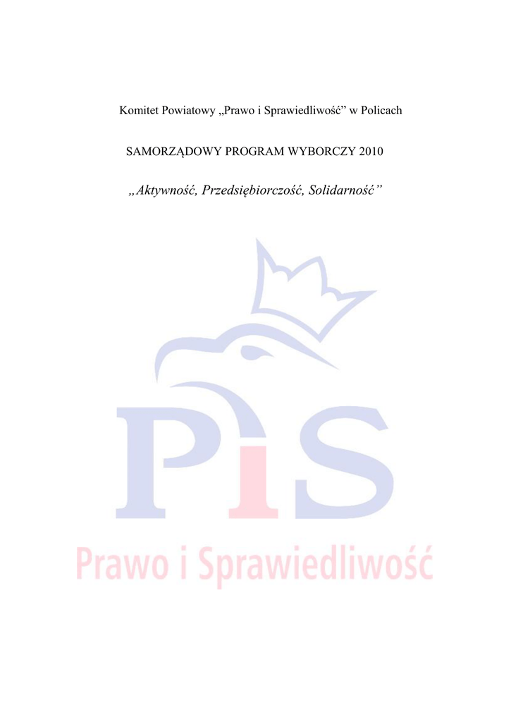 Komitet Powiatowy „Prawo i Sprawiedliwość” w Policach SAMORZĄDOWY PROGRAM WYBORCZY 2010 „Aktywność, Przedsiębiorczość, Solidarność” Drodzy mieszkańcy Polic, Przez ostatnie cztery lata wiele się w naszej małej ojczyźnie wydarzyło. W łonie rządzącej Policami przez pierwsze trzy lata kadencji samorządu koalicji Gryf-PO dochodziło do wzajemnych waśni i nieporozumień. Powstałe napięcia urosły w końcu do rozmiarów lokalnej wojny politycznej, która wyrażała się w brutalnych atakach personalnych (w sposób szczególny kierowanych wobec osoby Burmistrza Polic) oraz obustronnych oskarżeniach - co w końcu doprowadziło do zerwania koalicji w polickim samorządzie. W tamtym gorącym okresie politycznym „Prawo i Sprawiedliwość” apelowało do obu walczących stron o rozsądek i znalezienie kompromisu dla dobra mieszkańców Polic. Ostrzegaliśmy, że przedłużający się stan niepewności i braku stabilności, może doprowadzić nawet do rozwiązania struktur samorządowych naszej gminy i wprowadzenia zarządu komisarycznego. Nasze ugrupowanie, świadome tego zagrożenia oraz wiedzione poczuciem odpowiedzialności za stan spraw polickich, zdecydowało się zawiązać koalicję rozsądku ze Wspólnotą Samorządową „Gryf”. Ostatnie siedem miesięcy, wolne od dramatycznych wydarzeń politycznych pokazało, że Prawo i Sprawiedliwość wraz z „Gryfem” potrafią skutecznie i zgodnie współrządzić Policami. W odróżnieniu od naszych bezpośrednich rywali politycznych nie wyciągamy z szafy kwitów na nikogo. Wolimy za to pochylić się nad problemami ludzi i rozwiązywać je dla dobra nas wszystkich, obywateli Polic. W ostatnim czasie, szczególnych powodów do obaw, dostarcza sytuacja największego polickiego pracodawcy, czyli Zakładów Chemicznych Police S.A. Jest to jeden z priorytetów, oprócz poprawy stanu bezpieczeństwa w Policach, na którym chcemy się skupić w czasie najbliższej kadencji polickiego samorządu. Poniżej prezentujemy Państwu owoc naszych przemyśleń na temat programu dla Polic. To katalog spraw i problemów, których realizacja w ciągu najbliższych czterech lat, przyczyni się do poprawy sytuacji nas wszystkich. Wyrażamy nadzieję, że znajdzie on w Państwa oczach uznanie i przekona, że warto powierzyć nam mandat do współrządzenia Policami także i w kolejnej kadencji. Z wyrazami szacunku Zarząd Powiatowy PiS Wprowadzenie Gmina Police powinna jeszcze skuteczniej i aktywniej zabiegać, aby osiągnąć miano prymusa wśród samorządów lokalnych. Zadanie to wymaga stworzenia precyzyjnego, długofalowego planu działania, który uwzględniałby specyfikę naszej małej ojczyzny. Prawo i Sprawiedliwość taki plan stworzyło opierając się na przyświecającej nam zasadzie zrównoważonego rozwoju, którą można podsumować następującym zdaniem: "Małe miasto, mała gmina jest równie ważne jak duża metropolia czy województwo". Rozdział I Skuteczna polityka poprawy stanu bezpieczeństwa w Policach, czyli podjęcie działań mających na celu wydatne ograniczenie liczby wykroczeń, przestępstw i innych patologii społecznych Podejmiemy skuteczną walkę z codziennym zjawiskiem chuligaństwa w szkołach, środkach komunikacji i na ulicach. Zapewnimy monitorowanie wiat przystankowych i patrolowanie w godzinach wieczornych autobusów kursujących pomiędzy Policami i Szczecinem. Wprowadzimy zasadę „zero tolerancji dla przestępstw” przeciwko mieniu i życiu mieszkańców. Podejmiemy współpracę z mieszkańcami Polic i odpowiedzialnymi służbami w celu skutecznego wdrożenia programu „Bezpieczne Police” - dla poprawy stanu bezpieczeństwa w naszym mieście. Zdynamizujemy realizację programu „Bezpieczna szkoła” starając się powstrzymać falę agresji wśród młodzieży oraz zagrożenie alkoholizmem i narkomanią. Rozdział II Solidarna polityka społeczna, czyli propagowanie działań mających na celu poprawę opieki zdrowotnej i rozwój pomocy społecznej Zwiększymy zakres przeprowadzanych programów profilaktycznych z zakresu ochrony zdrowia na terenie gminy. Przeprowadzimy działania mające na celu przełamywanie barier dostępowych dla osób niepełnosprawnych na terenie gminy. Podejmiemy starania mające na celu zapewnienie szerokiej opieki pielęgniarskiej świadczonej w domach. Rozwiniemy współpracę z organizacjami pozarządowymi i stowarzyszeniami w zakresie rehabilitacji medycznej. Będziemy propagować rozwój profilaktyki zdrowotnej w szkołach, a w szczególności opieki stomatologicznej. Będziemy wspierać wolontariat w sektorze publicznej opieki społecznej i spośród niego rekrutować pracowników do samorządowych placówek opieki społecznej. Będziemy poszukiwać możliwości wprowadzenia rozwiązań mających na celu wsparcie młodych rodzin planujących posiadanie potomstwa. Udzielimy pomocy zainteresowanym organizacjom społecznym i biznesowym w utworzeniu Zakładu Aktywności Zawodowej, w którym znajdą zatrudnienie osoby niepełnosprawne. Wprowadzimy program stałego monitorowania jakości wody pitnej dla Polic oraz umieścimy aktualne informacje na ten temat na stronie internetowej ZWIK oraz doprowadzimy do uszczelnienia systemu kontroli w celu eliminacji nielegalnych praktyk poboru wody. Wprowadzimy przejrzystą politykę wywozu stałych odpadów komunalnych z obszarów podmiejskich i wiejskich, tak aby wyeliminować proceder nielegalnego ich wywożenia do lasu. Rozdział III Aktywna polityka wspierania rozwoju gospodarczego, czyli Police przykładem sprawnie funkcjonującej prospołecznej gospodarki rynkowej Ograniczymy bariery administracyjne i biurokratyczne dławiące rozwój lokalnej przedsiębiorczości. Podejmiemy działania wspierające przedsiębiorców tworzących nowe miejsca pracy. Jednym z głównych priorytetów naszych działań uczynimy ograniczenie bezrobocia, stabilizację zatrudnienia oraz dynamiczne zagospodarowanie przestrzeni i st