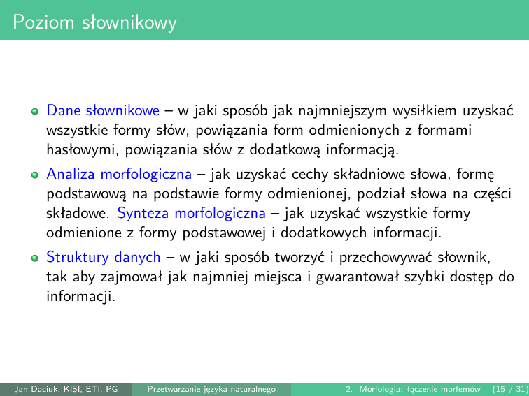 Poziom słownikowy Dane słownikowe – w jaki sposób jak najmniejszym wysiłkiem uzyskać wszystkie formy słów, powiązania form odmienionych z formami hasłowymi, powiązania słów z dodatkową informacją. Analiza morfologiczna – jak uzyskać cechy składniowe słowa, formę podstawową na podstawie formy odmienionej, podział słowa na części składowe. Synteza morfologiczna – jak uzyskać wszystkie formy odmienione z formy podstawowej i dodatkowych informacji. Struktury danych – w jaki sposób tworzyć i przechowywać słownik, tak aby zajmował jak najmniej miejsca i gwarantował szybki dostęp do informacji. Jan Daciuk, KISI, ETI, PG Przetwarzanie języka naturalnego 2. Morfologia: łączenie morfemów (15 / 31) Morfemy (1/2) Morfem jest (w uproszczeniu) elementem składowym słowa. Wyróżniamy morfemy swobodne i morfemy związane. Morfem swobodny może wystąpić samodzielnie, nie w połączeniu z innymi morfemami. Morfem związany nie ma tej właściwości. Rdzeń to podstawowy morfem wyrazu, do którego mogą być dołączane morfemy afiksalne (afiksy), zarówno fleksyjne, jak i słowotwórcze. Rdzeń jest morfemem leksykalnym. Przykład: dodatkowy. Temat wyrazu to ta część wyrazu, która pozostaje po usunięcie afiksów fleksyjnych. Jest nośnikiem znaczenia wyrazu. Nie musi być pojedynczym morfemem. Przykład: dodatkowy. Jan Daciuk, KISI, ETI, PG Przetwarzanie języka naturalnego 2. Morfologia: łączenie morfemów (16 / 31) Morfemy (2/2) Afiksy to morfemy związane niosące funkcje gramatyczne. Dzielą się na przedrostki, przyrostki i wrostki, czasami wyróżnia się też postfiksy (zarostki?). Istnieją też morfemy nieciągłe, dołączane jednocześnie na początku i końcu wyrazu (obrostki?). Morfem zerowy niesie jedynie informację gramatyczną, natomiast nie posiada reprezentacji tekstowej. Np. mianownik liczby pojedynczej wyrazu słoń może być przeanalizowany jako słoń+∅, czyli temat słoń i morfem zerowy. Jan Daciuk, KISI, ETI, PG Przetwarzanie języka naturalnego 2. Morfologia: łączenie morfemów (17 / 31) Morfologiczne typy języków Języki izolujące nie posiadają form związanych, które mogą być dołączane do słowa. W językach aglutynacyjnych poszczególne formy związane występują i są układane w słowie jak paciorki różańca; jedna forma związana reprezentuje pojedynczą cechę. W językach fleksyjnych wiele różnych cech jest reprezentowanych przez pojedynczą formę związaną lub ściśle powiązane ze sobą formy związane. W językach polisyntetycznych pewne elementy, które w innych językach pojawiają się osobno, jak np. dopełnienie, są wyrażane za pomocą środków morfologicznych. Jan Daciuk, KISI, ETI, PG Przetwarzanie języka naturalnego 2. Morfologia: łączenie morfemów (18 / 31) Morfologia fleksyjna i derywacyjna W morfologii fleksyjnej opisujemy różne formy tego samego samego słowa – leksemu. Zbiór wszystkich form odmienionych opisuje wzór odmiany lub paradygmat danego słowa. Formy odmienione reprezentują tę samą część mowy co wyraz hasłowy, mają to samo znaczenie, ale dostosowują wyraz do pełnienia innych funkcji składniowych. Morfologia derywacyjna to inaczej słowotwórstwo. Na podstawie jednego leksemu otrzymujemy inny, najczęściej będący inną częścią mowy, o innym znaczeniu. Jan Daciuk, KISI, ETI, PG Przetwarzanie języka naturalnego 2. Morfologia: łączenie morfemów (19 / 31) Fleksja i słowotwórstwo – przykłady Fleksja: droga → drogi, drodze, drogę, drogi, dróg… drogi → drogiego… droga… drodzy… pies → psa, psu, psie, psy… pieszy → pieszego, pieszemu, pieszym, piesi… kochać → kocham, kochasz… kochałem… kochałabyś… Słowotwórstwo: pies → piesek, pieseczek, psi, pieski… kot → kotek, koteczek, kocię, koci, kocić się… kochać → kochanie, kochanek, kochanka, kochliwy… Jan Daciuk, KISI, ETI, PG Przetwarzanie języka naturalnego 2. Morfologia: łączenie morfemów (20 / 31) Łączenie morfemów – sklejanie Najprostszą i jednocześnie najpowszechniejszą formą łączenia morfemów jest sklejanie (ang. concatenation) — tekstowe przyłączanie morfemu (przyrostka) na końcu lub (przedrostka) na początku wyrazu. Rzadszą formą jest dołączanie morfemu w środku wyrazu. Operacja ta podlega różnym ograniczeniom i bywa traktowana jako forma dołączania przedrostka przy pominięciu pewnych początkowych elementów wyrazu, jak np. pierwszej spógłoski, pierwszej sylaby, pierwszej sylaby nieakcentowanej itp. Jan Daciuk, KISI, ETI, PG Przetwarzanie języka naturalnego 2. Morfologia: łączenie morfemów (21 / 31) Łączenie morfemów – inne formy W językach semickich temat czasowników jest wzorcem składającym się z rdzenia (na ogół trzech spółgłosek), wzorca samogłosek (informującego o stronie i aspekcie) i wzorca słowotwórczego (określającego klasę). Np. ktb oznacza pisać. W stronie czynnej wzór samogłosek zawiera A, więc słowo to w stronie czynnej dla wzorca słowotwórczego CVCVC (forma podstawowa) brzmi k At Ab, zaś w stronie biernej wzór samogłosek ma postać UI, a samo słowo – k Ut Ib. Wzorzec słowotwórczy CVVCVC prowadzi do słowa korespondować: dla strony czynnej – k AAt Ab, biernej – k UUt Ib. Jan Daciuk, KISI, ETI, PG Przetwarzanie języka naturalnego 2. Morfologia: łączenie morfemów (22 / 31) Łączenie morfemów – ograniczenia (1/2) Nie każdy afiks łączy się z każdym słowem w dowolnym miejscu. Ograniczenia mogą dotyczyć części mowy, przypadka i innych cech gramatycznych, a także cech wymowy i znaczenia. Do opisu ograniczeń można użyć różnych sposobów, np. klas kontynuacji. Najprostsze wydaje się użycie unifikacji. Przykład (przysłówki w stopniu równym) w programie mmorph: adv_pos : adv[deg=pos advs=$advs form=surface] ← a[deg=pos form=stem advs=$advs par_a!=no] advsuf[deg=pos advs=$advs] Jan Daciuk, KISI, ETI, PG Przetwarzanie języka n