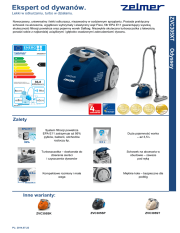 Ekspert od dywanów. Lekki w odkurzaniu, turbo w działaniu. ZVC305XT Nowoczesny, uniwersalny i lekki odkurzacz, niezawodny w codziennym sprzątaniu. Posiada praktyczny schowek na akcesoria, wyjątkowo wytrzymały i elastyczny wąż Flexi, filtr EPA E11 gwarantujący wysoką skuteczność filtracji powietrza oraz pojemny worek Safbag. Niezwykle skuteczna turboszczotka z łatwością poradzi sobie z najbardziej uciążliwymi i głęboko osadzonymi zabrudzeniami dywanu. Odyssey Zalety System filtracji powietrza EPA E11 zatrzymuje aż 95% pyłków, bakterii, odchodów roztoczy itp. Duża pojemność worka – aż 3,5 L Turboszczotka – doskonała do zbierania sierści i czyszczenia dywanów Schowek na akcesoria w obudowie – zawsze pod ręką Kompaktowe rozmiary i mała waga Miękkie koła – bezpieczne dla podłóg Inne warianty: ZVC305SK PL: 2014.07.22 ZVC305SP ZVC305ST ZVC305XT Odyssey Specyfikacja techniczna klasa efektywności energetycznej klasa skuteczności zbierania kurzu z dywanu klasa skuteczności zbierania kurzu z twardej podłogi klasa reemisji kurzu poziom hałasu [dB] moc nominalna [W] zużycie energii [kWh/rok] waga netto (bez akcesoriów) [kg] wymiary (szerokość / głębokość / wysokość) [cm] okres gwarancji [miesiące] C D C A 78 950 36,8 4,3 30 / 32 / 38 48 Cechy rodzaj filtra zasięg pracy [m] miękkie gumowe kółka funkcja autostart wskaźnik wymiany worka pojemność worka na kurz [l] typ worka na kurz kolor regulacja mocy EAN EPA E11 9 + 3,5 Safbag ZVCA100B (niebieski) granatowy elektroniczna 5 900 215 025 780 Akcesoria w zestawie: Filtr EPA11 Metalowa rura teleskopowa z blokadą Duży worek na kurz typu Safbag Zestaw dodatkowych szczotek i ssawek Wytrzymały i elastyczny wąż Flexi Turboszczotka do dywanów Możliwość zastosowania: Turboszczotki ZVCA90T Szczotki do parkietów ZVCA80P Elektroszczotki ZVCA94Q + + - Przełączalna szczotka Silence Neo
