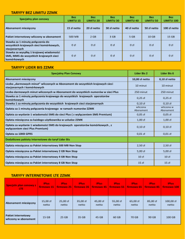 TARYFY BEZ LIMITU ZZMK Specjalny plan cenowy Abonament miesięczny Bez LIMITU 15 Bez LIMITU 20 Bez LIMITU 30 Bez LIMITU 40 Bez LIMITU 50 Bez LIMITU 100 15 zł netto 20 zł netto 30 zł netto 40 zł netto 50 zł netto 100 zł netto 500 MB 2 GB 3 GB 5 GB 10 GB 15 GB 0 zł 0 zł 0 zł 0 zł 0 zł 0 zł 0 zł 0 zł 0 zł 0 zł 0 zł 0 zł Pakiet internetowy wliczony w abonament Stawka za 1 minutę połączenia do wszystkich krajowych sieci komórkowych, stacjonarnych Stawka za wysyłkę 1 krajowej wiadomości SMS, MMS do wszystkich krajowych sieci komórkowych TARYFY LIDER BIS ZZMK Specjalny Plan Cenowy Abonament miesięczny Liczba „darmowych minut” wliczonych w Abonament do wszystkich krajowych sieci stacjonarnych i komórkowych Liczba darmowych minut wliczonych w Abonament do wszystkich numerów w sieci Plus Stawka za 1 minutę połączenia krajowego do wszystkich krajowych operatorów komórkowych Stawka 1 za minutę połączenia do wszystkich krajowych sieci stacjonarnych Lider Bis 2 Lider Bis 6 10,00 zł netto 0,10 zł netto 10 minut 10 minut 250 minut 250 minut 0,25 zł 0,25 zł 0,10 zł 0,10 zł wliczona Abonament wliczona w Abonament Opłata za wysłanie 1 wiadomości SMS do sieci Plus ( z wyłączeniem SMS Premium) 0,05 zł 0,05 zł Opłata miesięczna za każdego użytkownika w usłudze ZZMK 1,00 zł 1,00 zł Opłata za wysłanie 1 wiadomości SMS do krajowych operatorów komórkowych , z wyłączeniem sieci Plus Premium) 0,10 zł 0,10 zł Opłata za 10KB GPRS 0,01 zł 0,01 zł Opłata miesięczna za Pakiet internetowy 500 MB Non Stop 2,50 zł 2,50 zł Opłata miesięczna za Pakiet internetowy 2 GB Non Stop 5,00 zł 5,00 zł Opłata miesięczna za Pakiet internetowy 4 GB Non Stop 10 zł 10 zł Opłata miesięczna za Pakiet internetowy 8 GB Non Stop 15 zł 15 zł Opłata za 1 minutę połączenia krajowego w ramach numerów ZZMK Dodatkowe pakiety internetowe do taryf Lider Bis TARYFY INTERNETOWE LTE ZZMK iPlus iPlus iPlus iPlus iPlus iPlus iPlus iPlus Specjaln plan cenowy z firmowo 15 firmowo 25 firmowo 35 firmowo 45 firmowo 55 firmowo 65 firmowo 85 firmowo 100 LTE Abonament miesięczny 15,00 zł netto 25,00 zł netto 35,00 zł netto 45,00 zł netto 55,00 zł netto 65,00 zł netto 85,00 zł netto 100,00 zł netto Pakiet internetowy wliczony w abonament 15 GB 25 GB 35 GB 45 GB 60 GB 70 GB 90 GB 100 GB