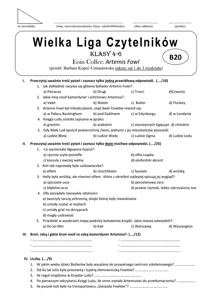 ………………………………………………………………….. nr zawodnika (imię, nazwisko/pseudonim, klasa, szkoła/biblioteka) ………………………. (data oddania) ……………………. (punkty) Wielka Liga Czytelników KLASY 4-6 Eoin Colfer: Artemis Fowl B20 (przekł. Barbara Kopeć-Umiastowska zakres: od 1 do 3 rozdziału) I. Przeczytaj uważnie treść pytań i zaznacz tylko jedną prawidłową odpowiedź. (…./10) 1. Jak dokładnie nazywa się główny bohater Artemis Fowl?: a) Pierwszy b) Drugi c) Trzeci d)Czwarty 2. Jakie imię nosił kamerdyner i ochroniarz Artemisa?: a) Valet b) Waiter c) Butler d) Flunkey 3. Artemis Fowl był Irlandczykiem, stąd dwór Fowlów mieścił się: a) w Pałacu Buckingham b) pod Dublinem c) w Edynburgu d) w Londynie 4. Księga Ludu została zapisana w języku: a) greckim b) arabskim c) starożytnych Egipcjan d) chińskim 5. Gdy Mały Lud opuścił powierzchnię Ziemi, jednymi z jej mieszkańców pozostali: a) Ludzie Błota b) Ludzie Wody c) Ludzie Ognia d) Ludzie Lodu II. Przeczytaj uważnie treść pytań i zaznacz tylko dwie możliwe odpowiedzi. (…./25) 1. Co wyróżniało Nguyena Xuana?: a) ręcznie szyte pantofle b) elfia czapka c) koszula z owczej wełny d) oksfordzki akcent 2. Kim tak naprawdę była uzdrawiaczka?: a) elfem b) chochlikiem c) faunem d) wróżką 3. Holly była wróżką, ale również elfem. Które z określeń najlepiej opisują jej wygląd?: a) spiczaste uszy b) porcelanowa cera c) błękitne oczy d) prawie rzymski, lekko zakrzywiony nos 4. Elfy posiadały niezwykle zdolności: a) tworzyły tarczę ochronną, dzięki której były niewidzialne b) umiały czytać w myślach c) umiały grać na skrzypcach d) mogły uzdrawiać 5. Prześledź w wyobraźni mapę podróży bohaterów książki. Jakie miasta odwiedzili?: a) Ho Szi Min b) Kair c) Warszawę d) Waszyngton III. Broń. Jaką i gdzie broń nosił ze sobą kamerdyner Artemisa?: (…./12) - ………………………………………………………… - ………………………………………………………… - ………………………………………………………… - ………………………………………………………… - ………………………………………………………… - ………………………………………………………… IV. Liczby. (…./9) 1. W jakim wieku dzieci Butlerów były wysyłane do prywatnego centrum szkoleniowego? …………………. 2. Od ilu lat Julia była pracowitą i lojalną domowniczką Fowlów? ………………………………. 3. Ile reguł znajdziesz w Księdze Ludu? ……………………………………………. 4. Po pierwszym odczytaniu Księgi Ludu, ile stron zostało Artemisowi do przetłumaczenia? ………………… 5. Ile puszek koli było na transportowcu „Gwiazda Fowlów”? …………………………………… 6. 7. 8. 9. Ile godzin spał Artemis po przetłumaczeniu całej Księgi? …………………………… Kapitan Bulwa musiał wymazać aż ……………………………….. pamięć, po nieudanej akcji Holly. Na skutek ataku trolla w zeszłym kwartale stracono ……………………… funkcjonariuszy. Do jakiego szybu wpadł troll? ………………… V. Rozwiąż krzyżówkę: (…./14) 1. Komendant Bulwa miał wybuchowy charakter, stąd jego przezwisko to… 2. Jaka grupa przybyła do włoskiej restauracji, w celu naprawienia szkód, po zakończonej akcji Holly? 3. Imię matki Artemisa . 4. „Napisana była po gnomicku, w ………… wróżek”. 5. Jakie imię miał faun, który na swej głowie 6. nosił czapkę z folii aluminiowej? 6. Holly… 1. 2. 3. 4. 5. Hasło: ………………………………………………….. VI. Korzystając ze słowników, leksykonów lub encyklopedii w wersji papierowej przetłumacz na język angielski oraz napisz tytuł książki, z której skorzystałeś (źródło): (…/6) 1. skarb - ……………………………… 2. skrzat - ………………………… Źródło: …………………………………………………………………………………………………….. VII. Korzystając ze słownika wyrazów bliskoznacznych, znajdź po dwa wyrazy bliskoznaczne oraz napisz tytuł książki, z której skorzystałeś (źródło)(…./10) 1. troll - …………………………………………………………….…………………………………………………………………………… 2. błoto - ……………………………………………………………………………………………………………………………………….. Źródło:…………………………………………………………………………………………………………….. VIII. Rozwiąż zadanie matematyczne: (…./6) Holly liczyła sobie równo metr wzrostu, do elfiej średniej zabrakło jej zaledwie centymetra. Oblicz ile wynosi średnia wzrostu elfów? Pamiętaj, że 1m = 100 cm. Działanie: ……………………………………………………………………………………………………………………………………………….. Odpowiedź: ……………………………………………………………………………………………………………………………………………. IX. Zadanie historyczne (…./6) „Tajemniczy znak zdradzał niezwykłe podobieństwo do wyobrażeń boga Anubisa, znajdujących się wśród hieroglifów odkrytych w wewnętrznym grobowcu Tutenchamona.” W jakim kraju i niedaleko jakiego miasta, można znaleźć grobowiec Tutenchamona ? ………………………………………………………………………………………………………………………………………………………… ……………………………………………………………………………………………………………