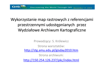 Wykorzystanie map rastrowych z referencjami przestrzennymi udostępnianych przez Wydziałowe Archiwum Kartograficzne Prowadzący: S. Królewicz Strona warsztatów: http://ztg.amu.edu.pl/gisday2010.htm Strona archiwum: http://150.254.126.237/pkc/index.html Formy dostępu do danych cyfrowych • Udostępnienie mapy rastrowej z nadanymi referencjami przestrzennymi (wszystkie dane rastrowe przekształcone do układu 92) : – obraz rastrowy w formacie geotiffa – obraz rastrowy w formacie geotiffa z dodatkowymi współrzędnymi (MapInfo, KML, ArcInfo, txg, …) Mapy takie mogą być wykorzystane jako podkłady lub materiały porównawcze w różnych aplikacjach GIS • Przeglądanie poprzez popularne przeglądarki map i zdjęć satelitarnych (Google, Bing, OpenStreet, OpenLayers); • Przeglądanie map, wykorzystanie jako podkładów z referencjami przestrzennymi, udostępnianych poprzez protokół WMS, TMS w systemach GIS i przeglądarkach danych przestrzennych Ćwiczenie I – wykorzystanie mapy ze współrzędnymi KML w GoogleEarth Mapę taką otrzymać można w mapiarni poprzez tzw. Udostępnienie, które w praktyce sprowadza się do nagrania map na nośnik magnetyczny. Mapa taka jest udostępniana na specjalne życzenie – prosicie o arkusz mapy postaci geotiff’a z dodatkowymi współrzędnymi (katalogi z końcówką GISREF). Wśród tych współrzędnych są dostępne współrzędne w formacie txg, prj, tfw, kml, tab. Przykłady takich danych są dostępne na stronie internetowej dzisiejszych warsztatów; proszę ściągnąć dane do ćwiczenia pierwszego i zachować je na pulpicie. Dysponując danymi przestrzennymi ze współrzędnymi w formacie KML, można je lokalnie otworzyć w przeglądarce GoogleEarth. Aby to wykonać należy: 1) Uruchomić program GoogleEarth. 2) Z menu programu wybieramy polecenie Plik/Otwórz, 3) Mapa zostanie otwarta w przeglądarce (zrzut ekranu na następnym slajdzie. Rastrowe mapy są udostępniane za pomocą technologii takich jak WMS lub TMS. WMS (Web Map Service) polega na przesłaniu zapytania w postaci współrzędnych ograniczających dany obszar z przeglądarki klienta do serwera, gdzie ma miejsce wycięcie określonego fragmentu mapy, a następnie wysłanie wynikowej mapy do przeglądarki klienta. W przypadku TMS (Tile Map Service) wysłanie zapytania ze strony przeglądarki do serwera powoduje przesłanie do klienta odpowiednich kafelków, tworzących wynikową mapę. RóŜnica między obiema technologiami polega więc na formie przechowywania mapy na serwerze i sposobie obsługi zapytania wysyłanego przez uŜytkownika. Mianem kafelków (ang. tiles) określa się pliki graficzne o konkretnym rozmiarze (np. 256x256px). Mapy przeglądane są w róŜnych skalach, dlatego mapa jest przygotowywana w wielu wersjach, kaŜda kolejna w niŜszej rozdzielczości. Tworzy to piramidalną strukturę - na jej dole znajduje się wersja mapy o najwyŜszej rozdzielczości, a na górze o najniŜszej. Najczęściej, oba sposoby wymagają instalacji na serwerze odpowiedniego oprogramowania - komercyjnego (ArcIMS, TNTServer) lub bezpłatnego (MapServer, GeoServer). DuŜo tańszym i prostszym sposobem jest udostępnianie map w standardowych strukturach kafelków, takich jak Google Maps, Google Earth, Microsoft Bing czy NASA WorldWind i wykorzystywanie do przygotowania strony WWW interfejsu API (Application Programming Interface) udostępnianego przez poszczególne firmy. Przygotowanie strony internetowej opiera się wówczas na wykorzystaniu standardowego i bezpłatnego oprogramowania do udostępnienia informacji poprzez WWW (np. Apache Server). Dodatkowo moŜna udostępniać mapy na tle obrazów czy map udostępnianych przez Google czy Microsoft. Za jej pośrednictwem moŜna przeglądać niektóre mapy znajdujące się w zasobach Archiwum Kartograficznego WNGIG UAM. Lokalizacja zasobów na komputerach Pracowni Kartografii Cyfrowej skraca do minimum czas potrzebny na przesłanie danych i uniezaleŜnia dostęp do map od serwerów zewnętrznych. Ćwiczenie II – przeglądanie map ze strony Archiwum Kartograficznego Proszę wejść na stronę internetową archiwum Kartograficznego (adres na stronie tytułowej prezentacji), z górnego paska wybrać „Mapy topograficzne”. Wybrana strona znajduje się na następnym slajdzie. Na samej górze strony znajduje się link z prostą instrukcją jak i co można zrobić za pomocą prostej przeglądarki opartej GoogleMaps. Proszę ją przejrzeć, następnie proszę kliknąć na link do mapy 1:10000 województwa świętokrzyskiego. W ramach przeglądania proszę postarać się znaleźć miejsce, w którym jeden ze zmontowanych arkuszy miał błędnie nadane referencje przestrzenne (patrząc na zmontowaną mapę w dużym zmniejszeniu można zaobserwować nieciągłość treści, aczkolwiek nie jest to proste ☺ ). Przeglądając tak przygotowane mapy można się zorientować, z jakich obszarów nie mam map w naszym Archiwum. Dla ilustracji tego faktu proszę sobie kliknąć na link do map y 1:10000 w układzie 65 dla województwa kujawskopomorskiego. Ćwiczenie III – podpięcie map udostępnianych przez Archiwum Kartograficzne poprzez protokół WMS oraz danych udostępnianych przez Geoportal). Z menu Start/Programy/GIS/MapInfo proszę uruchomić program MapInfo 9.0. Program ten jest jednym z najpopularniejszych w Polsce programów wykorzystywanych do analiz przestrzennych w jednostkach samorządu terytorialnego i nie tylko. Na potrzeby ćwiczenia proszę ściągnąć dane ze strony warsztatów (dane do ćwiczenia 3) i zachować na pulpicie. Wektor otwieramy w MapInfo, wybierając z menu File/Open. Otwieramy plik wektor.tab. Jest to fragment podziału przestrzeni według granic działek własnościowych. Czasami dostajemy różne dane i chcemy sprawdzić ich lokalizacje (czy jest poprawna albo po prostu gdzie to jest). Sprawdzimy to na podstawie mapy 1:50000, w układzie 65, dostępnej przez serwer WMS naszego Archiwum. Z men