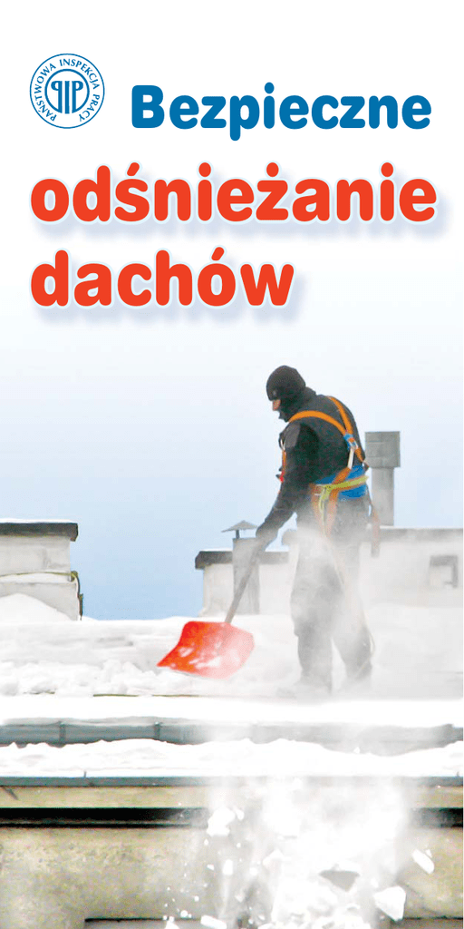 Bezpieczne odśnieżanie dachów Odśnieżaj dachy! Obowiązkiem właściciela lub zarządcy obiektu budowlanego jest: utrzymywanie budynku w dobrym stanie technicznym; zapewnienie bezpieczeństwa zarówno osobom przebywającym wewnątrz obiektu, jak i przechodniom. Nadmiar śniegu na dachu może spowodować jego zawalenie. Śnieg i lód na krawędzi dachu mogą zagrażać przechodniom. Sople i nawisy lodowe tworzą się na rynnach i pasie przyrynnowym, najczęściej bezpośrednio nad przechodniami. Bardzo ważne jest zabezpieczenie miejsca przed rozpoczęciem prac oraz kierowanie ruchem pieszym w ich pobliżu. W miejscach szczególnie niebezpiecznych, jeżeli to możliwe, należy usuwać sople korzystając z podnośnika koszowego. Sople z dachu można też zbijać przy zachowaniu szczególnej ostrożności, ponieważ grozi to uszkodzeniem rynien, a spadające sople mogą zranić przechodniów i uszkodzić znajdujące się w pobliżu samochody. Ochrona indywidualna i zbiorowa Z punktu widzenia przepisów, rozróżniamy dwa rodzaje dachów: dachy płaskie o nachyleniu mniejszym niż 20%; dachy strome o nachyleniu większym niż 20%. Na dachach płaskich, pracownicy powinni zabezpieczać się przed upadkiem szczególnie przy: krawędzi dachu, otworach w dachu, miejscu, gdzie dach jest osłabiony, niezabezpieczonych świetlikach i klapach dymowych, innych miejscach grożących upadkiem. 0,2 m 1m Uwaga! Nachylenie 20% oznacza, że na odcinku 1 m spadek wynosi 20 cm. Dobrą praktyką jest stosowanie na dachach środków ochrony zbiorowej, np. balustrad, siatek ochronnych lub krat na świetlikach. Taka ochrona zwiększa bezpieczeństwo osób pracujących przy odśnieżaniu. W sytuacji, gdy nie ma takich zabezpieczeń, pracownicy muszą zostać wyposażeni w środki ochrony indywidualnej i przeszkoleni w sposobie ich używania. Stan techniczny dachu Właściciel lub zarządca ma obowiązek prowadzenia książki obiektu budowlanego, w której zanotowane są wszystkie kontrole techniczne budynku. Z tego obowiązku zwolnieni są m.in. właściciele domów jednorodzinnych. Jeżeli stan techniczny dachu wzbudza wątpliwości, a budynek nie przeszedł okresowej kontroli technicznej, nie wolno dopuścić pracowników do pracy, gdyż może to zagrozić ich życiu i zdrowiu. Aby nie uszkodzić konstrukcji budynku, właściciel powinien określić w porozumieniu z uprawnionym konstruktorem sposób odśnieżania dachu. W zależności od regionu kraju i czasu powstania, dachy budynków mają wytrzymałość od kilkudziesięciu do kilkuset kg na m2. Do obliczenia masy śniegu można zastosować średnie wartości ciężaru objętościowego śniegu. Przyjmuje się średni ciężar: świeżego śniegu – 1 kN/m3 osiadłego śniegu (kilka godzin po opadach) – 2 kN/m3 starego śniegu (kilka tygodni) 2,5-3,5 kN/m3 mokrego śniegu – 4 kN/m3. Zawsze należy upewnić się, jakie jest dopuszczalne obciążenie dachu oraz czy odśnieżanie nie uszkodzi jego pokrycia. Dachy strome Ze względu na ciągłe ryzyko poślizgnięcia i upadku, odśnieżanie na dachach stromych powinno być organizowane z nadzwyczajną ostrożnością, a wymagania w stosunku do osób wykonujących te prace muszą być szczególnie wysokie. Nie powinno się zlecać odśnieżania dachów stromych pracownikom z małym stażem pracy i nieposiadającym odpowiedniego przeszkolenia! Przy odśnieżaniu dachów stromych należy używać bardziej zaawansowanych środków ochrony indywidualnej. Posługiwanie się nimi wymaga wiedzy i odpowiedniego przeszkolenia. Strome dachy powinny odśnieżać firmy specjalistyczne, które posiadają dokumenty potwierdzające kompetencje w tej dziedzinie. Na dachach stromych pracownicy muszą być zabezpieczeni przed upadkiem z wysokości w każdym miejscu. Dachy płaskie Przed rozpoczęciem odśnieżania dachu, należy bezwzględnie: przeanalizować związane z nim ryzyko i zastosować odpowiednie środki maksymalnie je obniżające. Odśnieżanie jest pracą na wysokości, dlatego aby zmniejszyć do minimum ryzyko wypadku należy dopuszczać do odśnieżania osoby tylko: z aktualnymi badaniami lekarskimi do pracy na wysokości, po odbytym szkoleniu bhp ogólnym i stanowiskowym oraz szkoleniu z zakresu ochrony przed upadkiem (jeżeli powinien pracować w sprzęcie ochronnym). Osoba, która odpowiada za prace przy odśnieżaniu, powinna: sprawować bezpośredni nadzór nad pracownikami i przygotować dla nich imienny podział zadań, wyposażyć pracowników w stosowne środki ochrony indywidualnej, opracować plan ratowniczo-ewakuacyjny. Bezpieczna droga wejścia Do obowiązków właściciela budynku należy zapewnienie bezpiecznego wejścia na dach. Jedyną bezpieczną drogą takiego wejścia jest obarierowana klatka schodowa. Na dach można również dostać się korzystając z drabin, z drabin z koszem ochronnym, czy drabin przystawnych rusztowania. W takich wypadkach należy zapobiegać ryzyku upadku z wysokości, stosując odpowiednie środki ochrony. Zabezpieczenie terenu Teren wygrodzony powinien obejmować obszar o szerokości 1/10 wysokości budynku, nie mniej jednak niż 6 metrów. W przypadku braku możliwości zagrodzenia wymaganego obszaru, należy zastosować inne środki zapewniające bezpieczeństwo osobom znajdującym się w sąsiedztwie odśnieżanego obiektu. Można to uzyskać poprzez: zagrodzenie przyległego do budynku chodnika, zablokowanie przejazdu jedną stroną ulicy, kierowanie ruchem pieszych i samochodowym przez osobę znajdującą się na dole, jeżeli chodnik lub jezdnia są zablokowane np. przez zaparkowane auta, trzeba o tym jak najszybciej powiadomić Urząd Miasta lub Straż Miejską. Potknięcia i poślizgnięcia Dachy są często wykonane ze śliskich materiałów (PVC, EPDM, blacha), a na ich powierzchni rozciągnięte są instalacje odgromowe oraz przewody grzewcze i telekomunikacyjne. Jeżeli dach jest przysypany warstwą śniegu albo pokryty lodem, ryzyko potknięcia lub