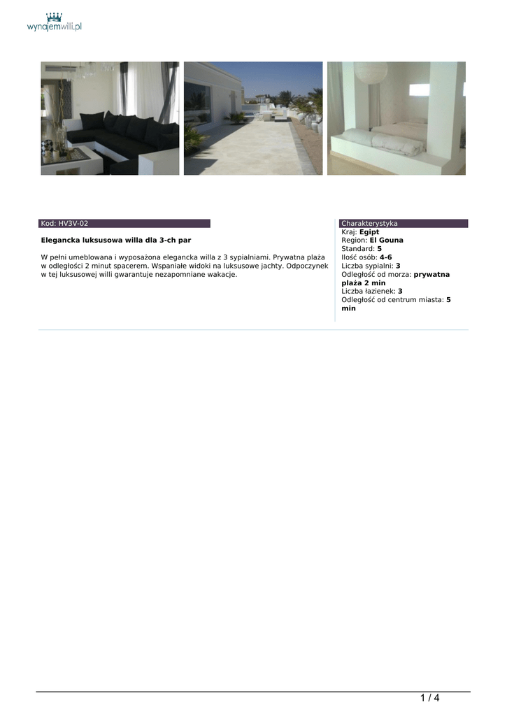 Kod: HV3V-02 Elegancka luksusowa willa dla 3-ch par W pełni umeblowana i wyposażona elegancka willa z 3 sypialniami. Prywatna plaża w odległości 2 minut spacerem. Wspaniałe widoki na luksusowe jachty. Odpoczynek w tej luksusowej willi gwarantuje nezapomniane wakacje. Charakterystyka Kraj: Egipt Region: El Gouna Standard: 5 Ilość osób: 4-6 Liczba sypialni: 3 Odległość od morza: prywatna plaża 2 min Liczba łazienek: 3 Odległość od centrum miasta: 5 min 1/4 Parę minut taksówką, i goście znajdą się w centrum El Gouna z przytulnymi kawiarenkami i restauracjami, wśród muzyki, barów, klubów, butików. Przyjemne klimatyczne spacery po okolicy. Ta willa jest idealnym wyborem dla koneserów sztuki i piękna - grupy do 6 osób. Cena wynajmu za tydzień: niski sezon €2.835 mid-sezon €3.200 wysoki sezon €3.500 peak-sezon €3.800 2/4 3/4 4/4 Powered by TCPDF (www.tcpdf.org)
