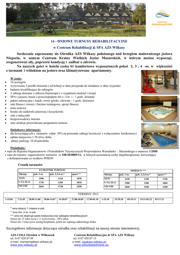 14 - DNIOWE TURNUSY REHABILITACYJNE w Centrum Rehabilitacji & SPA AZS Wilkasy Serdecznie zapraszamy do Ośrodka AZS Wilkasy położonego nad brzegiem malowniczego jeziora Niegocin, w samym Centrum Krainy Wielkich Jezior Mazurskich, w którym można wypocząć, zregenerować siły, poprawić kondycję i zadbać o zdrowie. Na naszych gości w hotelu czeka 61 komfortowo wyposażonych pokoi 2, 3 , 4 –os. w większości z tarasami i widokiem na jezioro oraz klimatyzowane apartamenty. W cenie: 14 noclegów wyżywienie 3 posiłki dziennie ( od kolacji w dniu przyjazdu do śniadania w dniu wyjazdu) badanie kwalifikujące do zabiegów 3 zabiegi dziennie z zakresu fizjoterapii ( z wyjątkiem niedziel i świąt) SPA ( jacuzzi, basen z przeciwprądem 4m x 11m ) - 1 godz. dziennie pakiet rekreacyjny ( kajak, rower górski, siłownia - 1 godz. dziennie) sala fitness ( rowery i bieżnie treningowe, sprzęt fitness) tenis stołowy boisko do siatkówki plażowej i koszykówki sala z matą judo bezprzewodowy internet inne atrakcje przewidziane programem turnusu Dodatkowe informacje: dla korzystających z turnusów -rabat 30% na pozostałe zabiegi lecznicze( z wyłączeniem kriokomory) opłata miejscowa 1,70 zł/os./doba płatny parking: 10 zł/sam/doba Posiadamy: wpis do Rejestru Organizatorów i Pośredników Turystycznych Województwa Warmińsko – Mazurskiego o numerze 1/2008 wpis do rejestru organizatorów turnusów nr OR/28/0005/11, w których uczestniczą osoby niepełnosprawne, korzystające z dofinansowania ze środków PFRON Cennik turnusów UCZESTNIK TURNUSU Miesiąc pok. 1-os. pok. 2,3,4-os.* OPIEKUN *** apart.** Miesiąc pok. 1-os. pok. 2,3,4-os.* apart.** XI-IV 1590 1310 1870 XI-IV 1470 1190 1750 V-VI, IX-X 1730 1450 2010 V-VI, IX-X 1580 1300 1860 VII-VIII 2010 1730 2290 VII-VIII 1820 1540 2100 TERMINY 2012 1-15.04 7-21.05 28.05-11.06 30.06-14.07 14-28.07 27.08-10.09 17.09-01.10 1-15.10 15-29.10 05-19.11 * cena dotyczy 1 miejsca w pok. ** przy min. 2 os. w pok. *** cena nie obejmuje opieki medycznej oraz zabiegów rehabilitacyjnych Dzieci do 12 roku życia z ½ wyżywienia - 30% rabat. Dzieci do 3 roku życia nocleg bezpłatnie, jeżeli nie zajmują oddzielnego łóżka. Szczegółowe informacje dotyczące ośrodka oraz rehabilitacji na naszej stronie internetowej. AZS COSA Ośrodek w Wilkasach tel. 0-87 428 07 09 e-mail: [email protected]; www.azs-wilkasy.pl Centrum Rehabilitacyjne & SPA AZS Wilkasy tel. 0-87 428 07 15 e-mail: [email protected]; www.odzyskajzdrowie.eu 19.11-03.12 03-17.12
