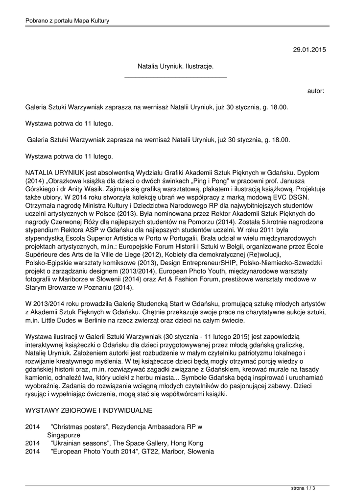 Pobrano z portalu Mapa Kultury 29.01.2015 Natalia Uryniuk. Ilustracje. ____________________________ autor: Galeria Sztuki Warzywniak zaprasza na wernisaż Natalii Uryniuk, już 30 stycznia, g. 18.00. Wystawa potrwa do 11 lutego. Galeria Sztuki Warzywniak zaprasza na wernisaż Natalii Uryniuk, już 30 stycznia, g. 18.00. Wystawa potrwa do 11 lutego. NATALIA URYNIUK jest absolwentką Wydziału Grafiki Akademii Sztuk Pięknych w Gdańsku. Dyplom (2014) „Obrazkowa książka dla dzieci o dwóch świnkach „Ping i Pong” w pracowni prof. Janusza Górskiego i dr Anity Wasik. Zajmuje się grafiką warsztatową, plakatem i ilustracją książkową. Projektuje także ubiory. W 2014 roku stworzyła kolekcję ubrań we współpracy z marką modową EVC DSGN. Otrzymała nagrodę Ministra Kultury i Dziedzictwa Narodowego RP dla najwybitniejszych studentów uczelni artystycznych w Polsce (2013). Była nominowana przez Rektor Akademii Sztuk Pięknych do nagrody Czerwonej Róży dla najlepszych studentów na Pomorzu (2014). Została 5.krotnie nagrodzona stypendium Rektora ASP w Gdańsku dla najlepszych studentów uczelni. W roku 2011 była stypendystką Escola Superior Artística w Porto w Portugalii. Brała udział w wielu międzynarodowych projektach artystycznych, m.in.: Europejskie Forum Historii i Sztuki w Belgii, organizowane przez École Supérieure des Arts de la Ville de Liege (2012), Kobiety dla demokratycznej (Re)wolucji, Polsko-Egipskie warsztaty komiksowe (2013), Design EntrepreneurSHIP, Polsko-Niemiecko-Szwedzki projekt o zarządzaniu designem (2013/2014), European Photo Youth, międzynarodowe warsztaty fotografii w Mariborze w Słowenii (2014) oraz Art & Fashion Forum, prestiżowe warsztaty modowe w Starym Browarze w Poznaniu (2014). W 2013/2014 roku prowadziła Galerię Studencką Start w Gdańsku, promującą sztukę młodych artystów z Akademii Sztuk Pięknych w Gdańsku. Chętnie przekazuje swoje prace na charytatywne aukcje sztuki, m.in. Little Dudes w Berlinie na rzecz zwierząt oraz dzieci na całym świecie. Wystawa ilustracji w Galerii Sztuki Warzywniak (30 stycznia - 11 lutego 2015) jest zapowiedzią interaktywnej książeczki o Gdańsku dla dzieci przygotowywanej przez młodą gdańską graficzkę, Natalię Uryniuk. Założeniem autorki jest rozbudzenie w małym czytelniku patriotyzmu lokalnego i rozwijanie kreatywnego myślenia. W tej książeczce dzieci będą mogły otrzymać porcję wiedzy o gdańskiej historii oraz, m.in. rozwiązywać zagadki związane z Gdańskiem, kreować murale na fasady kamienic, odnaleźć lwa, który uciekł z herbu miasta... Symbole Gdańska będą inspirować i uruchamiać wyobraźnię. Zadania do rozwiązania wciągną młodych czytelników do pasjonującej zabawy. Dzieci rysując i wypełniając ćwiczenia, mogą stać się współtwórcami książki. WYSTAWY ZBIOROWE I INDYWIDUALNE 2014 ”Christmas posters”, Rezydencja Ambasadora RP w Singapurze 2014 ”Ukrainian seasons”, The Space Gallery, Hong Kong 2014 ”European Photo Youth 2014”, GT22, Maribor, Słowenia strona 1 / 3 Pobrano z portalu Mapa Kultury 2014 ”Art & Fashion Forum”, Centrum Sztuki Stary Browar, Poznań 2014 ”ShOUT for UKRAINE”, Teatr Powszechny, Warszawa | Majdan, Kijów, Ukraina | Państwowa Galeria Sztuki, Sopot | Akademia Sztuk Pięknych w Gdańsku 2014 ”Kobiety dla demokratycznej (Re)wolucji”, 25. Międzynarodowy Festiwal Komiksu i Gier, Łódź | Darb 1718 Contemporary Art & Culture Center, Kair, Egipt | Mediateka, Wrocław | Galeria Cheap East, Poznań | Nadbałtyckie Centrum Kultury, Gdańsk (2013) 2014 ”Flores Polacas em Portugal”, Konsulat Generalny RP w Porto, Portugalia 2014 ”Klepanki”, MINI Galeria, Gdańsk 2014 ”Little Dudes”, Villa Neuko lln, Berlin, Niemcy 2014 ”Art Spot”, Akademia Sztuk Pięknych w Gdańsku 2014 ”Chinatown Vinyl Squad”, Kult Gallery, Singapur 2014 ”C!Here”, World Culture Open, Pekin, Chiny 2014 ”Cocina de Cuentos”, Salon do Libro Infantil, Pontevedra, Hiszpania 2014 ”Młodzi Graficy”, Dom Sztuki GAK, Gdańsk 2013 ”Z Gdańska do Singapuru”, Lowercase, Singapur 2013 ”Collective exhibition”, Pop Up Art Gallery, Berlin, Niemcy 2013 ”Sztuka lata”, Klub Muzyczny Scena, Sopot 2013 ”Museums over the borders”, Muzeum Archeologii i Historii, Elbląg 2013 ”Young Energy for Europe”, 6. Europejskie Biennale Plakatu Szkół Artystycznych i Designu, Anklam, Niemcy 2013 ”KRYTYczyNIE”, Studencki Festiwal Sztuk Wizualnych, Gdańsk 2013 ”Skłonności do ostrości”, Ministerstwo Kultury i Dziedzictwa Narodowego, Warszawa | Akademia Sztuk Pięknych w Gdańsku 2013 ”Strefa radości”, Teatr Druga Strefa, Warszawa 2013 ”Struktury i konstrukcje” Galeria Wyspa Skarbów GAK, Gdańsk 2013 ”Radości młodości”, Gdański Archipelag Kultury, Gdańsk 2013 ”Aukcja Młodej Sztuki”, Sopocki Dom Aukcyjny, Sopot 2013 ”Filhos de um deus menor”, Palacio das Artes, Porto, Portugalia 2012 ”Choinki”, Wielka Zbrojownia, Gdańsk 2012 ”Przyjaciele Grają Razem”, Urząd Miejski w Gdańsku 2012 ”Finał konkursu na plakat”, Ergo Arena, Sopot 2012 ”Aukcja Młodej Sztuki”, Sopocki Dom Aukcyjny, Sopot 2012 ”Skłonności do ostrości”, Teatr im. Modrzejewskiej, Legnica 2012 ”Porto”, Klub Kultury Saska Kępa, Warszawa | Zatoka Sztuki, Sopot 2012 ”Post-European Forum of History and Arts”, Academie strona 2 / 3 Pobrano z portalu Mapa Kultury Royale des Beaux-Arts de la Ville de Liege, Belgia 2012 ”Tworzymy bezpieczny internet”, Muzeum Plakatu, Warszawa 2011 „ESAP in Geraldes exhibition”, Geraldes da Silva Gallery, Porto, Portugalia 2011 „Po plenerze w Górkach Zachodnich”, Akademia Sztuk Pięknych w Gdańsku 2011 „2050”, Muzeum Miasta Gdyni 2011 ”Ekslibrisy”, Biblioteka Raczyńskich, Poznań www.uryniuk.pl www.facebook.com/uryniuk strona 3 / 3
