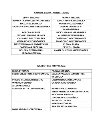 NAMIOT Z KORYTARZEM: (RZUT) LEWA STRONA: ROMANTIC PRINCESS-W.ZAMRZŁA EPIZOD-W.ZAMRZŁA DAPPER-A.ŚWIONTEK-BRZEZIOSKA FORCE-A.LESNER WOHLKLANG U-A.LESNER CHENARO 2-M.CYBULSKA ONTARIO-K.POROŻYOSKA FIRST WAIOWA-K.POROŻYOSKA CASSINIA-A.SKÓLSKA GOLDEN GETELMANNM.BARANOWSKA PRAWA STRONA: CANDYMAN-K.WOŹNICKA ROGER-P.KOZŁOWSKA DEEPAS CORINIUS PM.GRABIOSKA LUCKY STAR-M. GRABINSKA AURENA-W.WINIARSKA CASSINIA-O.WICZANOWSKA PIKADOR-O.WICZANOWSKA KLEO-N.PLATA EASY T-J. PLATA ANGEL QUEEN-D.KUCZKOWSKA NAMIOT BEZ KORYTARZA: LEWA STRONA: EVER FOR ACTION-Z.KOPROWSKA PRISCO-J.SCHWICHTENBERG WARRIOR GRANDA.LENARTOWICZ SUMMER HIT-A.LENARTOWICZ DYNASTIA-D.KUCZKOWSKA PRAWA STRONA: EQUEENPASSION LEMON TREEM.CYBULA UNLIMITEDO.ZIÓŁKOWSKA CARDEA-K.BUKOWSKA MINISTER-E.CZADERNA STENVANENGE CHARLES-J.BILICKA MOCNA-W.BIEGAŁA JENEFER W-K.KAMIOSKA SHE BOY-D.OLECH HOKUS-A.KONERA SAN SECRET-A.KONERA NAMIOT Z KORYTARZEM( NIEBIESKI): CASIO ROYAL-H.STROMSKA BUTTINI-K.HAŁEŁA STAJNIA MUROWANA: DONNA KARAN 13-P.MAOCZAK SALVATTORE FERRAGAMOP.MAOCZAK WILLIAMS JUNIOR-P.MAOCZAK HARRISON-K.RAJNERT AMARETTO-A.GŁUSZKIEWICZ DESSMAN-D.KOSECKA PERYKLES-D.KOSECKA BOSSIER-D.KOSECKA DIEGO RAMIREZ-A.TRAWIOSKA VALENTIJIN-A.SKRZESZEWSKA TASSILO I-A.SKRZESZEWSKA --------------------------------------------------------------FONTAIN-A.HAŁASOWSKA DIOR-A.ARTOMONOVA AZZARO-R.SABITOV I.Q.-A.KARKOTA-ŻUKOWSKA LADY IN RED-T.TOMASZEWSKA WONDER WORLDT.TOMASZEWSKA LOOMER WAID-K.JĘDRZEJCZYK JACK SPAROW-A.WIERZBIŁO LITTLE LAKOTA-A.WIERZBIŁO