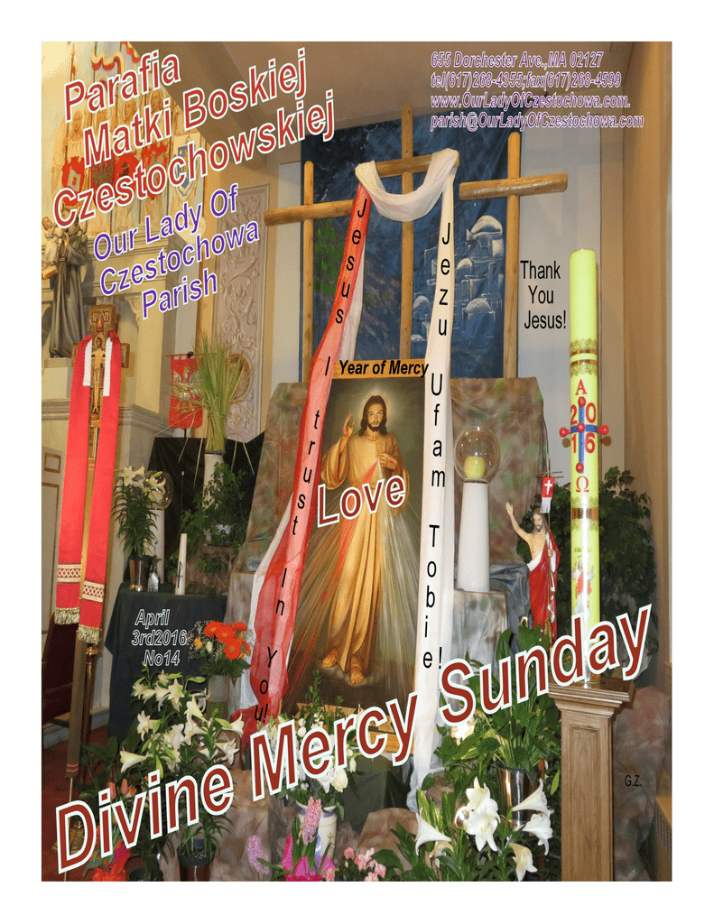 BIURO PARAFIALNE / PARISH OFFICE Tel: 617-268-4355; Fax: 617-268-4599 Monday - Friday - 8:00 am - 2:00 pm Saturday: 10:00 am - 12:00 pm Evenings and weekends - by appointment only. PORZĄDEK MSZY ŚWIĘTYCH MASS SCHEDULE Mon. - Fri. 7:00 am (English); 7:00 pm (Polish) Fri. 6:00 pm - 7:00 pm - Adoracja Najśw. Sakr. - Koronka Spowiedź - Adoration, Divine Mercy Chaplet, Confession 7:00 pm Mass (Polish) Saturday 8:00 am (Polish) 4:00 pm (English) 7:00 pm (Polish) Sunday 8:00 am (Polish) 9:30 am (English) 11:00 am (Polish) Holydays - as announced SPOWIEDŹ / CONFESSIONS Friday 6:00 pm and every day 30 min. before Masses. CHRZEST / BAPTISM By arrangement with the priest. Instruction for parents and godparents is required. SAKRAMENT MAŁŻEŃSTWA / MARRIAGE Please, make arrangement with the parish office at least six months in advance. Instruction is required. SAKRAMENT CHORYCH/SACRAMENT OF THE SICK Parishioners who are seriously ill should call the office to arrange for a priest to visit and administer the Sacraments. ŻYCIE JEST DAREM OD BOGA Jeżeli odkryłaś, że pod Twym sercem poczęło się życie, przyjdź do nas sama lub z najbliższą osobą i podziel się tą wspaniałą nowiną. Będziemy Ci błogosławić, a jeśli trzeba - służyć pomocą. Nie lękaj się! - Ojcowie franciszkanie Misją Parafii Matki Bożej Częstochowskiej jest dawanie świadectwa wiary rzymsko-katolickiej i polskiego dziedzictwa. Ofiarnie i nieustannie służymy Bogu i sobie nawzajem zachowując i dzieląc się naszymi polskimi tradycjami w otwarciu się na wszystkich ludzi. Parafię obsługują Ojcowie Franciszkanie. The mission of the Parish of Our Lady of Czestochowa is to bear witness to our Roman Catholic faith and our Polish heritage. We strive to continue to serve God and each other, celebrating and sharing our Polish traditions, welcoming and reaching out to all people. The parish is served by Conventual Franciscan Friars. PASTORAL STAFF - FRANCISCAN FRIARS OJCOWIE FRANCISZKANIE (OFM Conv.) Fr. Jerzy Żebrowski OFMConv. - pastor Fr. Józef Brzozowski OFMConv. - guardian & parochial vicar Fr. Aloysius Minyong Hong OFMConv. - in residence KATECHECI / CATECHISTS Diakon Wojciech Morański - bierzmowanie; Katarzyna Chludzińska - kl. 0; Elżbieta Sokołowska - kl. 1; O. Jerzy Żebrowski - kl. 2; Zofia Fiedorczyk - kl. 3; Monika Danek - kl. 4 i 5; Piotr Goszczynski - kl. 6; Danuta Daniels - kl. 6; Eugeniusz Bramowski - kl. 7; Alicja Szewczyk, Beata Kozak, Małgorzata Sokołowska, Urszula Boryczka, Danuta Surowiec-Ramos - zastępstwa Iwona Gajczak - koordynatorka PRACOWNICY PARAFII / OFFICE STAFF Secretary & Religious Education Coordinator - Mrs. Iwona Gajczak Bookkeeper & Office Assistant - Ms. Connie Bielawski SŁUŻBA MUZYCZNA / MUSIC MINISTRY Organist & Psalmist: Mrs. Marta Saletnik ZAKRYSTIA/SACRISTAN – KWIATY/FLOWERS Mrs. Beata Kozak & Mrs. Renata Marshall LIFE IS A GIFT FROM GOD If you discovered that a new life began under your heart, come to us alone or with someone you love, and share this wonderful news. We will bless you, and - if necessary - offer you help. Do not be afraid! - Franciscan Fathers ACTIVITIES & ORGANIZATIONS Sala św. Jana Pawła II — St. John Paul II Hall Kontakt w sprawie wynajmu sali: tel: 617-268-4355 W sprawie sprzętu audio-wizualnego tel. 617-922-3691 Contact for renting the hall: tel: 617-268-4355 For audio-visual equipment tel. 617-922-3691 (Mariusz) Ministranci / Altar Servers - Eugeniusz Bramowski Spotkania w pierwsze niedziele miesiąca w sali świętego Jana Pawła II o godz. 10:00 am (781-871-2991) Fundacja Kultury Polskiej - Polish Cultural Foundation, Inc. - Mr. Andrzej Pronczuk - tel. 617-859-9910 Polska Szkoła Sobotnia - Polish Saturday School - Mr. Jan Kozak - tel. 617-464-2485 Chór Parafialny i Chórek Dziecięcy Promyki św. Jana Pawła II - Parish Choir & Children Choir - Mrs. Marta Saletnik, tel. kom. 857-212-7962 Stowarzyszenie Weteranów Armii Polskiej - SWAP #37 Mr. Wincenty Wiktorowski - tel. 617-288-1649 2 Grupa AA - Stanisław, tel. 508 283 4262 Sala pod kościołem. Spotkania odbywają się w każdy czwartek o godz. 7:00 pm Krakowiak - Wednesdays at 7:30 pm - St. John Paul II hall www.krakowiak.org,: Eric Pierce: Tel. 508-320-2344 Żywy Różaniec / Rosary Society - Mrs. Genowefa Lisek tel. 617-436-5779 Siostry Matki Bożej Miłosierdzia Sisters of Our Lady of Mercy: tel. 617-288-1202 Polski Amatorski Teatr w Bostonie / Polish Theater - Mrs. Małgorzata Tutko: tel. 617-325-2208 Klub Polski Polish American Citizens Club - Mr. Christopher Lisek Club: 617-436-2786; Cell: 617-436-2686 MASS INTENTIONS - INTENCJE MSZALNE Easter Saturday, April 2, 2016, Sobota w Oktawie Wielkanocy 8:00 am † Tomasz Wojdakowski — Żona i dzieci 4:00 pm † Chester Murawski, John & Jeanette Gannon — Niece 7:00 pm † Leszek Szonert, Teresa Zaleska — Żona i córka Breath of New Life The prophet Daniel in a vision saw "One like the Son of Man" receive everlasting kingship (see Daniel 7:9-14). John is taken to heaven in today's Second Reading where He sees Daniel's prophecy fulfilled in Jesus, who appears as "One like a Son of Man." Jesus is clad in the robe of a High Priest (see Exodus 28:4; Wisdom 18:24) and wearing the gold sash of a King (see 1 Maccabees 10:89). He has been exalted by the right hand of the Lord, as we sing in today's Psalm. His risen body, which the Apostles touch in today's Gospel, has been made a life-giving Spirit (see 1 Corinthians 15:45). As the Father anointed Him with the Spirit and power (see Acts 10:38), Jesus pours out that Spirit on the Apostles, sending them into the world "as the Father has sent Me." Jesus "breathes" the Spirit of His divine life into the Apostles - as God blew the "breath of life" into Adam (see Genesis 2:7), as Elijah's prayer returned "the life breath" to the dead child (see 1 Kings 17:21-23), and as the Spirit breathed new life into the slain in the valley of bones (see Ezekiel 37:9-10). His creative breath uni