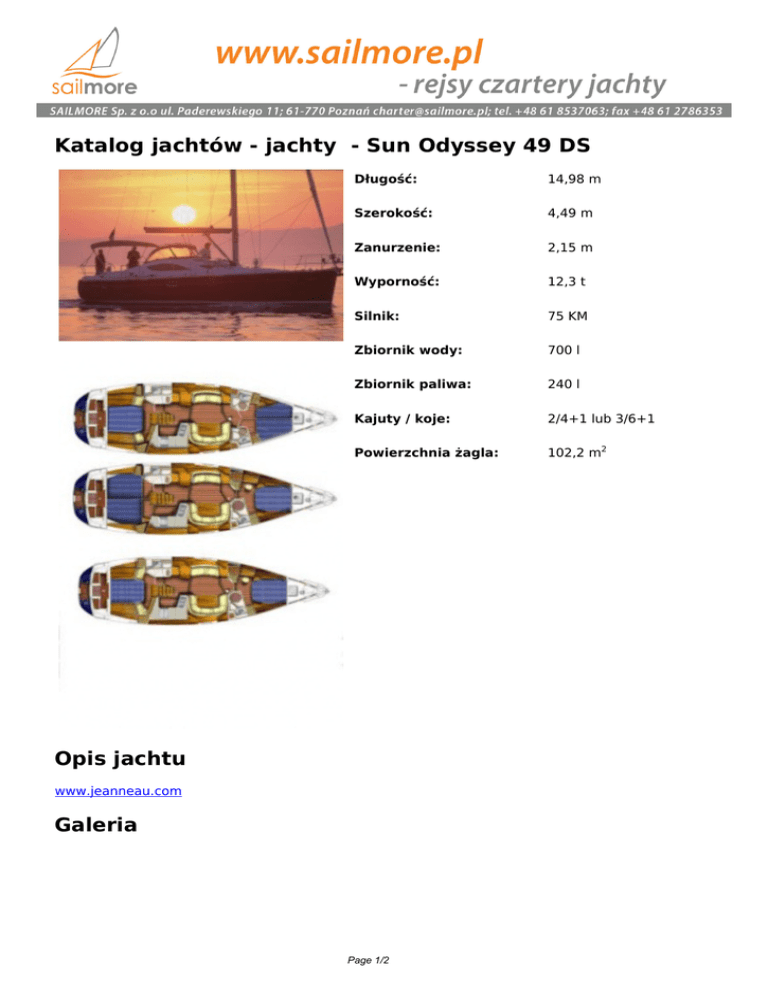 Katalog jachtów - jachty - Sun Odyssey 49 DS Długość: 14,98 m Szerokość: 4,49 m Zanurzenie: 2,15 m Wyporność: 12,3 t Silnik: 75 KM Zbiornik wody: 700 l Zbiornik paliwa: 240 l Kajuty / koje: 2/4+1 lub 3/6+1 Powierzchnia żagla: 102,2 m2 Opis jachtu www.jeanneau.com Galeria Page 1/2 Dodatkowe informacje Prezentowane zdjęcia i szkice to przykłady możliwej zabudowy i wyposażenia jachtu. Czarterowany jacht może różnić się elementami wykończenia, wyposażenia czy kolorystyką zabudowy gdyż stocznie jachtowe umożliwiają dużą dowolność w doborze poszczególnych elementów wyposażenia wnętrza. W efekcie jachty tego samego typu mogą różnić się ilością kabin, a nawet dopuszczeniem do żeglugi dla różnej ilości osób. Tak więc możliwie dokładne dane na temat czarterowanej jednostki dostarczamy na życzenie dokonując jej ostatecznej rezerwacji. Page 2/2