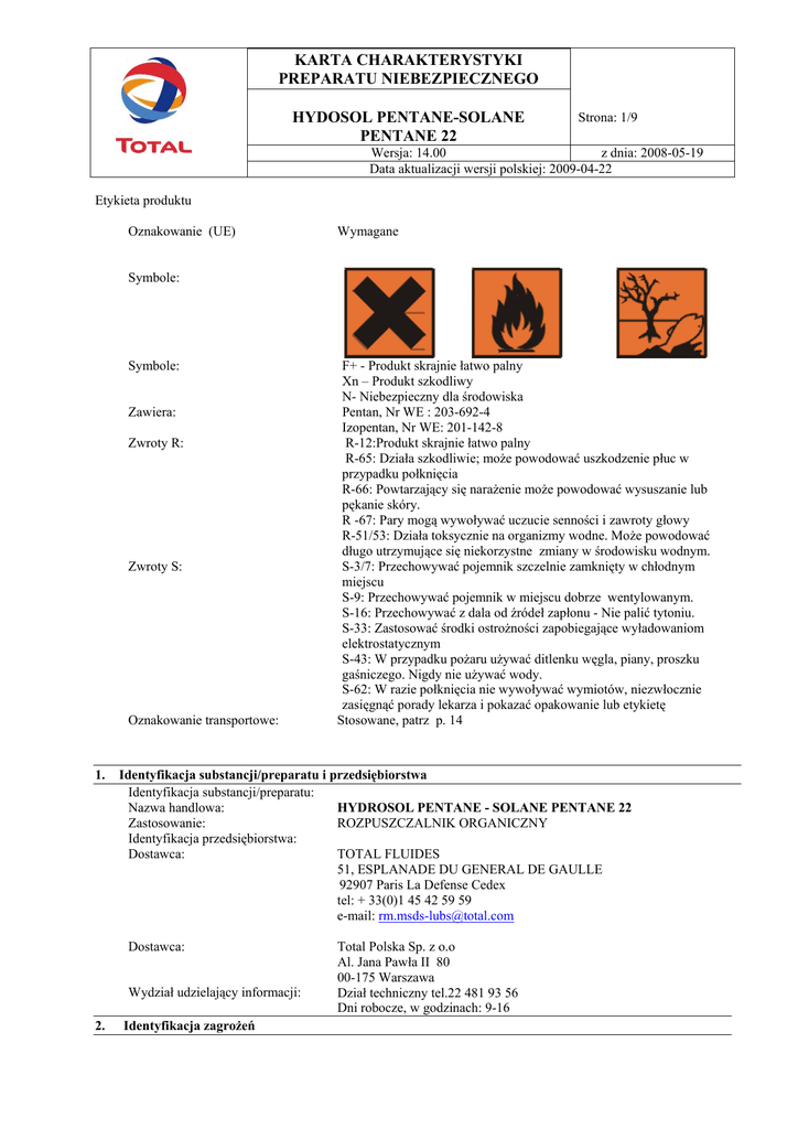KARTA CHARAKTERYSTYKI PREPARATU NIEBEZPIECZNEGO HYDOSOL PENTANE-SOLANE PENTANE 22 Strona: 1/9 Wersja: 14.00 z dnia: 2008-05-19 Data aktualizacji wersji polskiej: 2009-04-22 Etykieta produktu Oznakowanie (UE) Wymagane Symbole: Symbole: Zawiera: Zwroty R: Zwroty S: Oznakowanie transportowe: 1. Identyfikacja substancji/preparatu i przedsiębiorstwa Identyfikacja substancji/preparatu: Nazwa handlowa: HYDROSOL PENTANE - SOLANE PENTANE 22 Zastosowanie: ROZPUSZCZALNIK ORGANICZNY Identyfikacja przedsiębiorstwa: TOTAL FLUIDES Dostawca: 51, ESPLANADE DU GENERAL DE GAULLE 92907 Paris La Defense Cedex tel: + 33(0)1 45 42 59 59 e-mail: [email protected] Dostawca: Wydział udzielający informacji: 2. F+ - Produkt skrajnie łatwo palny Xn – Produkt szkodliwy N- Niebezpieczny dla środowiska Pentan, Nr WE : 203-692-4 Izopentan, Nr WE: 201-142-8 R-12:Produkt skrajnie łatwo palny R-65: Działa szkodliwie; może powodować uszkodzenie płuc w przypadku połknięcia R-66: Powtarzający się narażenie może powodować wysuszanie lub pękanie skóry. R -67: Pary mogą wywoływać uczucie senności i zawroty głowy R-51/53: Działa toksycznie na organizmy wodne. Może powodować długo utrzymujące się niekorzystne zmiany w środowisku wodnym. S-3/7: Przechowywać pojemnik szczelnie zamknięty w chłodnym miejscu S-9: Przechowywać pojemnik w miejscu dobrze wentylowanym. S-16: Przechowywać z dala od źródeł zapłonu - Nie palić tytoniu. S-33: Zastosować środki ostrożności zapobiegające wyładowaniom elektrostatycznym S-43: W przypadku pożaru używać ditlenku węgla, piany, proszku gaśniczego. Nigdy nie używać wody. S-62: W razie połknięcia nie wywoływać wymiotów, niezwłocznie zasięgnąć porady lekarza i pokazać opakowanie lub etykietę Stosowane, patrz p. 14 Identyfikacja zagrożeń Total Polska Sp. z o.o Al. Jana Pawła II 80 00-175 Warszawa Dział techniczny tel.22 481 93 56 Dni robocze, w godzinach: 9-16 KARTA CHARAKTERYSTYKI PREPARATU NIEBEZPIECZNEGO HYDOSOL PENTANE-SOLANE PENTANE 22 Strona: 2/9 Wersja: 14.00 z dnia: 2008-05-19 Data aktualizacji wersji polskiej: 2009-04-22 Ujemne skutki zdrowotne: Zagrożenia fizyczne i chemiczne Klasyfikacja produktu: Ze względu na niską lepkość, przy przypadkowym połknięciu, produkt może przedostać się do płuc powodując ich uszkodzenie. Powtarzający się kontakt może powodować zaczerwienienie lub poważniejsze skutki na skórze. SKRAJNIE PALNY. W kontakcie z powietrzem mogą powstać wybuchowe mieszaniny. Produkt skrajnie łatwo palny. Działa szkodliwie; może powodować uszkodzenie płuc w przypadku połknięcia. Powtarzający się narażenie może powodować wysuszanie lub pękanie skóry. Pary mogą wywoływać uczucie senności i zawroty głowy. Działa toksycznie na organizmy wodne. Może powodować długo utrzymujące się niekorzystne zmiany w środowisku wodnym. 3. Skład/informacja o składnikach Charakterystyka chemiczna: pentan, mieszanina izomerów Substancje zagrażające Nr WE Nr CAS Zawartość Symbole Zwroty R zdrowiu Pentan 203-692-4 109-66-0 ok. 77 % Xn, F+, N R-12, 65, 66, 67, 51/53 Izopentan 201-142-8 78-78-4 ok. 23 % Xn, F+, N R-12, 65, 66, 67, 51/53 Całkowita zawartość aromatów, typowo, %: 0,00001 Objaśnienie zwrotów R w p.16 4. Pierwsza pomoc W PRZYPADKU POWAŻNYCH OBJAWÓW, WEZWAĆ LEKARZA LUB POGOTOWIE RATUNKOWE DROGI NARAŻENIA SIĘ: WDYCHANIE SPOŻYCIE KONTAKT ZE SKÓRĄ KONTAKT Z OCZAMI ZACHŁYŚNIĘCIE SIĘ Wynieść poszkodowanego na świeże powietrze. Symptomy: Euforia, zatrucie, ból głowy, mdłości, wymioty. Przy wysokich stężeniach: Oszołomienie, senność, zmęczenie, omdlenie Nie wywoływać wymiotów aby uniknąć ryzyka przedostania się do dróg oddechowych. Wezwać lekarza. Symptomy: - podrażnienie układu pokarmowego (ból brzucha, mdłości, wymioty, biegunka) W przypadku spożycia z przedostaniem się do płuc, zapalenie płuc z upośledzeniem oddychania. Zdjąć zabrudzone ubranie. Powierzchnie zabrudzone zmyć niezwłocznie dużą ilością wody z mydłem. W przypadku powtarzającego się lub dłuższego kontaktu ze skórą, suchość i pękanie. Dokładnie płukać dużą ilością czystej, bieżącej wody przez co najmniej 15 minut. Symptomy: - podrażnienie (łzawienie, zapalenie spojówek) Jeśli zachodzi podejrzenie przedostania się produktu do płuc (np. przy wymiotach), natychmiast zawieźć poszkodowanego do szpitala. KARTA CHARAKTERYSTYKI PREPARATU NIEBEZPIECZNEGO HYDOSOL PENTANE-SOLANE PENTANE 22 Strona: 3/9 Wersja: 14.00 z dnia: 2008-05-19 Data aktualizacji wersji polskiej: 2009-04-22 5. Postępowanie w przypadku pożaru TEMPERATURA ZAPŁONU ODPOWIEDNIE ŚRODKI GAŚNICZE NIEODPOWIEDNIE ŚRODKI SPECJALNE METODY: SPECYFICZNE ZAGROŻENIA: SPECJALNE WYPOSAŻENIE OCHRONNE DLA STRAŻAKÓW: INNE: 6. Nie używać strumieni wody, mogą sprzyjać rozprzestrzenianiu się pożaru. Do chłodzenia narażonych na pożar pojemników stosować natrysk wodny. Zapobiegać wyładowaniom statycznym, które mogą powstać podczas operacji mieszania i przelewania. Pary są cięższe od powietrza i mogą ścielić się nad podłożem, przemieszczając się do źródeł zapłonu. Pary mogą tworzyć wybuchowe mieszanki z powietrzem. Niekompletne spalanie i rozpad termiczny powodują powstawanie gazów o różnej toksyczności takich jak CO, CO2, różne węglowodory, aldehydy itp. oraz sadza. Wdychanie ich jest bardzo niebezpieczne. W zamkniętych pomieszczeniach o dużym stężeniu dymów i gazów nosić aparat izolujący drogi oddechowe. Nie spalone resztki oraz zanieczyszczoną wodę z gaszenia pożaru należy utylizować zgodnie z lokalnymi przepisami. Postępowanie w przypadku niezamierzonego uwolnienia do środowiska POSTĘPOWANIE PRZY ROZLANIU/PRZECIEKU -DO GLEBY - DO WODY -ODZYSK UTYLIZACJA UNIKANIE WTÓRNEGO ZAGROŻENIA 7. Patrz p.9. Ditlenek węgla, piana, proszek gaśniczy. Projektować instalacje tak aby uwzględniały one zabezpieczenia przed zanieczyszczeniem wody i gle