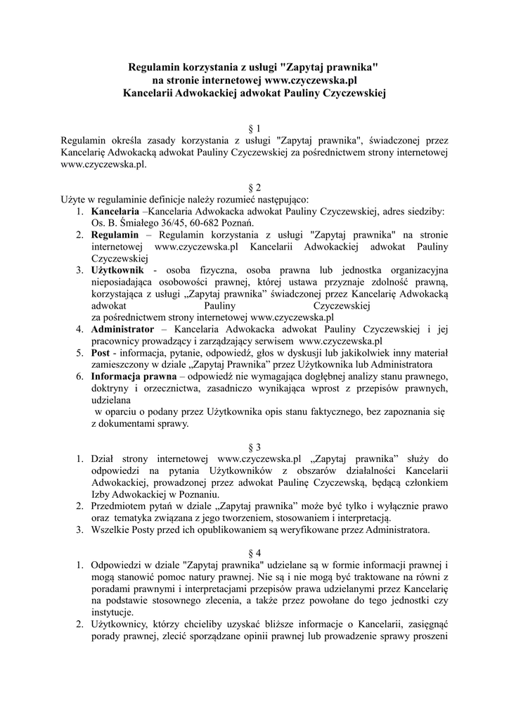 Regulamin korzystania z usługi "Zapytaj prawnika" na stronie internetowej www.czyczewska.pl Kancelarii Adwokackiej adwokat Pauliny Czyczewskiej §1 Regulamin określa zasady korzystania z usługi "Zapytaj prawnika", świadczonej przez Kancelarię Adwokacką adwokat Pauliny Czyczewskiej za pośrednictwem strony internetowej www.czyczewska.pl. §2 Użyte w regulaminie definicje należy rozumieć następująco: 1. Kancelaria –Kancelaria Adwokacka adwokat Pauliny Czyczewskiej, adres siedziby: Os. B. Śmiałego 36/45, 60-682 Poznań. 2. Regulamin – Regulamin korzystania z usługi "Zapytaj prawnika" na stronie internetowej www.czyczewska.pl Kancelarii Adwokackiej adwokat Pauliny Czyczewskiej 3. Użytkownik - osoba fizyczna, osoba prawna lub jednostka organizacyjna nieposiadająca osobowości prawnej, której ustawa przyznaje zdolność prawną, korzystająca z usługi „Zapytaj prawnika” świadczonej przez Kancelarię Adwokacką adwokat Pauliny Czyczewskiej za pośrednictwem strony internetowej www.czyczewska.pl 4. Administrator – Kancelaria Adwokacka adwokat Pauliny Czyczewskiej i jej pracownicy prowadzący i zarządzający serwisem www.czyczewska.pl 5. Post - informacja, pytanie, odpowiedź, głos w dyskusji lub jakikolwiek inny materiał zamieszczony w dziale „Zapytaj Prawnika” przez Użytkownika lub Administratora 6. Informacja prawna – odpowiedź nie wymagająca dogłębnej analizy stanu prawnego, doktryny i orzecznictwa, zasadniczo wynikająca wprost z przepisów prawnych, udzielana w oparciu o podany przez Użytkownika opis stanu faktycznego, bez zapoznania się z dokumentami sprawy. §3 1. Dział strony internetowej www.czyczewska.pl „Zapytaj prawnika” służy do odpowiedzi na pytania Użytkowników z obszarów działalności Kancelarii Adwokackiej, prowadzonej przez adwokat Paulinę Czyczewską, będącą członkiem Izby Adwokackiej w Poznaniu. 2. Przedmiotem pytań w dziale „Zapytaj prawnika” może być tylko i wyłącznie prawo oraz tematyka związana z jego tworzeniem, stosowaniem i interpretacją. 3. Wszelkie Posty przed ich opublikowaniem są weryfikowane przez Administratora. §4 1. Odpowiedzi w dziale "Zapytaj prawnika" udzielane są w formie informacji prawnej i mogą stanowić pomoc natury prawnej. Nie są i nie mogą być traktowane na równi z poradami prawnymi i interpretacjami przepisów prawa udzielanymi przez Kancelarię na podstawie stosownego zlecenia, a także przez powołane do tego jednostki czy instytucje. 2. Użytkownicy, którzy chcieliby uzyskać bliższe informacje o Kancelarii, zasięgnąć porady prawnej, zlecić sporządzane opinii prawnej lub prowadzenie sprawy proszeni są o bezpośredni kontakt z pracownikami Kancelarii. §5 1. W celu przesłania zapytania należy wpisać treść stanu faktycznego i pytanie w polu "treść pytania" oraz podać adres zwrotny e-mail, a następnie zatwierdzić przyciskiem „wyślij pytanie”. 2. Przesyłając pytanie za pośrednictwem strony www.czyczewska.pl, Użytkownik oświadcza, że zapoznał się z Regulaminem i akceptuje wszystkie jego postanowienia. §6 1. Korzystanie z usługi „Zapytaj prawnika” jest bezpłatne. 2. Administrator udziela odpowiedzi na pytanie Użytkownika możliwie najszybciej, nie jest jednak związany żadnym terminem. 3. Administrator może odmówić udzielenia odpowiedzi na pytanie lub ograniczyć jej zakres do wybranych elementów przesłanego stanu prawnego i faktycznego, bez podania przyczyny, a w szczególności jeśli odpowiedź wymaga analizy sprawy oraz weryfikacji dokumentów. 4. O opublikowaniu pytania decyduje Administrator. Nie jest obowiązany do poinformowania o tym Użytkownika. §7 1. Użytkownik wyraża nieodwołalną zgodę na publikację treści przesłanych pytań wraz z udzieloną odpowiedzią na stronie internetowej Kancelarii, bez podania danych osobowych, danych kontaktowych, nr telefonu oraz adresu e-mail Użytkownika. 2. Administrator nie gromadzi danych osobowych a wszelkie dane osobowe uzyskane w związku z prowadzoną korespondencją pomiędzy Użytkownikiem a Administratorem są chronione. Podanie danych osobowych przez Użytkownika jest dobrowolne. W każdym czasie Użytkownik ma prawo żądać usunięcia wszelkiej korespondencji prowadzonej z Administratorem. Żądanie winno zostać zgłoszone w formie pisemnej na adres Administratora. §8 1. W sprawach nieuregulowanych w niniejszym regulaminie do świadczenia usług drogą elektroniczną stosuje się przepisy Kodeksu Cywilnego oraz i innych ustaw. 2. Reguły wykonywania przez adwokata zawodu zebrane są w Zbiorze Zasad Etyki Adwokackiej i Godności Zawodu (Kodeks Etyki Adwokackiej), dostępnym na stronie Okręgowej Rady Adwokackiej w Poznaniu w zakładce „Przepisy”: www.radaadwokacka.poznan.pl. §9 Administrator nie ponosi odpowiedzialności za brak możliwości dostępu do serwisu internetowego z przyczyn od niego niezależnych. § 10 Niniejszy Regulamin obowiązuje od dnia opublikowania na stronie internetowej www.czyczewska.pl.