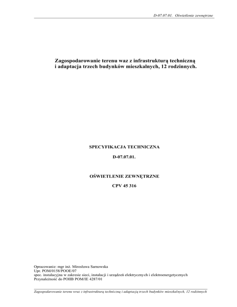 D-07.07.01. Oświetlenie zewnętrzne Zagospodarowanie terenu waz z infrastrukturą techniczną i adaptacja trzech budynków mieszkalnych, 12 rodzinnych. SPECYFIKACJA TECHNICZNA D-07.07.01. OŚWIETLENIE ZEWNĘTRZNE CPV 45 316 Opracowanie: mgr inż. Mirosława Sarnowska Upr. POM/0158/POOE/07 spec. instalacyjna w zakresie sieci, instalacji i urządzeń elektrycznych i elektroenergetycznych Przynależność do POIIB POM/IE 4287/01 Zagospodarowanie terenu wraz z infrastrukturą techniczną i adaptacją trzech budynków mieszkalnych, 12 rodzinnych D-07.07.01. Oświetlenie zewnętrzne D-07.07.01 OŚWIETLENIE ZEWNĘTRZNE 1. Wstęp 1.1. Przedmiot Specyfikacji Przedmiotem niniejszej Specyfikacji Technicznej (ST) są wymagania dotyczące wykonania i odbioru robót związanych z oświetleniem zewnętrznym w zakresie przedsięwzięcia inwestycyjnego „Zagospodarowanie terenu wraz z infrastrukturą techniczną i adaptacją trzech budynków mieszkalnych, 12 rodzinnych” w miejscowości Gniew przy ulicy Witosa. 1.2. Zakres stosowania Specyfikacji Specyfikacja jest stosowana jako dokument przetargowy i kontraktowy przy zlecaniu i realizacji robót wymienionych w punkcie 1.1. 1.3. Zakres robót objętych Specyfikacją Ustalenia zawarte w Specyfikacji dotyczą zasad prowadzenia robót i obejmują: budowę oświetlenia parkowego na terenie osiedla budowę oświetlenia ulicznego ul. Witosa 1.4. Określenia podstawowe Określenia podane w Specyfikacji są zgodne z odpowiednimi normami i określeniami podanymi w Specyfikacji ST: D-00.00.00 „Wymagania Ogólne”. Słup oświetleniowy - konstrukcja wsporcza osadzona bezpośrednio w gruncie lub na fundamencie, służąca do zamocowania oprawy oświetleniowej na wysokości nie większej niż 14m. Wysięgnik - element rurowy łączący słup lub maszt oświetleniowy z oprawą. Oprawa oświetleniowa - urządzenie służące do rozdziału, filtracji i przekształcania strumienia świetlnego wysyłanego przez źródło światła zawierające wszystkie niezbędne detale do przymocowania i połączenia z instalacją elektryczną. Kabel - przewód wielożyłowy izolowany, przystosowany do przewodzenia prądu elektrycznego, mogący pracować pod i nad ziemią. Ustój - rodzaj fundamentu dla słupów oświetleniowych. Fundament - konstrukcja żelbetowa zagłębiona w ziemi, służąca do utrzymania słupa, masztu lub szafy oświetleniowej w pozycji pracy. Szafa oświetleniowa - urządzenie rozdzielczo-sterownicze bezpośrednio zasilające instalacje oświetleniowe. Dodatkowa ochrona przeciwporażeniowa - ochrona części przewodzących dostępnych w wypadku pojawienia się na nich napięcia w warunkach zakłóceniowych. Linia kablowa - kabel wielożyłowy lub wiązka kabli jednożyłowych w układzie wielofazowym albo kilka kabli jedno lub wielożyłowych połączonych równolegle. Łącznie z osprzętem, ułożone na wspólnej trasie i łączące zaciski tych samych dwóch urządzeń elektrycznych jedno lub wielofazowych. Trasa kablowa - pas terenu w którym ułożone są jedna lub więcej linii kablowych. Napięcie znamionowe linii - napięcie międzyprzewodowe na które linia kablowa została zbudowana. Osprzęt linii kablowej - zbiór elementów przeznaczonych do łączenia, rozgałęzienia lub zakończenia kabli. Zagospodarowanie terenu wraz z infrastrukturą techniczną i adaptacją trzech budynków mieszkalnych, 12 rodzinnych D-07.07.01. Oświetlenie zewnętrzne Osłona kabla - konstrukcja przeznaczona do ochrony kabla przed uszkodzeniami mechanicznymi, chemicznymi i działaniem łuku elektrycznego. Przykrycie - osłona ułożona nad kablem w celu ochrony przed mechanicznym uszkodzeniem od góry. Skrzyżowanie - takie miejsce na trasie linii kablowej, w którym jakakolwiek część rzutu poziomego linii kablowej, przecina lub pokrywa jakąkolwiek część rzutu poziomego innej linii kablowej lub innego urządzenia podziemnego. Zbliżenie - takie miejsce na trasie linii kablowej, w którym odległość między linią kablową, urządzeniem podziemnym lub drogą komunikacyjną itp. jest mniejsza niż odległość dopuszczalna dla danych warunków układania bez stosowania przegród lub osłon zabezpieczających i w którym nie występuje skrzyżowanie. Przepust kablowy - konstrukcja o przekroju najczęściej okrągłym przeznaczona do ochrony kabla przed uszkodzeniami mechanicznymi, chemicznymi i działaniem łuku elektrycznego. Pozostałe określenia podstawowe są zgodne z odpowiednimi, obowiązującymi polskimi normami oraz definicjami podanymi w ST: D-M–0.00.00. „Wymagania ogólne” 1.5. Ogólne wymagania dotyczące robót Ogólne wymagania dotyczące robót podano w Specyfikacji ST: D-00.00.00 “Wymagania Ogólne” pkt. 1.5. 2. Materiały 2.1. Ogólne wymagania Ogólne wymagania dotyczące materiałów podano w Specyfikacji ST: D-00.00.00 “Wymagania Ogólne” pkt. 2. 2.2. Materiały budowlane 2.2.1. Piasek Piasek do wykonywania robót powinien być co najmniej gatunku „3” i spełniać wymagania PN-B-11113. 2.2.3. Fundamenty prefabrykowane Pod słupy i szafy oświetleniowe zaleca się stosowanie fundamentów prefabrykowanych. Prefabrykaty powinny być wykonane wg Rysunków uwzględniających parametry wytrzymałościowe i warunki w jakich będą pracowały. Ogólne wymagania dotyczące fundamentów określone są w PN-EN 14991:2010. 2.2.4. Rury na przepusty kablowe Przepusty kablowe powinny być wykonane z materiałów trudnopalnych, wytrzymałych mechanicznie, chemicznie i odpornych na działanie łuku elektrycznego. Rury używane na przepusty powinny być dostatecznie wytrzymałe na działanie sił ściskających, z jakimi należy liczyć się w miejscu ich ułożenia. Wnętrza ścianek powinny być gładkie lub powleczone warstwą wygładzającą ich powierzchnię, dla ułatwienia przesuwania się kabli. Na przepusty kablowe dla kabli o napięciu do 1kV należy stosować rury z tworzyw sztucznych typu HDPE o średnicy wewnętrznej nie mniejsze