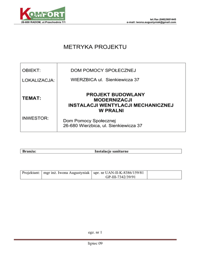 tel./fax (048)3601445 e-mail: [email protected] 26-600 RADOM, ul.Przechodnia 7/1 METRYKA PROJEKTU OBIEKT: DOM POMOCY SPOŁECZNEJ LOKALIZACJA: WIERZBICA ul. Sienkiewicza 37 TEMAT: INWESTOR: Branża: PROJEKT BUDOWLANY MODERNIZACJI INSTALACJI WENTYLACJI MECHANICZNEJ W PRALNI Dom Pomocy Społecznej 26-680 Wierzbica, ul. Sienkiewicza 37 Instalacje sanitarne Projektant: mgr inż. Iwona Augustyniak upr. nr UAN-II-K-8386/159/81 GP-III-7342/39/91 egz. nr 1 lipiec 09 tel./fax (048)3601445 e-mail: [email protected] 26-600 RADOM, ul.Przechodnia 7/1 ZAWARTOŚĆ OPRACOWANIA: 1. OPIS TECHNICZNY 2. OBLICZENIA ILOŚCI POWIETRZA WENTYLACYJNEGO 3. ZESTAWIENIE ELEMENTÓW INSTALACJI WENTYLACJI MECHANICZNEJ 4. DANE TECHNICZNE ZASTOSOWANYCH URZĄDZEŃ 5. RYSUNKI: 5.1.Sytuacja ………. ................................................................ ….…………….rys. nr 1 5.2.Rzut instalacji wentylacyjnej pralni ………. ........................ ….…………….rys. nr 2 5.3.Przekrój A – A instalacji wentylacyjnej ………. ......................... ………….rys. nr 3 5.4. Przekrój B – B instalacji wentylacyjnej ………. ................ ….…………….rys. nr 4 Strona 2 z 15 tel./fax (048)3601445 e-mail: [email protected] 26-600 RADOM, ul.Przechodnia 7/1 OPIS TECHNICZNY 1. Dane ogólne Zakres opracowania. Tematem opracowania jest wentylacja mechaniczna w modernizowanych pomieszczeniach pralni Domu Pomocy Społecznej . Przebudowa istniejącej pralni ze zmianą funkcji pomieszczeń, ma na celu uzyskanie funkcjonalnego układu z zachowaniem wymaganego ciągu technologicznego. Przebudowywane pomieszczenia pralni znajdują się w kondygnacji parteru południowego skrzydła dwukondygnacyjnego niepodpiwniczonego budynku DPS. Główne wejście do zespołu pomieszczeń pralni z głównego holu z bezpośrednim wyjściem na zewnątrz. Nad pomieszczeniami pralni znajdują się pomieszczenia biurowe z wejściem klatką schodową niezależną od innych użytkowników DPS. Konstrukcja budynku prefabrykowana z elementów kanałowych. Budynek wyposażony jest w instalację c.o. z własnej kotłowni, wod-kan, elektryczną, instalację ciepłej wody i pary technologicznej. Podstawa opracowania. - umowa nr 2/RW/2009 z DPS w Wierzbicy z dnia 09.04.2009. - założenia i wytyczne do projektowania przekazane przez Inwestora - projekt technologiczny modernizacji pralni w Domu Pomocy Społecznej w Wierzbicy. - projekt budowlany architektoniczno – konstrukcyjny modernizacji pralni - inwentaryzacja budowlano- instalacyjna dla potrzeb opracowania projektu wentylacji - obowiązujące normy i przepisy oraz literatura przedmiotu - wizja lokalna - katalogi i ustalenia z producentami urządzeń Podstawowe normy i przepisy związane z opracowaniem. - Ustawa z dnia 7 lipca 1994 r – Prawo Budowlane (tekst jednolity: Dz. U. z 2003 r Nr 207 poz. 2016 z póżniejszymi zmianami) - Rozporządzenie Ministra Infrastruktury z dnia 12 kwietnia 2002 r w sprawie warunków technicznych, jakim powinny odpowiadać budynki i ich usytuowanie (Dz. U. nr 75, poz. 690 z późniejszymi zmianami) Strona 3 z 15 tel./fax (048)3601445 e-mail: [email protected] 26-600 RADOM, ul.Przechodnia 7/1 - Rozporządzenie Ministra Infrastruktury z dnia 2 września 2004 r w sprawie szczegółowego zakresu i formy dokumentacji projektowej (Dz. U. nr 202 poz. 2072) - Normy wentylacyjne i katalogi producentów 2. Opis instalacji Wentylację mechaniczną pomieszczeń pralni zaprojektowano wg założeń podanych w projekcie technologicznym. Krotność wymian w pomieszczeniach odpowiada wymaganiom określonym w przepisach o bezpieczeństwie i higienie pracy. Zaprojektowano wentylację ogólną wszystkich pomieszczeń powietrzem świeżym uzdatnionym w centrali wentylacyjnej, jak również odciągi powietrza gorącego od maszyn ( suszarki i maglownica). Nawiew świeżego powietrza zrealizowany będzie poprzez centralę wentylacyjną podwieszaną firmy VTS usytuowaną w pomieszczeniu sortowania upranej odzieży. W centrali znajduje się filtr powietrza klasy EU4 jak również nagrzewnica elektryczna, podgrzewająca powietrze zewnętrzne w okresie zimowym. Centrala wentylacyjna sterowana będzie automatycznie z możliwością wyłączenia automatyki i sterowania ręcznego. Czerpnia powietrza znajdować się będzie w ścianie zewnętrznej. Wywiewy powietrza oparto na wentylatorach dachowych zamontowanych na kominach wentylacji grawitacyjnej firmy Uniwersal i wentylatorach łazienkowych firmy Venture Industries. Wentylatory dachowe montować na podstawach tłumiących PTL. Dla uzupełnienia ilości powietrza wydmuchiwanego przez pracujące suszarki zaprojektowano aparaty grzewczo wentylacyjne firmy Smay pracujące na powietrzu świeżym z podgrzewem nagrzewnicą elektryczną i sterowaniem w zależności od załączonej maszyny. Przewidziano również otwory nawiewne zamknięte przepustnicami sterowanymi ręcznie, dla uzupełnienia powietrza świeżego w okresie letnim. 2.1. Pomieszczenie A (korytarz) Nawiew powietrza w ilości zapewniającej wymaganą krotność wymian z układu instalacji nawiewnej ogólnej pralni. Strona 4 z 15 tel./fax (048)3601445 e-mail: [email protected] 26-600 RADOM, ul.Przechodnia 7/1 Wywiew wentylatorem dachowym poprzez zawór wywiewny zamontowany w ścianie pod stropem pomieszczenia i ciąg przewodów instalacji wywiewnej z pomieszczeń K i J. Wentylacja nawiewna włączona , wentylator wywiewny włączony. 2.2. Pomieszczenie B ( przyjmowania i sortowania brudnej bielizny i pościeli). Nawiew powietrza w ilości zapewniającej wymaganą krotność wymian z układu instalacji nawiewnej ogólnej pralni. Wywiew wentylatorem dachowym poprzez kratkę wywiewną zamontowaną w ścianie pod stropem pomieszczenia i ciąg przewodów instalacji wywiewnej z pomieszczeń B i C. Wentylacja nawiewna włączona , wentylator wywiewny włączony. 2.3. Pomieszczenie C (do moczenia odkażania i dezynfekcji płynnej) Nawiew powietrza w ilości zapewn