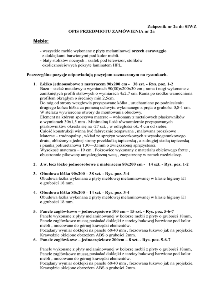 Załącznik nr 2a do SIWZ OPIS PRZEDMIOTU ZAMÓWIENIA nr 2a Meble: - wszystkie meble wykonane z płyty melaminowej orzech caravaggio z doklejkami barwionymi pod kolor mebli. - blaty stolików nocnych , szafek pod telewizor, stolików okolicznościowych pokryte laminatem HPL. Poszczególne pozycje odpowiadają pozycjom zaznaczonym na rysunkach. 1. ŁóŜko jednoosobowe z materacem 90x200 cm - 38 szt. - Rys. poz. 1-2 Baza – stelaŜ metalowy o wymiarach 90(80)x200x30 cm ; rama i nogi wykonane z zamkniętych profili stalowych o wymiarach 4x2,7 cm. Rama po środku wzmocniona profilem okrągłym o średnicy min.2,5cm. Do nóg od strony wezgłowia przyspawane kółka , uruchamiane po podniesieniu drugiego końca łóŜka za pomocą uchwytu wykonanego z pręta o grubości 0,8-1 cm. W stelaŜu wywiercone otwory do montowania obudowy. Element na którym spoczywa materac – wykonany z metalowych płaskowników o wymiarach 30x1,5 mm . Minimalną ilość równomiernie przyspawanych płaskowników określa się na -27 szt. , w odległości ok. 4 cm od siebie. Całość konstrukcji winna być fabrycznie zespawana , malowana proszkowo . Materac – trudnopalny , wkład ze spręŜyn woreczkowych z wysokogatunkowego drutu, obłoŜony z jednej strony przekładką tapicerską , a z drugiej siatką tapicerską i pianką poliuretanową T30—35mm o zwiększonej spręŜystości. Wysokość materaca – 19 cm . Pokrowiec wykonany z materiału obiciowego frotte , obustronnie pikowany antyalergiczną watą , zaopatrzony w zamek rozdzielczy. 2. J.w. lecz łóŜko jednoosobowe z materacem 80x200 cm - 14 szt. - Rys. poz. 1-2 3. Obudowa łóŜka 90x200 – 38 szt. - Rys. poz. 3-4 Obudowa łóŜka wykonana z płyty meblowej melaminowanej w klasie higieny E1 o grubości 18 mm. 4. Obudowa łóŜka 80x200 – 14 szt. - Rys. poz. 3-4 Obudowa łóŜka wykonana z płyty meblowej melaminowanej w klasie higieny E1 o grubości 18 mm. 5. Panele zagłówkowe – jednoczęściowe 100 cm – 15 szt. - Rys. poz. 5-6-7 Panele wykonane z płyty melaminowanej w kolorze mebli z płyty o grubości 18mm, Panele zagłówkowe muszą posiadać doklejki z tarcicy bukowej barwione pod kolor mebli , mocowane do górnej krawędzi elementów. PoŜądany wymiar doklejki na panelu 60/40 mm , frezowana łukowo jak na projekcie. Krawędzie oklejone obrzeŜem ABS o grubości 2mm. 6. Panele zagłówkowe – jednoczęściowe 200cm – 8 szt. - Rys. poz. 5-6-7 Panele wykonane z płyty melaminowanej w kolorze mebli z płyty o grubości 18mm, Panele zagłówkowe muszą posiadać doklejki z tarcicy bukowej barwione pod kolor mebli , mocowane do górnej krawędzi elementów. PoŜądany wymiar doklejki na panelu 60/40 mm , frezowana łukowo jak na projekcie. Krawędzie oklejone obrzeŜem ABS o grubości 2mm. 7. Panele zagłówkowe – dwuczęściowe 200/100 cm –29 szt. - Rys. poz. 5-6-7 Panele wykonane z płyty melaminowanej w kolorze mebli z płyty o grubości 18mm, Panele zagłówkowe muszą posiadać doklejki z tarcicy bukowej barwione pod kolor mebli , mocowane do górnej krawędzi elementów. PoŜądany wymiar doklejki na panelu 60/40 mm , frezowana łukowo jak na projekcie. Krawędzie oklejone obrzeŜem ABS o grubości 2mm. 8. Stolik nocny – 45/45/50 – 56 szt. - Rys. poz. 8 Stolik z szufladą i wnęką poniŜej . Wieniec górny wykonany z płyty meblowej melaminowanej o grubości 36 mm , pokrytej na prawej stronie laminatem wysokociśnieniowym HPL , o dekorze identycznym do płyty laminowanej. Lewa strona blatów oklejona laminatem przeciwpręŜnym. Krawędzie blatu winny być wykończone podwójną doklejką z tarcicy bukowej , barwionej pod kolor mebli.Grubość/ głębokość doklejki na blacie – 24mm. ( załącznik )Przednia strona blatu stolika w kształcie łuku .Pozostałe elementy płyty o grubości 18 mm. Szuflada zamocowana na prowadnicach rolkowych samodomykąjących , nisko – szumowych . Uchwyt szuflady – w kolorze „starego złota”, kształt –do uzgodnienia. 9. Stolik okolicznościowy – 30 szt. - Rys. poz. 9 Stolik kwadratowy, blat wykonany z płyty meblowej melaminowanej o grubości 36 mm , pokrytej laminatem HPL . Krawędzie blatu wykończone podwójną doklejką z tarcicy bukowej barwionej pod kolor mebli. Pozostałe krawędzie oklejone obrzeŜem ABS o gr 2mm. Nogi stolika (4 szt.) 10. Fotel – głębokość 45cm,wys.siedziska 45cm,całkowita wysokość 75 cm – 76 szt. Rys. poz. 10 Fotel na drewnianym stelaŜu z podłokietnikami, drewno bukowe, barwione pod kolor mebli, siedziska i oparcia miękkie, wypełnione gąbką , tapicerowane tkaniną z atestem trudnopalności. Kolor tkaniny do uzgodnienia. 11. Szafka z obrotnicą pod telewizor przystosowana do zabudowy lodówki – 60/60/75 - 29 szt- Rys. poz. 11 Wieniec górny szafki wykonany z płyty meblowej melaminowanej o grubości 36 mm, pozostałe elementy z płyty o grubości 18mm. Blat pokryty laminatem HPL. Krawędzie blatu wykończone podwójną doklejką z tarcicy bukowej barwionej pod kolor mebli. Grubość doklejki na blacie -24mm .Pozostałe krawędzie oklejone obrzeŜem ABS o gr 2mm. Przednia część blatu w kształcie łuku. Na blacie szafki obrotnica pod TV wykonana z płyty meblowej w kolorze mebli o gr 18mm. Wnęka do zabudowy lodówki z drzwiczkami . Uchwyt w kolorze „starego złota”, kształt do uzgodnienia. W tylnej części szafki 2 kratki wentylacyjne - pod blatem i nad wieńcem dolnym. Zawiasy puszkowe , z systemem domykania. 12. Szafa ubraniowa 90x60x200 – 16 szt. - Rys. poz. 12-13 Szafa z drzwiami przesuwanymi wyposaŜonymi w łoŜyskowane kółka renomowanej firmy np. HETTICH , poruszające się po duraluminiowych prowadnicach. Wieniec górny szafy wykonany z płyty melaminowanej o grubości 36mm , pozostałe elementy z płyty grubości 18mm. Wieniec górny szafy wykończony podwójną doklejką z tarcicy bukowej barwionej pod kolor mebli .Przednia część górnego wieńca szafy w formie łuku Pozostałe krawędzie oklejone obrzeŜem