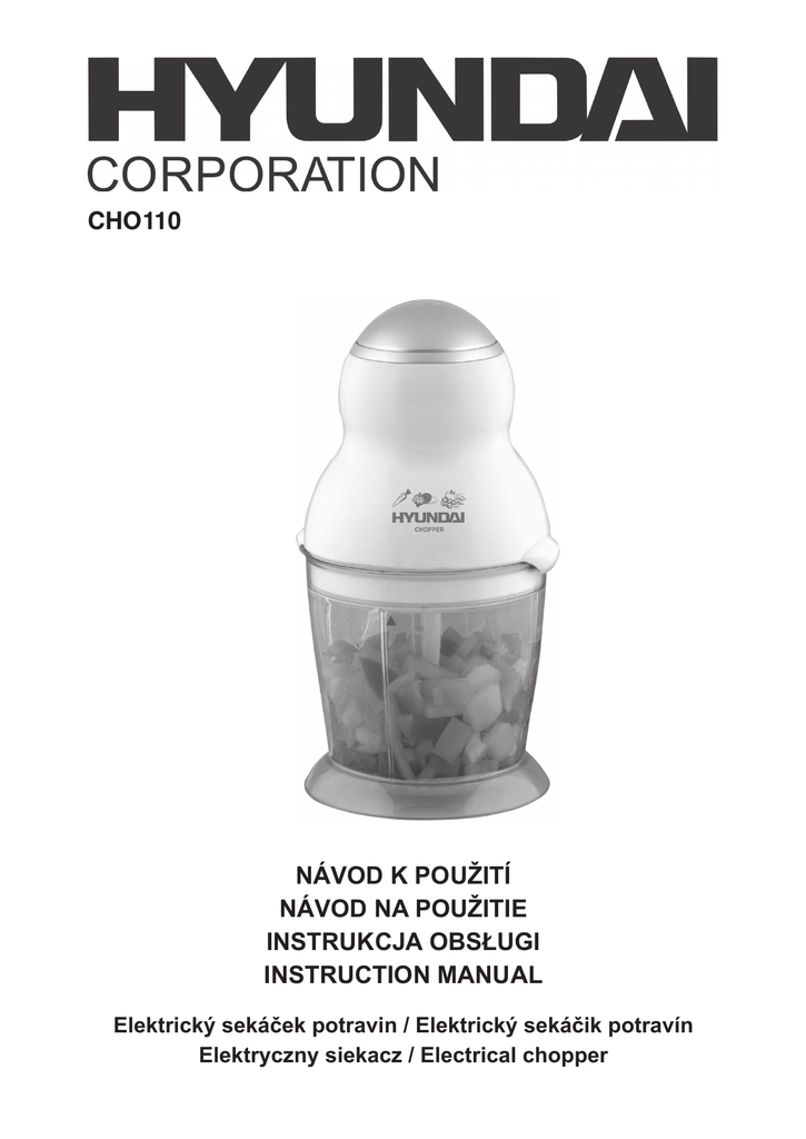 CHO110 NÁVOD K POUŽITÍ NÁVOD NA POUŽITIE INSTRUKCJA OBSŁUGI INSTRUCTION MANUAL Elektrický sekáček potravin / Elektrický sekáčik potravín Elektryczny siekacz / Electrical chopper Vážený zákazníku, děkujeme Vám za zakoupení našeho produktu. Před uvedením tohoto přístroje do provozu si velmi pozorně přečtěte návod k obsluze a tento návod spolu se záručním listem, pokladním dokladem a podle možností i s obalem a vnitřním obsahem obalu dobře uschovejte. Všeobecné bezpečnostní pokyny • Používejte tento přístroj výlučně pro soukromou potřebu a pro stanovené účely. Tento přístroj není určen pro komerční použití. • Chraňte ho před horkem, přímým slunečním zářením, vlhkostí (v žádném případě jej neponořujte do kapalin) a stykem s ostrými hranami. Nepoužívejte přístroj v případě, že máte vlhké ruce. Jestliže dojde k navlhčení nebo namočení přístroje, okamžitě vytáhněte zástrčku ze zásuvky. Vyvarujte se styku s vodou. • Přístroj vypněte a vždy vytáhněte zástrčku ze zásuvky (tahejte jen za zástrčku, nikdy ne za kabel), jestliže nebudete přístroj používat, chcete-li namontovat příslušenství, přístroj vyčistit nebo v případě poruchy. • Přístroj nesmí zůstat v provozu bez dozoru. Jestliže musíte pracoviště opustit, vždy přístroj vypněte, resp. vytáhněte zástrčku ze zásuvky (vždy tahejte za zástrčku, nikdy ne za kabel). • Abyste ochránili děti před riziky spojenými s elektrickými přístroji, postarejte se o to, aby kabel nevisel dolů a děti na přístroj nedosáhly. • Pravidelně kontrolujte přístroj a přívodní kabel z hlediska poškození. Jestliže přístroj vykazuje nějakou závadu, neuvádějte jej do provozu. • V případě selhání či nesprávné činnosti přístroj vypněte a nepokoušejte se ho sami opravit. Obraťte se na autorizovaný servis a žádejte originální náhradní díly. Nedodržení výše uvedeného může ovlivnit bezpečnost spotřebiče. • Používejte jen originální příslušenství. • Respektujte, prosím, následující „Speciální bezpečnostní pokyny pro tento přístroj“. Speciální bezpečnostní pokyny pro tento přístroj • Ujistěte se, že napájecí napětí je stejné jako je uvedeno na štítku přístroje. • Sekací nůž je velmi ostrý, zacházejte s ním opatrně. • Při sundávání a umývání sekacího nože jej uchopte za horní plastovou část. Abyste předešli vzniku nebezpečí, nedotýkejte se ho. • Přístroj nikdy nezapínejte, dokud není úplně a správně sestavený. Před vyjmutím z nádoby jej vypněte. • Před čistěním nádoby vyjměte sekací nůž. • Jednotku motoru neodpojujte před úplným zastavením sekací nůž. • Ukládejte přístroj mimo dosah dětí nebo nezpůsobilých osob. • Dávejte pozor, aby jednotka motoru, síťový kabel a zástrčka nebyly nikdy namočeny. • Kabel nepokládejte na horký povrch nebo neveďte přes hranu stolu. Děti se mohou poranit v případě, že se pokusí uchopit kabel a stáhnou přístroj ze stolu. • Přístroj je určen pouze pro domácí použití. Nepoužívejte přístroj pro jiné než určené použití. • Přístroj nikdy lehkomyslně neodkládejte. • Umělé materiály použité pro výrobu sekáčku jsou netoxické podle hygienických předpisů. • Přístroj nikdy nepoužívejte naprázdno. • Nepoužívejte přístroj, je-li mísa nádoba zcela naplněna vodou. CZ - CZ Popis ovládacích prvků P1 P2 P3 P4 P5 P6 P7 Jednotka motoru Mísa Sekací nůž Víko Hlavní spínač Unašeč nože Bezpečnostní uzavírání Pokyny k použití Před prvním použitím odstraňte prosím všechny obaly. Umyjte všechny části a příslušenství v horké vodě s čistícím prostředkem, opláchněte a osušte. Sekání potravin • Sekací nůž P3 vložte do mísy P2 a nasaďte na hřídel. Do nádoby vložte suroviny (rozkrájejte je na kostky 1x1 / 2x2 cm). • Na mísu vložte víko P4. • Jednotku motoru P1 umístěte na víko. Zkontrolujte správné usazení unašeče nože. Uzavřete mísu pootočením jednotky motoru. Správné usazení znázorňují šipky - musí být proti sobě. Motor se bez správného sestavení nerozběhne. • Připojte přístroj do zásuvky. Jakmile stisknete hlavní spínač P5, motor se spustí. • Jednotku motoru spouštěte přerušovaně pro opakované sekání, abyste dosáhli požadovaného výsledku. • Neběží-li přístroj plynule v míse je příliš mnoho surovin. Vysypte z nádoby části surovin. • Po uvolnění spínače se přístroj vypne. Počkejte do úplného zastavení otáčení sekacího nože. • Otočením jednotky motoru v opačném směru než při uzavírání jednotku uvolníte. Poté nadzvedněte víko a opatrně vyjměte sekací nůž. Nezpracovávejte kávová zrna, led a čokoládu, protože může dojít k poškození sekacího nože. Přístroj nenechávejte v chodu déle než 1 minutu. Je vhodné používat intervaly 10 sekund s následnými 10 sekundovými intervaly vypnutí motoru. Po minutovém chodu motoru ponechejte motor nejméně 3 minuty vychladnout, jinak může dojít k jeho poškození. Před čistěním vždy odpojte přístroj ze zásuvky. Příslušenství před umytím odmontujte. POZNÁMKA: Kryt a jednotka motoru by nemělo být vystavováno vysokým teplotám. Nikdy je nepoužívejte v mikrovlnné troubě. CZ - Doporučené postupy: SUROVINY SEKÁNÍ: SEKACÍ NŮŽ Petržel Cibule, šalotka Česnek Strouhanka Mandle, lískové ořechy, vlašský ořech Sýr Vejce natvrdo Šunka Maso Sušené meruňky Sušené švestky MIXOVÁNÍ: SEKACÍ NŮŽ Kynuté těsto Polévka Dětská kaše Koktejl MAXIMÁLNÍ MNOŽSTVÍ DOBA ZPRACOVÁNÍ 30 g 200 g 150 g 20 g 100 g 200 g 200 g 200 g 200 - 250 g 120 g 120 g 15 sekund 15 sekund pulsně 5 sekund 15 sekund 15 sekund 15 sekund 10 sek