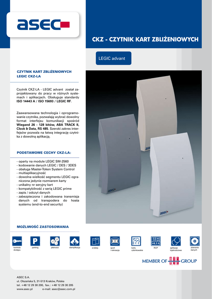 CKZ - czytnik kart ZBLIŻENIOWYCH LEGIC advant CZYTNIK KART ZBLIŻENIOWYCH LEGIC CKZ-LA Czytnik CKZ-LA - Legic advant został zaprojektowany do pracy w różnych systemach i aplikacjach. Obsługuje standardy ISO 14443 A / ISO 15693 / LEGIC RF. Zaawansowana technologia i oprogramowanie czytnika, pozwalają wybrać dowolny format interfejsu komunikacji spośród Wiegand 26 - 128 bitów, ABA TRACK II, Clock & Data, RS 485. Szeroki zakres interfejsów pozwala na łatwą integrację czytnika z dowolną aplikacją. Podstawowe cechy ckz-la: --oparty na module Legic SM-2560 --kodowanie danych LEGIC / DES / 3DES --obsługa Master-Token System Control --multiaplikacyjność --dowolna wielkość segmentu Legic ograniczona jedynie rozmiarem karty --unikalny nr seryjny kart --kompatybilność z serią LEGIC prime --zapis / odczyt danych --zabezpieczona i zakodowana transmisja danych od transpodera do hosta systemu (end-to-end security) Możliwość zastosowania kontrola dostępu parking płatności identyfikacja ASEC S.A. ul. Olszańska 5, 31-513 Kraków, Polska tel. +48 12 29 30 200, fax.: +48 12 29 30 205 www.asec.pl e-mail: [email protected] e-bilety sport i rekreacja karty członkowskie RCP aplikacje lojalnościowe zbieranie danych CKZ - bezstykowy czytnik kart DANE TECHNICZNE SYGNALIZACJA AUDIOWIZUALNA STANU PRACY Sygnalizacja optyczna – diody LED zielona i czerwona ze sterowaniem jednoliniowym lub dwuliniowym. Sygnalizacja beeper akustyczna – programowalny CKZ-LA Typ czytnika LEGIC: advant, prime / ISO 14443 A / ISO 15693 Typ transpondera 13.56 MHz Częstotliwość pracy RF 50–100 mm Zasięg odczytu 115×80×24 mm Wymiary 300 mm Długość kabla przyłączeniowego Zarówno diody LED jak i beeper mogą być sterowane lokalnie przez procesor czytnika jak i zdalnie przez kontroler. DC 7–14 V Zasilanie Wilgotność powietrza 0 – 95% Temperatura powietrza od – 35 do 45 °C 180 g Waga ZABEZPIECZENIA Linie we/wy posiadają zabezpieczenia przed wpływem zakłóceń zewnętrznych, w tym odwrotną polaryzacją i przepięciami. Maksymalna odległość od kontrolera (w zależności od użytego kabla) Wiegand - 150 m, RS485 - 1200 m Typ czytnika CKZ-LA Interfejsy we/wy i linie we/wy ŚRODOWISKO PRACY Wiegand Wodoodporna i estetyczna obudowa stworzona z wysokiej jakości materiałów pozwala na prostą instalację na każdym rodzaju powierzchni, zarówno na zewnątrz jak i wewnątrz budynków. W26 W34 WCF** RS 485 ASCII ASN2* BPA9 MONTAŻ Łatwy i szybki montaż na dowolnych powierzchniach w tym również metalowych (np. metalowe futryny drzwi). Zewnętrzna pokrywa czytnika montowana bez użycia narzędzi. RSCF** Clock & Data CD ABA TRACK II ABA przekaźnik 2A/24V NC/NO opcja Źródła danych KONSTRUKCJA Hermetyczna i wytrzymała obudowa z wysokiej jakości tworzywa ABS jest zaprojektowana i wykonana tak, aby sprostać każdym warunkom otoczenia. Zapewnia niezawodne użytkowanie i wysoką odporność na wandalizm. Precyzja wykonania i walory estetyczne umożliwiają wkomponowanie urządzenia w każde otoczenie. Numer seryjny UID N Kaba Group Header K LEGIC Access Pool A Format defioniowany CF** Kontrola LED Jednoliniowa 1 Dwuliniowa 2 115 mm Kolory obudowy - paleta Schulman’a Kość słoniowa – nr 82.672 1 Beżowy – nr 63.442 2 Szary – nr 60.062 3 Komputerowy – nr 63.312 4 * Format ASEC ** Format zdefiniowany INFORMACJE O ZAMÓWIENIU Typ produktu powinien być sprecyzowany w oparciu o powyższą tabelkę. Przykład: CKZ-LA 80 mm 24 mm Interfejs: W34 Certyfikaty FCC class B part 15, CE Źródła danych: S Kontrola LED: 2 Kolor: 3