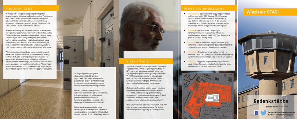 Więzienie “Stasi” Oferta dla zwiedzających W marcu 1951 r. więzienie zostało przejęte przez nowoutworzone Ministerstwo Bezpieczeństwa Publicznego (MfS) NRD - Stasi. W latach piećdziesiątych więziono tutaj wielu ludzi, którzy stawiali opór komunistycznej dyktaturze. Lista aresztowanych sięgała od powstańców z 17 czerwca 1953 r. po świadków Jehowy. Oprowadzenia Zorganizowane grupy mogą zwiedzać codzienne od godz. 9.00 do godz. 16.00 (uprasza się o uprzednie zameldowanie). Co najmniej trzy razy dziennie odbywają się obchody dla turystów indywidualnych. Istnieje możliwość oprowadzeia na życzenie po terenie byłego obszaru zamkniętego. Również komunistyczni zwolennicy reform przesiadywali miesiącami w celach, m.in. kierownik wydawnictwa Aufbau Walter Janka oraz popadły w niełaskę były minister spraw zagranicznych NRD Georg Dertinger (CDU). Nawet krytycy reżimu mieszkający na Zachodzie zostali przez MfS uprowadzeni i więzieni w Hohenschönhausen, jak zachodnioberlinski adwokat Walter Linse, który został w 1952 roku uprowadzony i rok później stracony w Moskwie. Wystawy Ekspozycja stała „Uwięziony w Hohenschönhausen: świadectwa politycznego prześladowania w latach 1945-1989“ jest dostępna w godz. 9:00-18:00. Wstęp wolny. Więźniowie sąsiedniego obozu pracy zostali zmuszeni pod koniec lat piećdziesiątych do wybudowania nowego budynku z ok. 200 celami i pokojami przesłuchań. Ten ogromny kompleks więzienny był częścią rozległego i tajnego obszaru zamkniętego, do którego w czasach NRD żaden zwyczajny obywatel nie miał wstępu. Wiezieni byli przede wszystkim ci, którzy próbowali uciec, wyjechać na Zachód bądź reprezentowali odmienne poglądy polityczne. Pamięć ofiar Przy kamieniu pamiątkowym, jak i w pobliskim DENKORT (miejscu przemyśleń) odbywają się regularnie składanie wieńców oraz obchody uroczystoci. Więzienie STASI Seminaria Dla uczniów oraz zorganizowanych grup oferowane są seminaria i projekty ze świadkami tamtych czasów (uprasza się o uprzednie zameldowanie). Miejsce Pamięci W miejsce przemocy fizycznej stosowano odtąd różne metody psychologiczne. Miejsce uwięzienia pozostawało celowo okryte tajemnicą. Systematycznie dawano więzionemu odczuć wszechmocną władzę państwa. Odcięci od świata zewnętrznego, całkowicie odizolowani od współwięźniów, byli oni miesiącami przesłuchiwani przez dobrze wykształconych funkcjonariuszy Stasi i zmuszani do obciążających siebie samych zeznań. Dopiero pokojowa rewolucja, która obaliła dyktaturę SED jesienią 1989 roku, doprowadziła do rozwiązania Ministerstwa Bezpieczeństwa Publicznego i jego więzień. Więzienie Hohenschönhausen zostało zamknięte 3 października 1990 r. po przystąpieniu NRD do RFN. Jego byli więźniowie wstawili się za tym, aby z byłego więzienia stworzyć Miejsce Pamięci. W 1992 roku rozległe więzienie przeszło pod ochronę zabytków, a dwa lata później utworzono tu Miejsce Pamięci. Od lipca 2000 roku jest samodzielną fundacją prawa publicznego. Księgarnia Księgarnia rozprowadza książki wydane przez Miejsce Pamięci, posiada również szeroką ofertę na temat historii dyktatur komunistycznych. Zadaniem instytucji jest według ustawy „badanie historii więzienia Hohenschönhausen w latach 1945-1989, informowanie poprzez wystawy, uroczystości i publikacje oraz inicjowanie dyskusji o formach i skutkach politycznego ucisku i prześladowania w komunistycznej dyktaturze“. Byłe więzienie Stasi odwiedza rocznie ok. 436.000 ludzi, z czego połowa to uczniowie. Po terenie więzienia oprowadzają z reguły byli więźniowie. Facebook “f ” Logo CMYK / .eps Facebook “f ” Logo CMYK / .eps facebook.com/StasiGefaengnis twitter.com/StasiGefaengnis Miejsce Pamięci BerlinHohenschönhausen Obóz Genslerstraße 66, 13055 Berlin Telefon 030 – 98 60 82 30 Telefaks 030 – 98 60 82 464 [email protected], www.stiftung-hsh.de Na terenie aresztu śledczego znajdowała się pierwotnie kuchnia przemysłowa Narodowosocjalistycznej Organizacji Dobroczynnej (NSV). Budynek z cegły ukończony w 1939 roku, został 1945 przejęty przez sowiecką władzę okupacyjną i zaadaptowany pod nazwą „Obóz Specjalny Nr 3”. Służył on jako obóz zbiorczy i przejściowy dla ok. 20.000 więźniów. Nr konta: Berliner Sparkasse BIC: BELADEBEXXX, IBAN: DE95 1005 0000 0190 2057 41 Zwiedzanie byłego więzienia jest tylko możliwe w ramach oprowadzenia z przewodnikiem. Warunki życiowe w obozie były katastrofalne. Na bardzo małej powierzchni stłaczano nawet do 4.200 osób, które cierpiały z powodu niedożywienia. Około 1.000 osób zmarło w wyniku panujących tu warunków. Ciała zmarłych grzebano na wysypiskach gruzu i w lejach po bombach. W centrum komunistycznej dyktatury Miejsce Pamięci Berlin-Hohenschönhausen jest miejscem, które jak żadne inne w Niemczech, jest związane z 44- letnią historią polityczego prześladowania w sowieckiej strefie okupacyjnej (SBZ) oraz NRD. Po II wojnie światowej utworzono tu sowiecki obóz dla internowanych, a następnie centralny sowiecki areszt śledczy na terenie Niemiec Wschodnich. Na początku 1951 roku więzienie przejęło Ministerstwo Bezpieczeństwa Publicznego (MfS) i wykorzystywało je jako centralny areszt śledczy do 1989 roku. Ministerstwo Bezpieczeństwa Publicznego (MfS) było tajną policją Socjalistycznej Partii Jedności Niemiec (SED) i jako jej „tarcza i miecz” najważniejszym instrumentem służącym do utrzymania komunistycznej dyktatury w NRD. W końcowej fazie służyło w „Stasi” 91.000 oficjalnych i 189.00 nieoficjalnych współpracowników odpowiedzialnych za inwigilację wschodnioniemieckiego społeczeństwa. Kto działał w opozycji lub próbował uciec na Zachód, ten znalazł się w jednym z 17 więzień MfS sterowanych przez centralę w Berlinie-Hohenschönhausen. Podstawą internowania był sowiecki rozkaz 00315 z kwietnia 1945 r