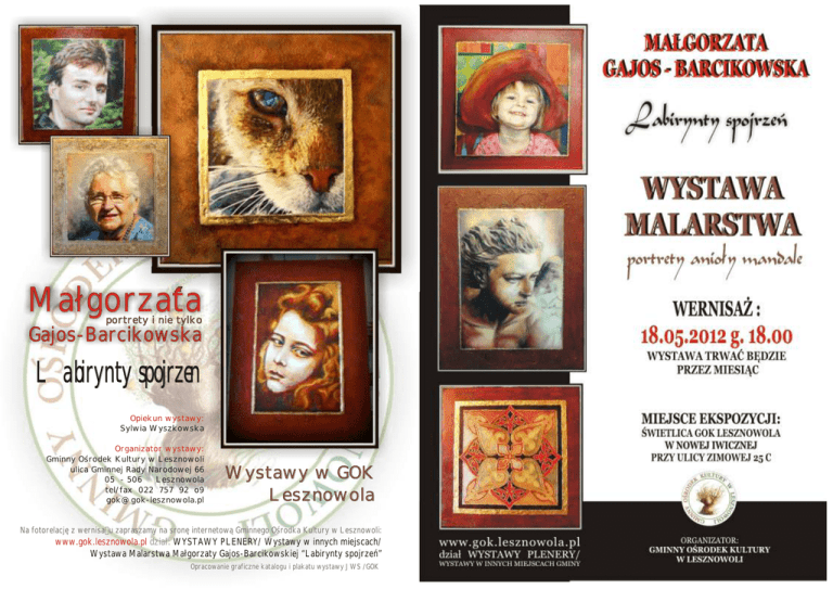 Małgorzata portrety i nie tylko Gajos-Barcikowska Labirynty spojrzen Opiekun wystawy: Sylwia Wyszkowska Organizator wystawy: Gminny Ośrodek Kultury w Lesznowoli ulica Gminnej Rady Narodowej 66 05 - 506 Lesznowola tel/fax 022 757 92 o9 [email protected] Wystawy w GOK Lesznowola Na fotorelację z wernisażu zapraszamy na sronę internetową Gminnego Ośrodka Kultury w Lesznowoli: www.gok.lesznowola.pl dział: WYSTAWY PLENERY/ Wystawy w innych miejscach/ Wystawa Malarstwa Małgorzaty Gajos-Barcikowskiej “Labirynty spojrzeń” Opracowanie graficzne katalogu i plakatu wystawy JWS /GOK Małgorzata Gajos wystawa malarstwa Barcikowska Małgorzata Gajos Barcikowska Projektantka wnętrz, mebli i ...malarka Malarstwo i projektowanie wnętrz uzupełniają się tworzą świat barw i światła. Obie dziedziny zawsze były moja pasją, wielką przygodą życia, umożliwiającą realizację marzeń i oderwanie się od codzienności. Maluję z wewnętrznej potrzeby odnalezienia siebie, a więc z konieczności choć przynosi to ogromną przyjemność. Pierwsze kroki w tej dziedzinie stawiałam pod czujnym okiem prof. Wojciecha Czapskiego następne to moja własna droga. Technika jest sumą doświadczeń zdobytych w mojej praktyce projektanta wnętrz: malowania na tynku, wspólnej pracy w pracowniach ebenistów realizujących moje projekty, pracy nad światłem wydobywającym walory kolorów z wnętrz i przedmiotów użytkowych. Magia pozłotnictwa żmudna i ucząca cierpliwości przy przywracaniu świetności starym przedmiotom. Właśnie dzięki wiedzy nabytej na różnych etapach podczas tworzenia wnętrz i mebli, tematyka moich prac ulegała ewolucji i wzbogaciła się o nowe formy. Znaki, symbole, krzyże to piękny mistyczny świat. Urzeka magią i lakonicznym zapisem. Znajduję je w różnych miejscach głównie w czasie wyjazdów wakacyjnych. Przenosząc na obrazy nadaje im kolor i fakturę tak zamknięte, często są uzupełnieniem moich projektów wnętrz. Tworzeniu mandali towarzyszy wyciszenie umysłu. To rodzaj medytacji, wyprawa w głąb psychiki, spotkanie z jaźnią. W najszerszym znaczeniu mandale są diagramami , które ukazują w jaki sposób chaos przybiera formę harmonii. Przemawiają językiem uniwersalnym i prostym. Jest to komunikacja przez sztukę, wibrację formy, koloru i symboli zawartych wewnątrz mandali. Kolejnym krokiem stały się portrety. Portret jest ciepłym wspomnieniem przeszłości. Malowanie portretów to odkrywanie tajemnicy o drugim człowieku: tkwiącej za jego spojrzeniem, pod rysami twarzy i pod emocjami. Ostatnia prezentowana na wernisażu forma to Anioły. Niezależnie od naszej wiary podziwiamy je na obrazach, w rzeźbach, zastygłych w świątyniach i cmentarnych figurach. Wyrażają nasze tęsknoty, zadumę nad losem i życiem, ale również uśmiech pociechy wsparcia w trudnych chwilach. Moje obrazy to moja droga przez LABIRYNT SPOJRZEŃ - zapraszam. www.gok.lesznowola.pl Małgorzata Gajos - Barcikowska Obrazy autorstwa Małgorzaty Gajos - Barcikowskiej Wystawy w GOK Lesznowola - świetlica GOK w Nowej Iwicznej