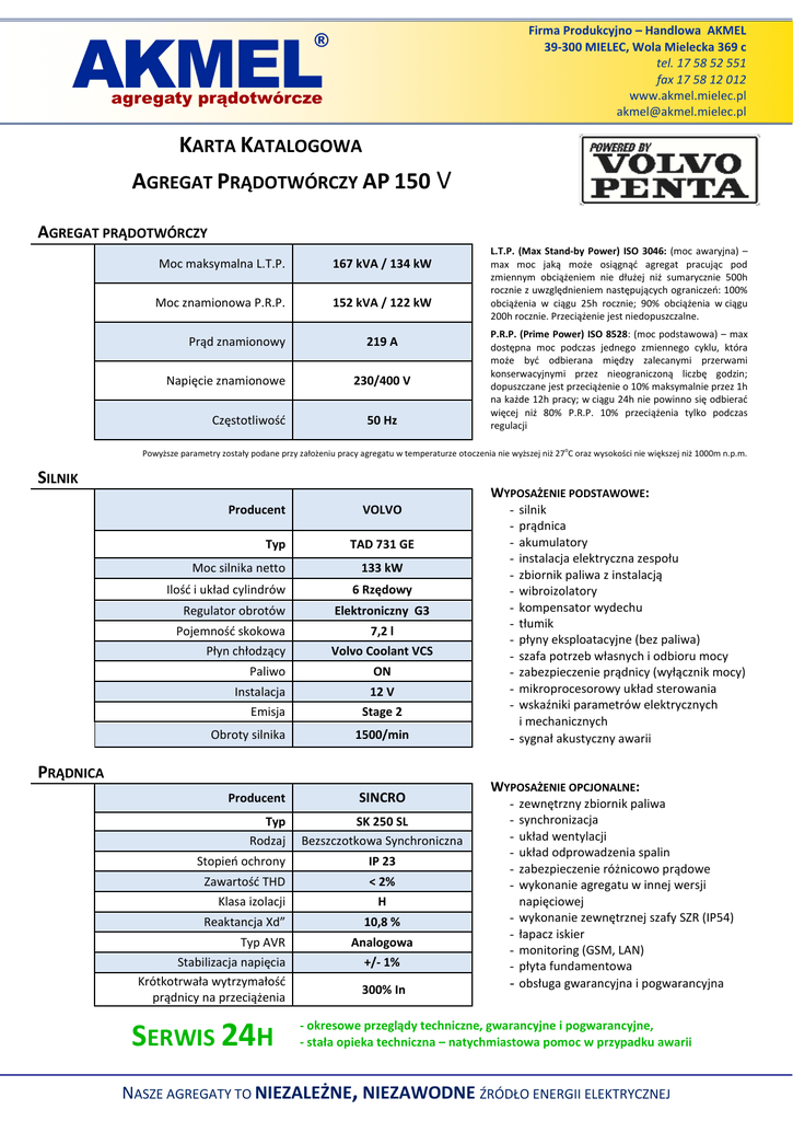AKMEL Firma Produkcyjno – Handlowa AKMEL 39-300 MIELEC, Wola Mielecka 369 c tel. 17 58 52 551 fax 17 58 12 012 www.akmel.mielec.pl [email protected] ® agregaty prądotwórcze KARTA KATALOGOWA AGREGAT PRĄDOTWÓRCZY AP 150 V AGREGAT PRĄDOTWÓRCZY Moc maksymalna L.T.P. 167 kVA / 134 kW Moc znamionowa P.R.P. 152 kVA / 122 kW Prąd znamionowy Napięcie znamionowe Częstotliwość 219 A 230/400 V 50 Hz L.T.P. (Max Stand-by Power) ISO 3046: (moc awaryjna) – max moc jaką może osiągnąć agregat pracując pod zmiennym obciążeniem nie dłużej niż sumarycznie 500h rocznie z uwzględnieniem następujących ograniczeń: 100% obciążenia w ciągu 25h rocznie; 90% obciążenia w ciągu 200h rocznie. Przeciążenie jest niedopuszczalne. P.R.P. (Prime Power) ISO 8528: (moc podstawowa) – max dostępna moc podczas jednego zmiennego cyklu, która może być odbierana między zalecanymi przerwami konserwacyjnymi przez nieograniczoną liczbę godzin; dopuszczane jest przeciążenie o 10% maksymalnie przez 1h na każde 12h pracy; w ciągu 24h nie powinno się odbierać więcej niż 80% P.R.P. 10% przeciążenia tylko podczas regulacji Powyższe parametry zostały podane przy założeniu pracy agregatu w temperaturze otoczenia nie wyższej niż 27oC oraz wysokości nie większej niż 1000m n.p.m. SILNIK WYPOSAŻENIE PODSTAWOWE: Producent Typ Moc silnika netto Ilość i układ cylindrów VOLVO TAD 731 GE 133 kW 6 Rzędowy Regulator obrotów Elektroniczny G3 Pojemność skokowa 7,2 l Płyn chłodzący Volvo Coolant VCS Paliwo ON Instalacja 12 V Emisja Stage 2 Obroty silnika 1500/min Producent SINCRO PRĄDNICA Typ Rodzaj SK 250 SL Bezszczotkowa Synchroniczna Stopień ochrony IP 23 Zawartość THD < 2% Klasa izolacji Reaktancja Xd” Typ AVR Stabilizacja napięcia Krótkotrwała wytrzymałość prądnicy na przeciążenia SERWIS 24H silnik prądnica akumulatory instalacja elektryczna zespołu zbiornik paliwa z instalacją wibroizolatory kompensator wydechu tłumik płyny eksploatacyjne (bez paliwa) szafa potrzeb własnych i odbioru mocy zabezpieczenie prądnicy (wyłącznik mocy) mikroprocesorowy układ sterowania wskaźniki parametrów elektrycznych i mechanicznych - sygnał akustyczny awarii - WYPOSAŻENIE OPCJONALNE: - H +/- 1% - 300% In - 10,8 % Analogowa zewnętrzny zbiornik paliwa synchronizacja układ wentylacji układ odprowadzenia spalin zabezpieczenie różnicowo prądowe wykonanie agregatu w innej wersji napięciowej wykonanie zewnętrznej szafy SZR (IP54) łapacz iskier monitoring (GSM, LAN) płyta fundamentowa obsługa gwarancyjna i pogwarancyjna - okresowe przeglądy techniczne, gwarancyjne i pogwarancyjne, - stała opieka techniczna – natychmiastowa pomoc w przypadku awarii NASZE AGREGATY TO NIEZALEŻNE, NIEZAWODNE ŹRÓDŁO ENERGII ELEKTRYCZNEJ AKMEL ® agregaty prądotwórcze GWARANCJA! Praca ciągła – 12 miesięcy bez limitu motogodzin Praca awaryjna – 60 miesięcy z limitem 1000 motogodzin PARAMETRY AGREGATU NIEOBUDOWANEGO – OTWARTEGO PARAMETRY AGREGATU W OBUDOWIE WYCISZONEJ Długość Szerokość Wysokość Masa Pojemność zbiornika paliwa Moc akustyczna LwA Wymiary chłodnicy wys./szer. Odległość chłodnicy od podłoża Średnica wydechu o przy 7mb i 4 kolanach 90 2 310 mm 1 110 mm 1 637 mm 1 515 kg 250 l Długość Szerokość Wysokość Masa Pojemność zbiornika paliwa Moc akustyczna LwA ciśnienie akustyczne LpAM z1 mb 118,1 ± 0,8 dB* - /- mm - mm 114,3 mm 3 650 mm 1 512 mm 1 812 mm 2 480 kg 310 l 97 dB** 67 dB * - agregat do zabudowy, wymaga zastosowania dodatkowego wyciszenia, ** - spełnia wymagania dyrektywy 2005/88/we dla urządzeń pracujących na zewnątrz WERSJE RG – nieobudowany, sterowanie ręczne, układ podgrzewania bloku silnika AG – nieobudowany, start automatyczny (zdolność przyjęcia sygnału zdalnego startu), ładowarka akumulatorów, układ podgrzewania bloku silnika RCG – obudowa atmosferyczna, sterowanie ręczne, układ podgrzewania bloku silnika ACG – obudowa atmosferyczna, start automatyczny (zdolność przyjęcia sygnału zdalnego startu), ładowarka akumulatorów, układ podgrzewania bloku silnika Rodzaje wykonań: Na ramie - otwarty - agregat przeznaczony do zabudowy w pomieszczeniu, wymaga wykonania układu wentylacji i odprowadzania spalin W obudowie dźwiękochłonnej, odpornej na czynniki atmosferyczne - agregat można stosować w warunkach zewnętrznych, wymaga posadowienia na utwardzonym i wypoziomowanym podłożu np. płyta fundamentowa. Instalacja w pomieszczeniu wymaga wykonania dodatkowej instalacji wentylacyjnej i spalinowej. Obudowy wykonane są z blachy powlekanej alucynkiem. W kontenerze - alternatywa pomieszczenia dla agregatów przeznaczonych do zabudowy. Może występować w wersji wyciszonej lub niewyciszonej, w rozmiarach 20' i 40'. Znormalizowane wymiary ułatwiają ich transport lądowy i morski. Standardowo stosowane są do jednostek powyżej 1000 kVA, opcjonalnie istnieje możliwość zabudowy mniejszych agregatów. Przewoźne z masztem oświetleniowym - maszty oświetleniowe mogą być EKSPLOATACJA Rodzaj oleju Ilość oleju w układzie smarowania Zużycie oleju na 1 kW Shell Rimulla R4L 20 l --- % Rodzaj płynu chłodzącego Volvo Coolant VCS Ilość płynu chłodzącego 23,8 l Okres pomiędzy wymianami płynu Zgodność paliwa z normą Pojemność akumulatora rozruchowego Wymiana filtrów paliwa Wymiana oleju i filtrów oleju Wymiary płyty fundamentowej (zbrojonej) Zużycie paliwa przy obciążeniu 100% Zużycie paliwa przy obciążeniu 75% 500 Rh /2 lata EN 590 500 Rh 500 Rh dł. / szer. 3100 / 1300 mm 34 l/h 25,7 /h Zużycie paliwa przy obciążeniu 50% 17 l/h 2x100 Ah zainstalowane do każdego agregatu w wersji obudowanej lub kontenerowej. W ofercie występują dwa rodzaje masztów: wysuwany ręcznie o wysokości 7m oraz pneumatycznie o wysokości 9m. Ilość oraz moc źródła światła zainstalowanych lamp odpowiadają zapotrzebowaniu Klienta. Na podwoziu jezdnym - homologowane, zabezpieczone a