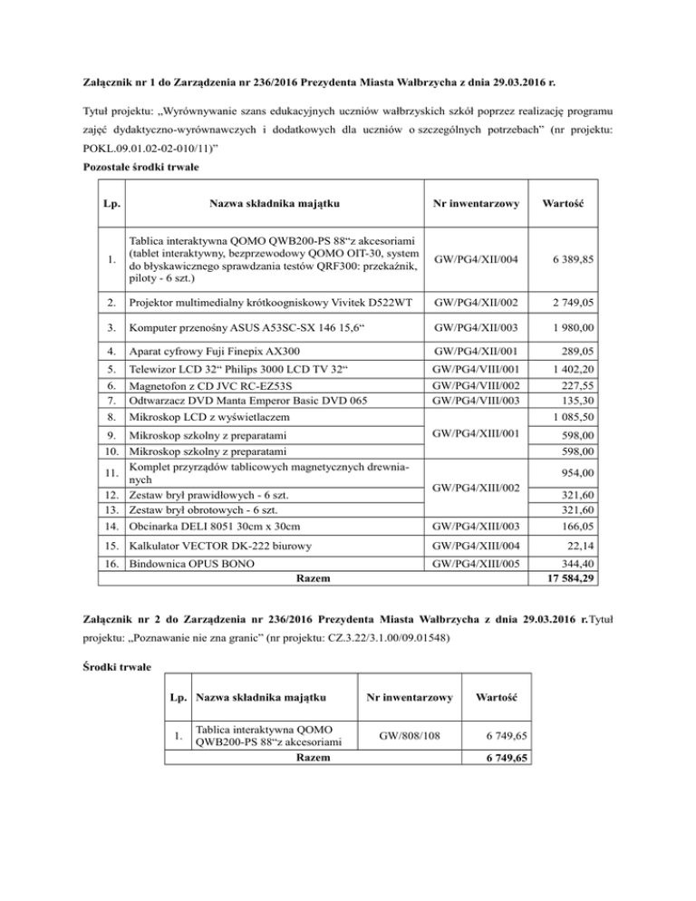 Załącznik nr 1 do Zarządzenia nr 236/2016 Prezydenta Miasta Wałbrzycha z dnia 29.03.2016 r. Tytuł projektu: „Wyrównywanie szans edukacyjnych uczniów wałbrzyskich szkół poprzez realizację programu zajęć dydaktyczno-wyrównawczych i dodatkowych dla uczniów o szczególnych potrzebach” (nr projektu: POKL.09.01.02-02-010/11)” Pozostałe środki trwałe Lp. Nazwa składnika majątku Nr inwentarzowy Wartość 1. Tablica interaktywna QOMO QWB200-PS 88“z akcesoriami (tablet interaktywny, bezprzewodowy QOMO OIT-30, system do błyskawicznego sprawdzania testów QRF300: przekaźnik, piloty - 6 szt.) GW/PG4/XII/004 6 389,85 2. Projektor multimedialny krótkoogniskowy Vivitek D522WT GW/PG4/XII/002 2 749,05 3. Komputer przenośny ASUS A53SC-SX 146 15,6“ GW/PG4/XII/003 1 980,00 4. Aparat cyfrowy Fuji Finepix AX300 GW/PG4/XII/001 289,05 5. Telewizor LCD 32“ Philips 3000 LCD TV 32“ GW/PG4/VIII/001 1 402,20 6. 7. Magnetofon z CD JVC RC-EZ53S Odtwarzacz DVD Manta Emperor Basic DVD 065 GW/PG4/VIII/002 GW/PG4/VIII/003 227,55 135,30 8. Mikroskop LCD z wyświetlaczem 9. Mikroskop szkolny z preparatami 1 085,50 GW/PG4/XIII/001 10. Mikroskop szkolny z preparatami Komplet przyrządów tablicowych magnetycznych drewnia11. nych 12. Zestaw brył prawidłowych - 6 szt. 13. Zestaw brył obrotowych - 6 szt. 598,00 598,00 954,00 GW/PG4/XIII/002 321,60 321,60 14. Obcinarka DELI 8051 30cm x 30cm GW/PG4/XIII/003 166,05 15. Kalkulator VECTOR DK-222 biurowy GW/PG4/XIII/004 22,14 16. Bindownica OPUS BONO GW/PG4/XIII/005 344,40 17 584,29 Razem Załącznik nr 2 do Zarządzenia nr 236/2016 Prezydenta Miasta Wałbrzycha z dnia 29.03.2016 r.Tytuł projektu: „Poznawanie nie zna granic” (nr projektu: CZ.3.22/3.1.00/09.01548) Środki trwałe Lp. Nazwa składnika majątku 1. Tablica interaktywna QOMO QWB200-PS 88“z akcesoriami Razem Nr inwentarzowy GW/808/108 Wartość 6 749,65 6 749,65 Załącznik nr 3 do Zarządzenia nr 236/2016 Prezydenta Miasta Wałbrzycha z dnia 29.03.2016 r. Tytuł projektu: „Wyrównywanie szans edukacyjnych uczniów wałbrzyskich szkół poprzez realizację programu zajęć dydaktyczno-wyrównawczych i dodatkowych dla uczniów o szczególnych potrzebach” (nr projektu: POKL.09.01.02-02-010/11)” Wartości niematerialne i prawne. Lp. Nazwa składnika majątku Nr inwentarzowy Wartość 1. Program OEM 79G-02036 Microsoft Office 2010 Home & Student PL GW/I/006 381,30 2. Voices 1 Interactive Classroom - Oprogramowanie tablicy interaktywnej GW/I/012 850,00 3. Voices 2 Interactive Classroom - Oprogramowanie tablicy interaktywnej GW/I/013 850,00 Razem 2 081,30