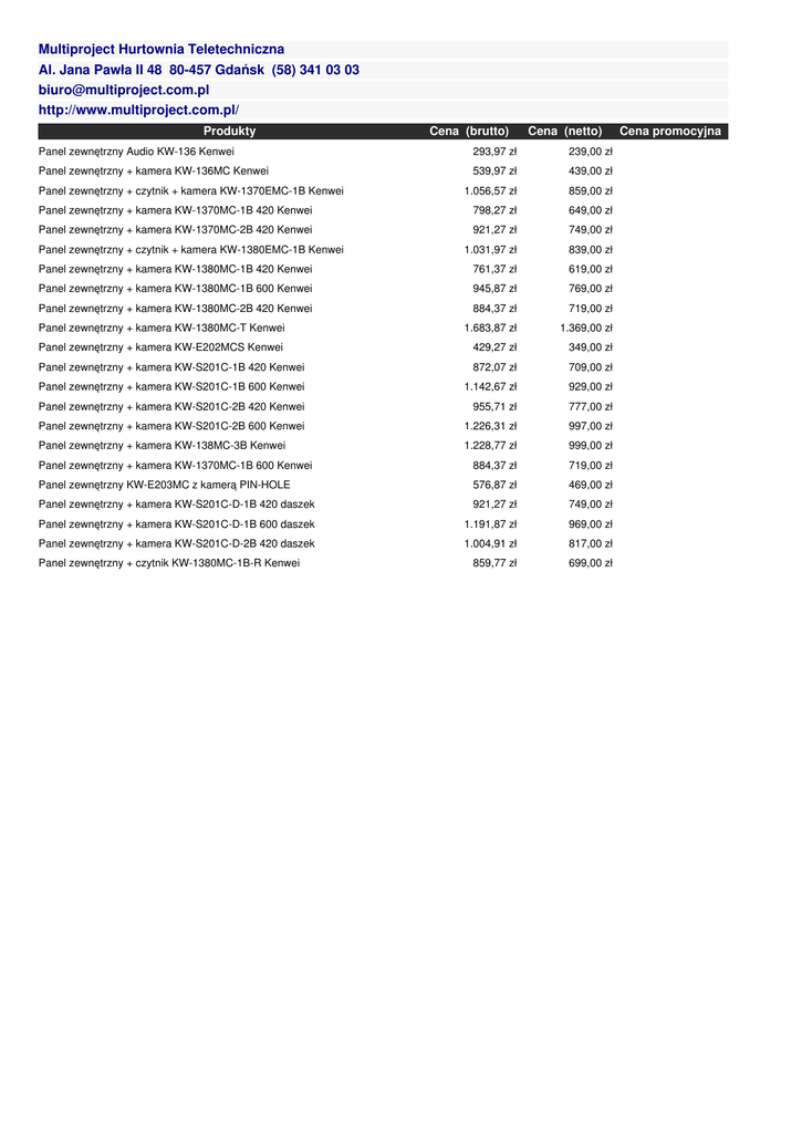Multiproject Hurtownia Teletechniczna Al. Jana Pawła II 48 80-457 Gdańsk (58) 341 03 03 [email protected] http://www.multiproject.com.pl/ Produkty Cena (brutto) Cena (netto) Panel zewnętrzny Audio KW-136 Kenwei 293,97 zł 239,00 zł Panel zewnętrzny + kamera KW-136MC Kenwei 539,97 zł 439,00 zł Panel zewnętrzny + czytnik + kamera KW-1370EMC-1B Kenwei 1.056,57 zł 859,00 zł Panel zewnętrzny + kamera KW-1370MC-1B 420 Kenwei 798,27 zł 649,00 zł Panel zewnętrzny + kamera KW-1370MC-2B 420 Kenwei 921,27 zł 749,00 zł Panel zewnętrzny + czytnik + kamera KW-1380EMC-1B Kenwei 1.031,97 zł 839,00 zł Panel zewnętrzny + kamera KW-1380MC-1B 420 Kenwei 761,37 zł 619,00 zł Panel zewnętrzny + kamera KW-1380MC-1B 600 Kenwei 945,87 zł 769,00 zł Panel zewnętrzny + kamera KW-1380MC-2B 420 Kenwei 884,37 zł 719,00 zł Panel zewnętrzny + kamera KW-1380MC-T Kenwei 1.683,87 zł 1.369,00 zł Panel zewnętrzny + kamera KW-E202MCS Kenwei 429,27 zł 349,00 zł Panel zewnętrzny + kamera KW-S201C-1B 420 Kenwei 872,07 zł 709,00 zł Panel zewnętrzny + kamera KW-S201C-1B 600 Kenwei 1.142,67 zł 929,00 zł Panel zewnętrzny + kamera KW-S201C-2B 420 Kenwei 955,71 zł 777,00 zł Panel zewnętrzny + kamera KW-S201C-2B 600 Kenwei 1.226,31 zł 997,00 zł Panel zewnętrzny + kamera KW-138MC-3B Kenwei 1.228,77 zł 999,00 zł Panel zewnętrzny + kamera KW-1370MC-1B 600 Kenwei 884,37 zł 719,00 zł Panel zewnętrzny KW-E203MC z kamerą PIN-HOLE 576,87 zł 469,00 zł Panel zewnętrzny + kamera KW-S201C-D-1B 420 daszek 921,27 zł 749,00 zł Panel zewnętrzny + kamera KW-S201C-D-1B 600 daszek 1.191,87 zł 969,00 zł Panel zewnętrzny + kamera KW-S201C-D-2B 420 daszek 1.004,91 zł 817,00 zł 859,77 zł 699,00 zł Panel zewnętrzny + czytnik KW-1380MC-1B-R Kenwei Cena promocyjna