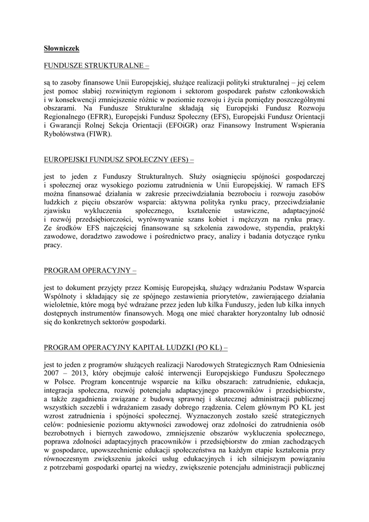 Słowniczek FUNDUSZE STRUKTURALNE – są to zasoby finansowe Unii Europejskiej, służące realizacji polityki strukturalnej – jej celem jest pomoc słabiej rozwiniętym regionom i sektorom gospodarek państw członkowskich i w konsekwencji zmniejszenie różnic w poziomie rozwoju i życia pomiędzy poszczególnymi obszarami. Na Fundusze Strukturalne składają się Europejski Fundusz Rozwoju Regionalnego (EFRR), Europejski Fundusz Społeczny (EFS), Europejski Fundusz Orientacji i Gwarancji Rolnej Sekcja Orientacji (EFOiGR) oraz Finansowy Instrument Wspierania Rybołówstwa (FIWR). EUROPEJSKI FUNDUSZ SPOŁECZNY (EFS) – jest to jeden z Funduszy Strukturalnych. Służy osiągnięciu spójności gospodarczej i społecznej oraz wysokiego poziomu zatrudnienia w Unii Europejskiej. W ramach EFS można finansować działania w zakresie przeciwdziałania bezrobociu i rozwoju zasobów ludzkich z pięciu obszarów wsparcia: aktywna polityka rynku pracy, przeciwdziałanie zjawisku wykluczenia społecznego, kształcenie ustawiczne, adaptacyjność i rozwój przedsiębiorczości, wyrównywanie szans kobiet i mężczyzn na rynku pracy. Ze środków EFS najczęściej finansowane są szkolenia zawodowe, stypendia, praktyki zawodowe, doradztwo zawodowe i pośrednictwo pracy, analizy i badania dotyczące rynku pracy. PROGRAM OPERACYJNY – jest to dokument przyjęty przez Komisję Europejską, służący wdrażaniu Podstaw Wsparcia Wspólnoty i składający się ze spójnego zestawienia priorytetów, zawierającego działania wieloletnie, które mogą być wdrażane przez jeden lub kilka Funduszy, jeden lub kilka innych dostępnych instrumentów finansowych. Mogą one mieć charakter horyzontalny lub odnosić się do konkretnych sektorów gospodarki. PROGRAM OPERACYJNY KAPITAŁ LUDZKI (PO KL) – jest to jeden z programów służących realizacji Narodowych Strategicznych Ram Odniesienia 2007 – 2013, który obejmuje całość interwencji Europejskiego Funduszu Społecznego w Polsce. Program koncentruje wsparcie na kilku obszarach: zatrudnienie, edukacja, integracja społeczna, rozwój potencjału adaptacyjnego pracowników i przedsiębiorstw, a także zagadnienia związane z budową sprawnej i skutecznej administracji publicznej wszystkich szczebli i wdrażaniem zasady dobrego rządzenia. Celem głównym PO KL jest wzrost zatrudnienia i spójności społecznej. Wyznaczonych zostało sześć strategicznych celów: podniesienie poziomu aktywności zawodowej oraz zdolności do zatrudnienia osób bezrobotnych i biernych zawodowo, zmniejszenie obszarów wykluczenia społecznego, poprawa zdolności adaptacyjnych pracowników i przedsiębiorstw do zmian zachodzących w gospodarce, upowszechnienie edukacji społeczeństwa na każdym etapie kształcenia przy równoczesnym zwiększeniu jakości usług edukacyjnych i ich silniejszym powiązaniu z potrzebami gospodarki opartej na wiedzy, zwiększenie potencjału administracji publicznej w zakresie opracowywania polityk i świadczenia usług, wzrost spójności terytorialnej. Program jest finansowany w 85% ze środków Europejskiego Funduszu Społecznego oraz w 15% ze środków krajowych. W ramach PO KL jest możliwość realizacji projektów w dwóch trybach: systemowym i konkursowym. W pierwszym przypadku projekty są realizowane przez beneficjentów imiennie wskazanych w Programie lub dodatkowych dokumentach. W przypadku projektów konkursowych projekty mogą być realizowane przez takie podmioty jak: instytucje rynku pracy, instytucje szkoleniowe, jednostki administracji rządowej i samorządowej, przedsiębiorcy, instytucje otoczenia biznesu, organizacje pozarządowe, instytucje systemu oświaty i szkoleniowa wyższego. Program składa się z 10 Priorytetów, realizowanych zarówno na poziomie centralnym, jak i regionalnym. W ramach komponentu centralnego środki zostaną przeznaczone przede wszystkim na wsparcie efektywności struktur i systemów instytucjonalnych, natomiast środki komponentu regionalnego zostaną w głównej mierze przeznaczone na wsparcie dla osób i grup społecznych. PROJEKT – to przedsięwzięcie realizowane w ramach działania, będące przedmiotem umowy o dofinansowanie projektu między beneficjentem a instytucją zarządzającą, instytucją wdrażającą lub działającą w imieniu instytucji zarządzającej instytucją pośredniczącą, albo przedmiotem decyzji podjętej odpowiednio przez właściwego ministra, jeśli pełni funkcję instytucji zarządzającej lub pośredniczącej, bądź przez wojewodę, jeśli pełni funkcję instytucji pośredniczącej. EUROPEJSKA STRATEGIA ZATRUDNIENIA – to wspólna strategia zatrudnienia, w ramach której państwa członkowskie Unii Europejskiej przyczyniają się swoimi politykami zatrudnienia do osiągnięcia wspólnych celów. Te cele to: pełne zatrudnienie, poprawa jakości i produktywności pracy oraz wzmocnienie spójności społecznej i integracji. POLITYKA STRUKTURALNA – jest to zakres odpowiedzialności państw członkowskich i Komisji Europejskiej w ramach dzielonego zarządzania funduszami strukturalnymi i Funduszem Spójności. POLITYKA SPÓJNOŚCI UNII EUROPEJSKIEJ – Jest to polityka ustanowiona Traktatem o Wspólnocie Europejskiej (art. 158), służąca wzmocnieniu spójności gospodarczej i społecznej w Unii Europejskiej poprzez zmniejszenie dysproporcji w poziomie rozwoju różnych regionów oraz zacofania regionów lub wysp mniej uprzywilejowanych, w tym sfer wiejskich. Unia Europejska w swojej polityce regionalnej dąży do podwyższenia poziomu spójności gospodarczej, społecznej i terytorialnej. Każda z tych spójności jest analizowana w układzie państw oraz regionów typu NUTS II i NUTS III (kodowanie stosowane w Unii Europejskiej). Spójność gospodarcza jest mierzona za pomocą produktu krajowego brutto na mieszkańca, uwzględniając parytet siły nabywczej. Wzrost spójności gospodarczej polega na zmniejszeniu zróżnicowań w poziomie rozwoju gosp
