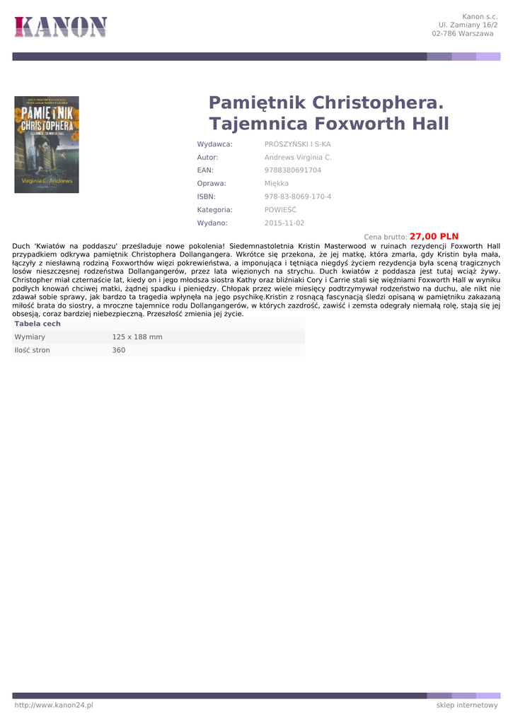 Kanon s.c. Ul. Zamiany 16/2 02-786 Warszawa Pamiętnik Christophera. Tajemnica Foxworth Hall Wydawca: PRÓSZYŃSKI I S-KA Autor: Andrews Virginia C. EAN: 9788380691704 Oprawa: Miękka ISBN: 978-83-8069-170-4 Kategoria: POWIEŚĆ Wydano: 2015-11-02 Cena brutto: 27,00 PLN Duch 'Kwiatów na poddaszu' prześladuje nowe pokolenia! Siedemnastoletnia Kristin Masterwood w ruinach rezydencji Foxworth Hall przypadkiem odkrywa pamiętnik Christophera Dollangangera. Wkrótce się przekona, że jej matkę, która zmarła, gdy Kristin była mała, łączyły z niesławną rodziną Foxworthów więzi pokrewieństwa, a imponująca i tętniąca niegdyś życiem rezydencja była sceną tragicznych losów nieszczęsnej rodzeństwa Dollangangerów, przez lata więzionych na strychu. Duch kwiatów z poddasza jest tutaj wciąż żywy. Christopher miał czternaście lat, kiedy on i jego młodsza siostra Kathy oraz bliźniaki Cory i Carrie stali się więźniami Foxworth Hall w wyniku podłych knowań chciwej matki, żądnej spadku i pieniędzy. Chłopak przez wiele miesięcy podtrzymywał rodzeństwo na duchu, ale nikt nie zdawał sobie sprawy, jak bardzo ta tragedia wpłynęła na jego psychikę.Kristin z rosnącą fascynacją śledzi opisaną w pamiętniku zakazaną miłość brata do siostry, a mroczne tajemnice rodu Dollangangerów, w których zazdrość, zawiść i zemsta odegrały niemałą rolę, stają się jej obsesją, coraz bardziej niebezpieczną. Przeszłość zmienia jej życie. Tabela cech Wymiary 125 x 188 mm Ilość stron 360 http://www.kanon24.pl sklep internetowy