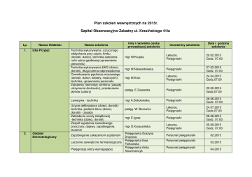 Plan szkoleń wewnętrznych na 2015r. Szpital Obserwacyjno-Zakaźny ul. Krasińskiego 4/4a Lp. 1. Nazwa Oddziału Izba Przyjęć Nazwa szkolenia Technika wykonywania sztucznego oddychania przy użyciu Ambu (dorośli, dzieci), technika założenia rurki ustno-gardłowej (uprawnienia personelu) Technika wykonywania EKG (dzieci, dorośli), długa taśma-odprowadzenia Cewnikowanie pęcherza moczowego (dorośli, dzieci; kobiety, mężczyźni)technika, uprawnienia personelu Założenie (technika) venflonu (zasady utrzymania drożności), przetaczanie płynów (zatory) Lewatywa - technika Użycie defibrylatora (dzieci, dorośli)technika, podanie tlenu (dzieci, dorośli) - zasady Zakładanie sondy żołądkowej -technika (dzieci, dorośli) Zespół wypalenia zawodowegoprzyczyny, objawy, zapobieganie, leczenie 2. Oddział Dermatologiczny Zapobieganie zakażeniom szpitalnym Leczenie zewnętrzne farmakologiczne Pielęgnacja skóry wymagającej Imię i nazwisko osoby prowadzącej szkolenie Uczestnicy szkolenia Data i godzina szkolenia mgr W.Krupka Lekarze, Pielęgniarki 20.02.2015 Godz. 07.00 mgr M.Niewiadowska Pielęgniarki 27.03.2015 Godz. 07.00 mgr M.Kruk Lekarze, Pielęgniarki 24.04.2015 Godz.07.00 pielęg. E.Zujewska Pielęgniarki 22.05.2015 Godz.07.00 mgr A.Sokołowska Pielęgniarki 26.06.2015 Godz. 07.00 pielęg. W. Borowicz Lekarze, Pielęgniarki 24.07.2015 Godz.07.00 mgr E.Igras Pielęgniarki 28.08.2015 Godz. 07.00 mgr D.Korpusińska Lekarze, Pielęgniarki 25.09.2015 Godz. 07.00 Pielęgniarka Grażyna Drojecka Pielęgniarka Ewa Falkowska Pielęgniarka Anita Kaczmarczyk Personel pielęgniarski Personel pielęgniarski Personel pielęgniarski 02.2015 03.2015 04.2015 Owrzodzenia podudzi – edukacja pacjenta Jakość życia pacjentów z łuszczycą Izolacja pacjenta w Oddziale Dermatologicznym Wpływ diety na przebieg i leczenie chorób skóry Stany zagrożenia życia w dermatologii Choroby przenoszone drogą płciową 3. Oddział Hepatologiczny Zapalenie wątroby wywoływane infekcją cytomegalowirusową Mononukleoza zakaźna i inne stany chorobowe związane z zakażeniem wirusem Epstein-Barr Personel pielęgniarski Personel pielęgniarski Personel pielęgniarski Personel pielęgniarski Personel pielęgniarski 05.2015 06.2015 09.2015 10.2015 11.2015 12.2015 Personel Pielęgniarski Oddziału Hepatologicznego 12.03.2015 mgr Grażyna Kolonko Personel Pielęgniarski Oddziału Hepatologicznego 14.05.2015 mgr Małgorzata Dąbrowska Personel Pielęgniarski Oddziału Hepatologicznego 17.09.2015 Edyta Krygowska Personel Pielęgniarski Oddziału Hepatologicznego 22.10.2015 Krztusiec – patogeneza i leczenie krztuśca Anna Fordońska Personel Pielęgniarski Oddziału Hepatologicznego 19.11.2015 Resuscytacja krążeniowo-oddechowa Alicja Bruzdowska Personel Pielęgniarski Oddziału Hepatologicznego 10.12.2015 Aneta Firkowska personel Z-OOZ Iwona Ignasiak personel Z-OOZ Katarzyna Zawada personel Z-OOZ Anna Kupiec personel Z-OOZ Jolanta Morawska personel Z-OOZ Pierwotna żółciowa marskość wątroby Oddział ObserwacyjnoZakaźny Pielęgniarka Lucyna Walter Personel pielęgniarski Aneta Sądowska Leczenie przeciwwirusowe przewlekłych zakażeń HBV HCV 4. Pielęgniarka Hanna Krużycka Pielęgniarka Anna Marcinkowska Pielęgniarka Barbara Kęsicka Pielęgniarka Renata Młodziankiewicz Pielęgniarka Iwona Piórkowska Profilaktyka grypy – szczepienia. Otyłość – jak ją pokonać? Świerzb – objawy i leczenie. Nadciśnienie tętnicze przyczyną wielu chorób. Mononukleoza zakaźna – choroba pocałunków 23.01.2015 Godz. 13.00 20.02.2015 Godz. 13.00 20.03.2015 Godz.13.00 17.04.2015 Godz.13.00 22.05.2015 Godz.13.00 Miażdżyca – cichy zabójca. Półpasiec – objawy leczenia, powikłania. Ospa wietrzna – choroba wieku dziecięcego i nie tylko. Rak piersi – profilaktyka i leczenie. Cukrzyca – powikłania. 5. 6. Oddział Zakaźny dla Dzieci Przychodnia Chorób Zakaźnych i Pasożytniczych Płonica etiologia, leczenie, proces pielęgnowania Wirusowe zapalenie wątroby t. B - profilaktyka - terapia lekowa Atopowe zapalenie skóry etiologia, leczenie, proces pielęgnowania Infekcje wirusowe układu pokarmowego - Rota i Adenowirusy etiologia, leczenie, proces pielęgnowania Krztusiec etiologia, leczenie, proces pielęgnowania Ekspozycja materiałem zakaźnym procedury postępowania przypomnienie Szczepienie ochronne przeciw grypie – postępowanie i profilaktyka Zasady postępowania poekspozycyjnego – toaleta rany, profilaktyka, badanie Pokąsania przez zwierzęta – wywiad epidemiologiczny, zalecane szczepienia Janina Orzeł personel Z-OOZ Maria Sokołowska personel Z-OOZ Zofia Stypczyńska personel Z-OOZ Dorota Suska personel Z-OOZ Dorota Zalewska personel Z-OOZ Spec. Piel. Małgorzata Mieszałowska Pielęgniarki Piel. Krystyna Horbaczewska Pielęgniarki 19.06.2015 Godz.13.00 18.09.2015 Godz.13.00 23.10.2015 Godz.13.00 20.11.2015 Godz.13.00 18.12.2015 Godz.13.00 29.01.2015 Godz.13:00 26.03.2015 Godz.13:00 Pielęgniarki 28.05.2015 Godz.13:00 Spec. Piel. Ewa Zydorczyk Pielęgniarki 24.09.2015 Godz.13:00 Piel. Danuta Garstecka Pielęgniarki Piel. Anna Głos Spec. Piel. Jadwiga Benedykcińska Pielęgniarki 26.11.2015 Godz. 13:00 17.12.2015 Godz. 13:00 Małgorzata Rolka Personel Poradni 05.02.2015 Małgorzata Obrycka Personel Poradni 09.04.2015 Gabriela KasztelewiczRujna Personel Poradni 10.06.2015 Krztusiec –objawy, diagnozowanie, leczenie Toxoplazmoza u kobiet w ciąży – badanie i profilaktyka Wirus Ebola – profilaktyka i postępowanie 7. 8. Dział Epidemiologii i Higieny. Zakład Diagnostyki Mikrobiologicznej Pracownia Mikrobiologii Ogólnej III Stanisław Sadurski Personel Poradni 13.08.2015 Wojciech Kulpa Małgorzata Obrycka Personel Poradni 15.10.2015 Małgorzata Rolka Personel Poradni 10.10.2015 ZKZSZ Bezpieczeństwo stosowania preparatów dezynfekcyjnych Mariusz Szymański pracownicy szpitala III Akcja promocyjna „HIGIENA RĄK TO BEZPIECZNA OPIEKA” ZKZSZ pacjenci, odwiedzający,
