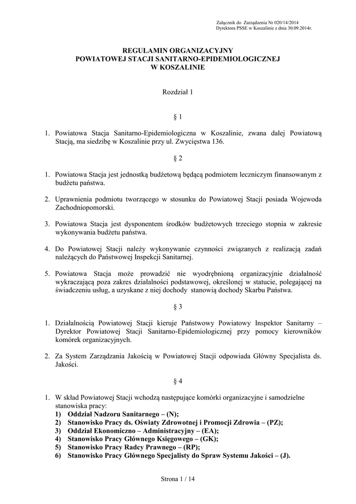 Załącznik do Zarządzenia Nr 020/14/2014 Dyrektora PSSE w Koszalinie z dnia 30.09.2014r. REGULAMIN ORGANIZACYJNY POWIATOWEJ STACJI SANITARNO-EPIDEMIOLOGICZNEJ W KOSZALINIE Rozdział 1 §1 1. Powiatowa Stacja Sanitarno-Epidemiologiczna w Koszalinie, zwana dalej Powiatową Stacją, ma siedzibę w Koszalinie przy ul. Zwycięstwa 136. §2 1. Powiatowa Stacja jest jednostką budżetową będącą podmiotem leczniczym finansowanym z budżetu państwa. 2. Uprawnienia podmiotu tworzącego w stosunku do Powiatowej Stacji posiada Wojewoda Zachodniopomorski. 3. Powiatowa Stacja jest dysponentem środków budżetowych trzeciego stopnia w zakresie wykonywania budżetu państwa. 4. Do Powiatowej Stacji należy wykonywanie czynności związanych z realizacją zadań należących do Państwowej Inspekcji Sanitarnej. 5. Powiatowa Stacja może prowadzić nie wyodrębnioną organizacyjnie działalność wykraczającą poza zakres działalności podstawowej, określonej w statucie, polegającej na świadczeniu usług, a uzyskane z niej dochody stanowią dochody Skarbu Państwa. §3 1. Działalnością Powiatowej Stacji kieruje Państwowy Powiatowy Inspektor Sanitarny – Dyrektor Powiatowej Stacji Sanitarno-Epidemiologicznej przy pomocy kierowników komórek organizacyjnych. 2. Za System Zarządzania Jakością w Powiatowej Stacji odpowiada Główny Specjalista ds. Jakości. §4 1. W skład Powiatowej Stacji wchodzą następujące komórki organizacyjne i samodzielne stanowiska pracy: 1) Oddział Nadzoru Sanitarnego – (N); 2) Stanowisko Pracy ds. Oświaty Zdrowotnej i Promocji Zdrowia – (PZ); 3) Oddział Ekonomiczno – Administracyjny – (EA); 4) Stanowisko Pracy Głównego Księgowego – (GK); 5) Stanowisko Pracy Radcy Prawnego – (RP); 6) Stanowisko Pracy Głównego Specjalisty do Spraw Systemu Jakości – (J). Strona 1 / 14 Załącznik do Zarządzenia Nr 020/14/2014 Dyrektora PSSE w Koszalinie z dnia 30.09.2014r. 2. Funkcjonowanie Powiatowej Stacji, poza unormowaniami wymienionymi w §1 regulują: 1) Regulamin Pracy Powiatowej Stacji; 2) Instrukcja Kancelaryjna w zakresie obiegu dokumentów; 3) Księga Jakości Powiatowej Stacji. §5 1. Dyrektor w związku z realizacją zadań należących do Państwowego Powiatowego Inspektora Sanitarnego, może powołać komisję ekspertów dla oceny dokumentacji projektowej. §6 1. Dyrektor Powiatowej Stacji reprezentuje pracodawcę w stosunku do pracowników Powiatowej Stacji. 2. W sprawach pracowniczych i socjalnych Dyrektor działa w porozumieniu z organizacjami związkowymi działającymi w Powiatowej Stacji na podstawie i zgodnie z aktualną ustawą o związkach zawodowych. §7 1. Państwowemu Powiatowemu Inspektorowi Sanitarnemu – Dyrektorowi Powiatowej Stacji Sanitarno-Epidemiologicznej w Koszalinie podlega bezpośrednio: Kierownik Oddziału Nadzoru Sanitarnego, Stanowisko Pracy Oświaty Zdrowotnej i Promocji Zdrowia, Główny Księgowy, Kierownik Oddziału Ekonomiczno-Administracyjnego, Radca Prawny, Główny Specjalista ds. Systemu Jakości. 3. Decyzje administracyjne, a także pisma, wystąpienia i rozstrzygnięcia w sprawach należących do kompetencji Państwowego Powiatowego Inspektora Sanitarnego w Koszalinie – Dyrektora Powiatowej Stacji Sanitarno-Epidemiologicznej w Koszalinie, jak również pisma wychodzące ze Stacji na zewnątrz podpisuje Państwowy Powiatowy Inspektor Sanitarny w Koszalinie – Dyrektor Powiatowej Stacji SanitarnoEpidemiologicznej w Koszalinie lub na podstawie jego pisemnego upoważnienia wyznaczony pracownik. 4. W czasie nieobecności Państwowego Powiatowego Inspektora Sanitarnego w Koszalinie Dyrektora Powiatowej Stacji Sanitarno-Epidemiologicznej w Koszalinie Stacją kieruje, a także wykonuje wszystkie czynności zastrzeżone do kompetencji Państwowego Powiatowego Inspektora Sanitarnego – Dyrektora Powiatowej Stacji, upoważniony pisemnie pracownik. §8 1. Zakres obowiązków i czynności, Kierownika Oddziału Nadzoru Sanitarnego, Kierownika Oddziału Ekonomiczno-Administracyjnego, Głównego Księgowego, Radcy Prawnego, Głównego Specjalisty ds. Systemu Jakości, kierowników komórek organizacyjnych i pracowników zajmujących samodzielne stanowiska pracy ustala Dyrektor. 2. Prawa i obowiązki Głównego Księgowego określają odrębne przepisy. Strona 2 / 14 Załącznik do Zarządzenia Nr 020/14/2014 Dyrektora PSSE w Koszalinie z dnia 30.09.2014r. 3. Zakres obowiązków i czynności pozostałych pracowników określa ich bezpośredni przełożony a zatwierdza Dyrektor. §9 1. Komórką organizacyjną zarządza kierownik, a w czasie jego nieobecności wyznaczony pracownik. 3. W Systemie Zarządzania Jakością, funkcję kierownika ds. jakości oraz funkcje kierowników technicznych i ich zastępców pełnią pracownicy wyznaczeni przez Dyrektora. 4. W Powiatowej Stacji mogą być powoływane zespoły realizacyjne, których pracę koordynują pracownicy wyznaczeni przez Państwowego Powiatowego Inspektora Sanitarnego w Koszalinie. 5. Dyrektor może powoływać do realizacji zadań bieżących zespoły problemowe składające się z pracowników komórek organizacyjnych Powiatowej Stacji, wyznaczając jednocześnie koordynatora ich pracy. Rozdział 2 ZADANIA WSPÓLNE KOMÓREK ORGANIZACYJNYCH § 10 1. Poszczególne komórki organizacyjne Powiatowej Stacji oraz samodzielne stanowiska pracy wykonują czynności związane z realizacją zadań powierzonych Państwowemu Powiatowemu Inspektorowi Sanitarnemu, a w szczególności: 1) prowadzą sprawy związane z wykonywaniem czynności kontrolnych i innych czynności wynikających z zadań realizowanych przez Państwowego Powiatowego Inspektora Sanitarnego; 2) przygotowują projekty decyzji i podejmują inne czynności w postępowaniu administracyjnym i w postępowaniu egzekucyjnym w administracji jako organ pierwszej instancji; 3) opracowują projekty planów pracy oraz sprawozdań z działalności Stacji w swoim zakresie działania; 4) rozpatrują wpływające do 