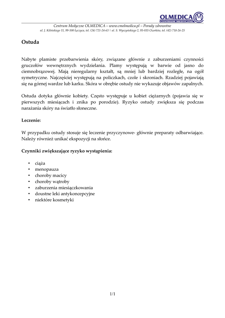 Centrum Medyczne OLMEDICA – www.cmolmedica.pl – Porady zdrowotne ul. J. Kilińskiego 11, 99-100 Łęczyca, tel. (24) 721-24-63 | ul. S. Wyszyńskiego 2, 95-035 Ozorków, tel. (42) 718-26-25 Ostuda Nabyte plamiste przebarwienia skóry, związane głównie z zaburzeniami czynności gruczołów wewnętrznych wydzielania. Plamy występują w barwie od jasno do ciemnobrązowej. Mają nieregularny kształt, są mniej lub bardziej rozległe, na ogół symetryczne. Najczęściej występują na policzkach, czole i skroniach. Rzadziej pojawiają się na górnej wardze lub karku. Skóra w obrębie ostudy nie wykazuje objawów zapalnych. Ostuda dotyka głównie kobiety. Często występuje u kobiet ciężarnych (pojawia się w pierwszych miesiącach i znika po porodzie). Ryzyko ostudy zwiększa się podczas narażania skóry na światło słoneczne. Leczenie: W przypadku ostudy stosuje się leczenie przyczynowe- głównie preparaty odbarwiające. Należy również unikać ekspozycji na słońce. Czynniki zwiększające ryzyko wystąpienia: • • • • • • • ciąża menopauza choroby macicy choroby wątroby zaburzenia miesiączkowania doustne leki antykoncepcyjne niektóre kosmetyki 1/1