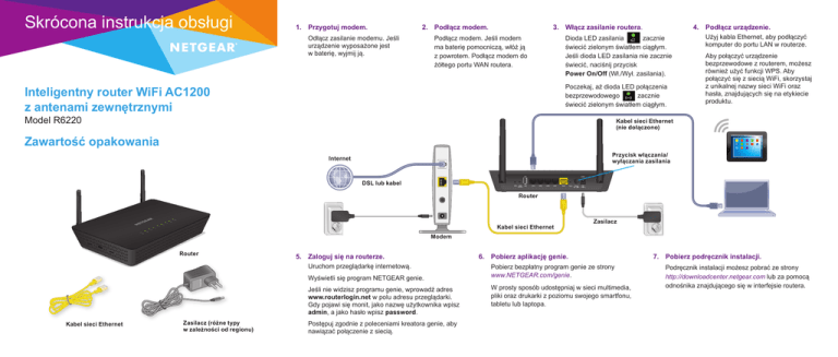 Skrócona instrukcja obsługi 1. Przygotuj modem. 2. Podłącz modem. Odłącz zasilanie modemu. Jeśli urządzenie wyposażone jest w baterię, wyjmij ją. 3. Włącz zasilanie routera. Podłącz modem. Jeśli modem ma baterię pomocniczą, włóż ją z powrotem. Podłącz modem do żółtego portu WAN routera. 4. Podłącz urządzenie. Dioda LED zasilania zacznie świecić zielonym światłem ciągłym. Jeśli dioda LED zasilania nie zacznie świecić, naciśnij przycisk Power On/Off (Wł./Wył. zasilania). Poczekaj, aż dioda LED połączenia bezprzewodowego zacznie świecić zielonym światłem ciągłym. Inteligentny router WiFi AC1200 z antenami zewnętrznymi Model R6220 Użyj kabla Ethernet, aby podłączyć komputer do portu LAN w routerze. Aby połączyć urządzenie bezprzewodowe z routerem, możesz również użyć funkcji WPS. Aby połączyć się z siecią WiFi, skorzystaj z unikalnej nazwy sieci WiFi oraz hasła, znajdujących się na etykiecie produktu. Kabel sieci Ethernet (nie dołączono) Zawartość opakowania Przycisk włączania/ wyłączania zasilania Internet DSL lub kabel Router Kabel sieci Ethernet Zasilacz Modem Router 5. Zaloguj się na routerze. Uruchom przeglądarkę internetową. Wyświetli się program NETGEAR genie. Jeśli nie widzisz programu genie, wprowadź adres www.routerlogin.net w polu adresu przeglądarki. Gdy pojawi się monit, jako nazwę użytkownika wpisz admin, a jako hasło wpisz password. Kabel sieci Ethernet Zasilacz (różne typy w zależności od regionu) Postępuj zgodnie z poleceniami kreatora genie, aby nawiązać połączenie z siecią. 6. Pobierz aplikację genie. Pobierz bezpłatny program genie ze strony www.NETGEAR.com/genie. W prosty sposób udostępniaj w sieci multimedia, pliki oraz drukarki z poziomu swojego smartfonu, tabletu lub laptopa. 7. Pobierz podręcznik instalacji. Podręcznik instalacji możesz pobrać ze strony http://downloadcenter.netgear.com lub za pomocą odnośnika znajdującego się w interfejsie routera. Nazwa i hasło sieci WiFi 3. Wpisz fabryczne hasło routera (lub swoje, jeżeli zostało zmienione) i kliknij przycisk Connect (Połącz). Wstępnie skonfigurowana nazwa sieci WiFi (SSID) oraz klucz sieci (hasło) są unikatowe dla każdego routera (jak numer seryjny). Nie musisz konfigurować zabezpieczeń WiFi, bo router używa ich automatycznie. Ustawienia WiFi znajdują się na etykiecie produktu. Hasło znajduje się na etykiecie produktu. 4. Powtórz kroki 1–3, aby dodać kolejne komputery lub urządzenia bezprzewodowe. Metoda WPS Jeśli komputer lub urządzenie WiFi obsługuje funkcję WPS, można z niej skorzystać w celu połączenia się z siecią WiFi routera. Więcej informacji na temat przycisku WPS na komputerze lub urządzeniu bezprzewodowym można znaleźć w instrukcji obsługi dostarczonej z komputerem lub urządzeniem WiFi lub w pomocy online. Niektóre starsze komputery i urządzenia nie mogą korzystać z WPS. R-NZ Firma NETGEAR zaleca, aby używać wstępnie skonfigurowanych ustawień WiFi, ponieważ w razie potrzeby można sprawdzić je na etykiecie. Program NETGEAR genie pozwala na zmianę tych ustawień. Jeśli tego dokonasz, pamiętaj o zapisaniu nowych ustawień i przechowywaniu ich w bezpiecznym miejscu. Zanotuj ustawienia sieci, aby w razie potrzeby móc je łatwo sprawdzić: Nazwa sieci WiFi (SSID) Klucz sieci (hasło) Dołączanie do sieci WiFi Komputer lub urządzenie bezprzewodowe (na przykład smartfon lub urządzenie do gier) można podłączyć do sieci WiFi routera ręcznie albo skorzystać z funkcji Wi-Fi Protected Setup (Zabezpieczone ustawienia Wi-Fi). Metoda ręczna 1. Uruchom oprogramowanie odpowiedzialne za zarządzanie połączeniami bezprzewodowymi w komputerze lub urządzeniu bezprzewodowym, które ma zostać połączone z routerem. Narzędzie to wyszuka wszystkie bezprzewodowe sieci w okolicy. 2. Odszukaj i wybierz nazwę sieci bezprzewodowej routera (SSID). Identyfikator SSID znajduje się na etykiecie produktu. Luty 2015 r. NETGEAR, Inc. 350 East Plumeria Drive San Jose, CA 95134, USA Uwaga: WPS nie obsługuje zabezpieczeń WEP. Jeśli korzystasz z zabezpieczeń WEP, podłącz urządzenia ręcznie. 1. Naciśnij przycisk WPS na routerze. 2. W ciągu dwóch minut naciśnij przycisk WPS na komputerze lub urządzeniu bezprzewodowym albo naciśnij przycisk WPS na ekranie. Komputer lub urządzenie bezprzewodowe połączy się z siecią WiFi routera. Uzyskiwanie dostępu do urządzenia USB za pośrednictwem komputera z systemem Mac 1. Podłącz urządzenie USB do portu USB routera. 2. Wybierz opcję Go (Przejdź) > Connect to Server (Połącz z serwerem). 3. W polu adresu serwera wpisz smb://readyshare. 4. Kliknij przycisk Connect (Połącz). Urządzenie USB pojawi się na ekranie. Udostępnianie drukarki USB w sieci WiFi Narzędzie ReadySHARE Printer umożliwia udostępnianie drukarki USB podłączonej do portu USB routera. Z drukarki USB można korzystać za pośrednictwem komputerów z systemem Windows lub Mac połączonych w danej sieci. Aby skonfigurować funkcję ReadySHARE Printer, pobierz narzędzie NETGEAR USB Control Center ze strony www.netgear.com/readyshare i zainstaluj je w komputerze. Wsparcie 3. Powtórz te same kroki, aby dodać kolejne komputery lub urządzenia bezprzewodowe. Dziękujemy za zakup produktu NETGEAR. Po zainstalowaniu urządzenia odszukaj jego numer seryjny na etykiecie i użyj go, aby zarejestrować swój produkt pod adresem https://my.netgear.com. Udostępnianie urządzenia USB w sieci WiFi Aby uzyskać dostęp do telefonicznego wsparcia NETGEAR, musisz najpierw zarejestrować produkt. NETGEAR zaleca rejestrację produktu poprzez stronę NETGEAR. Aby wyszukać aktualizacje produktów oraz uzyskać pomoc, odwiedź witrynę http://support.netgear.com. Aplikacja ReadySHARE umożliwia uzyskanie dostępu do napędu USB podłączonego do portu USB routera i komputera połączonego z siecią WiFi routera oraz udostępnianie jego zawartoś