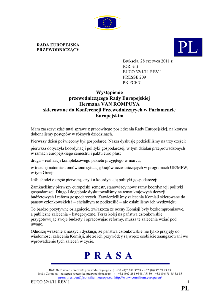 PL RADA EUROPEJSKA PRZEWODNICZĄCY Bruksela, 28 czerwca 2011 r. (OR. en) EUCO 32/1/11 REV 1 PRESSE 209 PR PCE 7 Wystąpienie przewodniczącego Rady Europejskiej Hermana VAN ROMPUYA skierowane do Konferencji Przewodniczących w Parlamencie Europejskim Mam zaszczyt zdać tutaj sprawę z pracowitego posiedzenia Rady Europejskiej, na którym dokonaliśmy postępów w róŜnych dziedzinach. Pierwszy dzień poświęcony był gospodarce. Naszą dyskusję podzieliliśmy na trzy części: pierwsza dotyczyła koordynacji polityki gospodarczej, w tym działań przeprowadzonych w ramach europejskiego semestru i paktu euro plus; druga – realizacji kompleksowego pakietu przyjętego w marcu; w trzeciej natomiast omówiono sytuację krajów uczestniczących w programach UE/MFW, w tym Grecji. Jeśli chodzi o część pierwszą, czyli o koordynację polityki gospodarczej: Zamknęliśmy pierwszy europejski semestr, stanowiący nowe ramy koordynacji polityki gospodarczej. Długo i dogłębnie dyskutowaliśmy na temat krajowych decyzji budŜetowych i reform gospodarczych. Zatwierdziliśmy zalecenia Komisji skierowane do państw członkowskich i – chciałbym to podkreślić – nie osłabiliśmy ich wydźwięku. To bardzo pozytywne osiągnięcie, zwłaszcza Ŝe oceny Komisji były bezkompromisowe, a publiczne zalecenia – kategoryczne. Teraz kolej na państwa członkowskie: przygotowując swoje budŜety i opracowując reformy, muszą te zalecenia wziąć pod uwagę. Odnoszę wraŜenie z naszych dyskusji, Ŝe państwa członkowskie nie tylko przyjęły do wiadomości zalecenia Komisji, ale Ŝe ich przywódcy są wręcz osobiście zaangaŜowani we wprowadzenie tych zaleceń w Ŝycie. PRASA Dirk De Backer - rzecznik przewodniczącego - ( +32 (0)2 281 9768 - +32 (0)497 59 99 19 Jesús Carmona - zastępca rzecznika przewodniczącego - ( +32 (0)2 281 9548 / 5150 - +32 (0)475 65 32 15 [email protected] http://www.consilium.europa.eu/ EUCO 32/1/11 REV 1 1 PL Omówiliśmy równieŜ zobowiązania wynikające z paktu euro plus, przyjęte przez wszystkie – z wyjątkiem czterech – państwa członkowskie, które w tym pakcie uczestniczą. Wszyscy zgodzili się, Ŝe idziemy w dobrym kierunku: staramy się zwiększyć konkurencyjność, wspierać zatrudnienie, wzmacniać stabilność finansową, poprawiać stan finansów publicznych i tak reformować sektor emerytur, by był stabilny. Doszliśmy jednak do wniosku, Ŝe następny pakiet zobowiązań w ramach paktu powinien być bardziej ambitny i konkretny. Dzięki tej silniejszej koordynacji polityki gospodarczej Unia wyciągnęła waŜny wniosek dotyczący kryzysu związanego z długiem publicznym w strefie euro: chodzi o współzaleŜność – decyzje jednego kraju wpływają na wszystkie pozostałe, szczególnie (ale nie tylko) na te, dla których euro jest wspólną walutą. Pierwsze doświadczenia są pozytywne. Mamy większe poczucie wspólnej odpowiedzialności. Nawet jeśli borykamy się obecnie z trudnościami i towarzyszy nam niepokój, wzmacniamy podstawy unii gospodarczej i walutowej. Drugim tematem dyskusji na tematy gospodarcze był stan wprowadzania w Ŝycie kompleksowego pakietu środków gospodarczych przyjętego w marcu. W tym względzie zatwierdziliśmy zmieniony tekst dotyczący Europejskiego Instrumentu Stabilności Finansowej i tekst traktatu dotyczącego europejskiego mechanizmu stabilności; stanowią one stałą „siatkę bezpieczeństwa” na przyszłość. Przypomnieliśmy o kluczowym znaczeniu w pełni przejrzystych testów warunków skrajnych, którym poddawane są banki. Zapoznaliśmy się ze stanem prac dotyczących pakietu ustawodawczego słuŜącego wzmocnieniu zarządzania gospodarczego (tzw. „pakietu sześciu wniosków ustawodawczych”): silniejszy pakt na rzecz stabilności i nowy nadzór makroekonomiczny. Chciałbym powiedzieć parę słów na ten temat, który – jak wiem – Parlament uwaŜa za niezwykle waŜny. Rada i Parlament zgadzają się co do ponad 95% tekstu, dlatego teŜ nalegam, by prawodawcy dokończyli ostateczne negocjacje, tak by moŜna było wkrótce przyjąć ten waŜny pakiet. Mam nadzieję, Ŝe dojdzie do tego podczas następnej sesji Parlamentu. Wyrazy uznania dla prezydencji węgierskiej i Parlamentu za dotychczasową pracę. W negocjacjach w Radą Parlament doprowadził do znacznego ulepszenia tekstów. Węgierska minister, która przewodniczyła posiedzeniu Rady, stwierdziła, Ŝe „jakość tekstów uległa zdecydowanej poprawie, a pakiet jest teraz silniejszy i bardziej spójny”. Delegacji parlamentarnej uczestniczącej w rozmowach trójstronnych udało się między innymi: skodyfikować europejski semestr w formie tekstów prawnych, zawierających przepis dotyczący kompleksowej oceny postępów państw członkowskich w realizacji strategii „Europa 2020” na rzecz zatrudnienia i wzrostu gospodarczego; zagwarantować – tam, gdzie umoŜliwia to prawo – Ŝe do pięciu z sześciu decyzji (w tym do zaleceń dotyczących zapobiegania zakłóceniom równowagi makroekonomicznej i korekty tych zakłóceń), zastosowany zostanie system odwróconej kwalifikowanej większości głosów. Co do szóstej decyzji nadal nie osiągnięto porozumienia, ale Rada zaproponowała wprowadzenie klauzuli przeglądowej; uzyskać dla Parlamentu uprawnienia równe uprawnieniom Rady co do ustalania tablicy wyników słuŜącej wykrywaniu ewentualnych zakłóceń równowagi makroekonomicznej; EUCO 32/1/11 REV 1 2 PL wprowadzić surowe grzywny za oszustwa w dziedzinie statystyki, a takŜe gwarancje niezaleŜności dla krajowych urzędów statystycznych; wprowadzić wcześniejsze sankcje w ramach procedury dotyczącej nadmiernego zakłócenia równowagi. To nie lada osiągnięcia. Ale chciałbym Parlamentowi, a takŜe – rzecz jasna – Radzie, powiedzieć, Ŝe nadszedł czas, by wypracować porozumienie i solidny kompromis. Stanowiska tych dwóch instytucji są bardzo zbliŜone, ale mam świadomość, Ŝe kaŜda kolejn