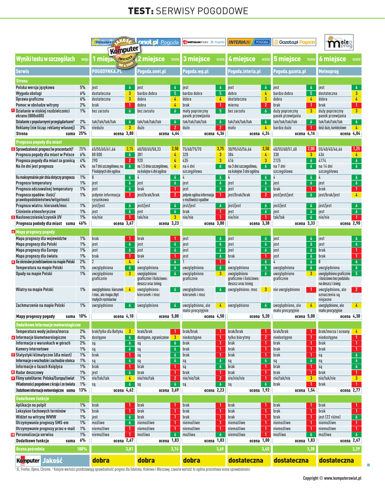 TEST: SERWISY POGODOWE Wyniki testu w szczegółach waga Serwis 1 2 3 4 5 7 8 9 10 Prognoza pogody dla miast Sprawdzalność prognoz (w procentach)2 25% Prognoza pogody dla miast w Polsce 6% Prognoza pogody dla miast za granicą 4% Na ile dni jest prognoza 4% Ilu maksymalnie pór dnia dotyczy prognoza 1% Prognoza temperatury 1% Prognoza odczuwalnej temperatury 1% Prognoza opadów: ilość/ 1% prawdopodobieństwo/wilgotność Prognoza wiatru: kierunek/moc 1% Ciśnienie atmosferyczne 1% Nasłonecznienie/czynnik UV 1% Prognoza podody dla miast suma 46% Mapy prognozy pogody Mapa prognozy dla województw Mapa prognozy dla Polski Mapa prognozy dla Europy Mapa prognozy dla świata Ile okresów przedstawiono na mapie Polski Temperatura na mapie Polski Opady na mapie Polski 1% 1% 1% 1% 2% 1% 1% Wiatry na mapie Polski 1% Zachmurzenie na mapie Polski 1% suma 10% Dodatkowe informacje meteorologiczne Temperatura wody jeziora/morza 2% Informacje biometeorologiczne 2% Informacje o warunkach w górach 2% Kamery internetowe 1% Statystyki klimatyczne (dla miast) 1% Informacje o wschodzie i zachodzie słońca 1% Informacje o fazach Księżyca 1% Radar deszczowy 1% Filmy satelitarne: Polska/Europa/świat 1% Wiadomości pogodowe z kraju i ze świata 1% Dodatkowe informacje meteorologiczne suma 13% Dodatkowe funkcje Aplikacje na pulpit Leksykon fachowych terminów Widżet na witrynę WWW Otrzymywanie prognozy SMS-em Otrzymywanie prognozy przez e-mail Personalizacja serwisu Dodatkowe funkcje suma Ocena pośrednia Jakość 1 ocena POGODYNKA.PL Strona Polska wersja językowa 5% Wygoda obsługi 6% Oprawa graficzna 6% Pomoc w obsłudze witryny 2% Działanie w niskiej rozdzielczości 1% ekranu (800x600) Działanie z popularnymi przeglądarkami1 2% Reklamy (nie licząc reklamy własnej) 3% Strona suma 25% Mapy prognozy pogody 6 1 miejsce 1% 1% 1% 1% 1% 1% 6% 2 miejsce ocena Pogoda.onet.pl ocena Pogoda.wp.pl 6 5 4 4 6 jest bardzo dobra dobra dobra bez zarzutu 4 miejsce ocena Pogoda.interia.pl jest 6 bardzo dobra 5 dobra 4 brak 1 mały poprzeczny 5 pasek przewijania tak/tak/tak/tak 6 tak/tak/tak/tak 6 tak/tak/tak/tak 6 niedużo 3 dużo 2 dużo 2 ocena 3,80 ocena 4,64 ocena 4,36 jest dostateczna dostateczna brak bez zarzutu 6 3 3 1 6 3 miejsce 5 miejsce ocena Pogoda.gazeta.pl ocena Meteoprog 6 4 3 2 6 jest 6 bardzo dobra 5 dobra 4 brak 1 duży poprzeczny 3 pasek przewijania tak/tak/tak/tak 6 tak/tak/tak/tak 6 mało 4 bardzo dużo 1 ocena 4,24 ocena 4,16 jest dobra dostateczna mierna bez zarzutu 6 miejsce jest 6 dostateczna 3 dobra 4 brak 1 duży poprzeczny 3 pasek przewijania tak/tak/tak/tak 6 dość dużo, kontekstowe 4 ocena 4,04 2,50 75/60/75/70 3,75 30/95/45/56,66 2,50 40/55/60/51,60 2,00 55/40/45/46,66 1,25 2,75 60/50/65/58,33 65/55/65/61,66 88 000 6 381 4 320 3 384 4 338 3 436 4 290 2 920 4 435 3 416 3 2125 6 4174 6 na 7 dni szczegółowa; na 6 na 1,5 dnia szczegółowa, 4 na 4 dni 6 na 3 dni szczegołówa, 6 na 7 dni 6 na 14 dni 6 9 kolejnych dni ogólna na kolejne 4 dni ogólna szczegółowa na kolejne 3 dni ogólna szczegółowa szczegółowa 8 6 4 6 4 6 4 6 4 6 4 6 jest 6 jest 6 jest 6 jest 6 jest 6 jest 6 jest 6 brak 1 jest 6 jest 6 brak 1 brak 1 jedynie informacja 1 jest/brak/brak 2 jedynie ogólna informacja 1 jest/brak/brak 2 jest/jest/jest 6 jest/brak/jest 4 rysunkowa o możliwości opadów jest/jest 6 jest/jest 6 jest/jest 6 jest/jest 6 jest/jest 6 jest/jest 6 jest 6 jest 6 brak 1 jest 6 jest 6 jest 6 nie/nie 1 tak/nie 3 nie/nie 1 nie/nie 1 tak/tak 6 nie/nie 1 ocena 3,67 ocena 3,23 ocena 3,80 ocena 3,38 ocena 3,33 ocena 2,90 jest 6 jest 6 brak 1 brak 1 8 6 uwzględniona 6 uwzględniono graficznie 5 i ilościowo bez podziału na deszcz i śnieg uwzględniono: kierunek 4 6 uwzględniono: 6 3 nie uwzględniono 1 uwzględniono, ale 2 i moc, ale mapa zbyt kierunek i moc oznaczenia są małych rozmiarów niejasne uwzględniono 6 uwzględniono 6 uwzględniono, ale 4 uwzględniono 6 uwzględniono, ale 4 uwzględniono, ale 4 mało precyzyjnie mało precyzyjnie mało precyzyjnie ocena 4,10 ocena 5,00 ocena 4,50 ocena 5,20 ocena 5,00 ocena 4,30 brak jest jest brak 2 uwzględniona uwzględniono graficznie 1 6 6 1 4 6 3 brak/tylko dla Bałtyku 3 dostępne 6 są 6 są 6 brak 1 są 6 brak 1 jest 6 nie/tak/tak 4 są 6 ocena 4,62 brak brak jest możliwe niemożliwe niemożliwa 100% 1 1 6 6 1 1 ocena 2,67 brak jest jest brak 4 uwzględniona uwzględniono graficznie i ilościowo: deszcz oraz śnieg uwzględniono: kierunek i moc brak/brak 1 dostępne, ograniczone 3 są 6 są 6 są 6 są 6 brak 1 brak 1 nie/nie/tak 2 są 6 ocena 3,69 brak brak brak niemożliwe niemożliwe możliwa 3,81 dobra 1 6 6 1 6 6 6 1 1 1 1 1 6 ocena 1,83 jest jest jest jest 1 uwzględniona uwzględniono graficznie 6 6 6 1 6 6 6 jest jest jest brak 4 uwzględniona uwzględniono graficznie i ilościowo: deszcz oraz śnieg uwzględniono: moc brak/brak niedostępne brak brak brak są są brak nie/nie/tak są 1 1 1 1 1 6 6 1 2 6 ocena 2,23 brak/brak 1 tylko biorytmy 2 brak 1 brak 1 brak 1 są 6 brak 1 brak 1 nie/nie/nie 1 są 6 ocena 1,92 brak brak brak niemożliwe niemożliwe możliwa 1 1 1 1 1 6 ocena 1,83 brak brak brak niemożliwe niemożliwe niemożliwa 3,74 dobra 6 6 6 6 1 6 3 1 1 1 1 1 1 ocena 1,00 3,69 dobra 3,45 dostateczna 6 6 6 6 6 6 3 jest jest jest jest 4 uwzględniona uwzględniono graficznie brak/brak niedostępne brak brak brak są brak brak nie/tak/nie brak 1 1 1 1 1 6 1 1 3 1 ocena 1,54 brak/morza i oceany 4 niedostępne 1 brak 1 brak 1 są 6 są 6 są 6 brak 1 nie/tak/nie 3 brak 1 ocena 2,77 brak brak brak niemożliwe niemożliwe możliwa 1 1 1 1 1 6 ocena 1,83 brak 1 brak 1 jest (22 różne) 6 niemożliwe 1 niemożliwe 1 możliwa 6 ocena 2,67 3,38 3,29 dostateczna dostateczna IE, Firefox, Opera, Chrome; 2 Kolejne wartości przedstawiają sprawdzalność prognoz dla Gdańska, Krakowa i Warszawy, czwarta wartość to ogólna procentowa ocena sprawdzalności Copyright © www.komputerswiat.pl n