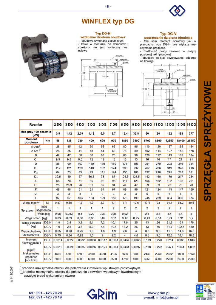 -8- WINFLEX typ DG Typ DG-H wzdłużnie dzielona obudowa Typ DG-V poprzecznie dzielona obudowa - obudowa wykonana z aluminium, - łatwe w montażu, do demontażu sprężyny nie jest konieczny luz osiowy 2 DG 3 DG 4 DG 5 DG 6 DG 7 DG 8 DG 0,5 1,42 2,39 4,18 6,5 9,7 19,4 35,8 60 90 132 48 136 230 400 620 930 1850 3400 5700 8600 12650 28 28 47 9,5 88 112 64 39,5 68 25 48 3 97 35 35 47 9,5 99 121 73 49 70 25,3 48 3 97 42 41 50 9,5 107 129 83 57 71 26 51 3 103 50 48 60 12 130 148 99 66,5 85 31 61 3 123 56 54 63 13 139 162 111 78 92 32 64 3 129 65 63 76 13 150 174 124 87 95 34 67 3 155 80 76 88 13 176 200 150 104,5 117 44 89 3 179 95 89 98 13 196 232 168 123,5 123 47 96 3 199 110 102 120 16 251 267 197 142 156 59 121 5 245 120 114 127 16 270 286 216 160 162 63 124 5 259 137 127 149 17 308 319 245 179 192 73 143 6 304 165 152 162 21 346 378 283 217 195 75 147 6 330 184 178 184 21 384 416 321 254 201 78 156 6 374 kg 0,57 0,85 1,2 1,9 2,7 4,1 7,1 10,6 Ilość 1 1 1 1 1 2 2 2 Sprężyna segmentów waga [kg] 0,08 0,083 0,1 0,29 0,33 0,35 0,92 1 Waga smaru [kg] 0,03 0,03 0,06 0,06 0,09 0,11 0,17 0,25 1,8 2,4 3,2 5,1 7,2 10,1 17,8 25 Waga sprzęgła DG H )*** [kg] DG V 1,9 2,5 3,3 5,3 7,4 10,4 18,2 26 0,73 0,79 1,3 1,8 1,9 2,6 4 Waga obudowy DG H 0,65 ze sprężyną DG V 0,75 0,84 0,92 1,5 2 2,2 4 4,6 Moment DG H 0,0014 0,0022 0,0032 0,0068 0,0117 0,0181 0,0437 0,0763 bezwładności I )*** DG V 0,0016 0,0024 0,0035 0,0076 0,0121 0,0181 0,0434 0,0797 2 [kgm ] Maksymalna DG H 4500 4500 4500 4500 4350 4125 3600 3600 prędkość DG V 6000 6000 6000 6000 6000 5500 4750 4000 [obr./min] 17,4 23 34,7 53,2 80,6 2 2 2 2 2 2,1 0,43 43 43 8,6 8,6 2,5 0,51 56 56 9,6 9,6 4,4 0,74 81,2 81,7 11,8 12,3 5,4 0,91 121 122,5 14,6 16,1 6 1,2 178 180 16,8 18,8 0,179 0,270 0,214 0,988 1,845 0,178 0,272 0,471 1,044 1,882 Moc przy 100 obr./min [kW] Moment Nm obrotowy )* Am )** Am B C1 D D1 D2 D3 E E1 F J L 9 DG 10 DG 11 DG 12 DG 13 DG 14 DG W1-11/2007 Waga piasty* 193 18400 26450 2440 2250 2052 1800 1650 3250 3000 2700 2400 2200 )* średnica maksymalna otworu dla połączenia z rowkiem wpustowym prostokątnym średnica maksymalna otworu dla połączenia z rowkiem wpustowym kwadratowym )*** sprzęgło przed wykonaniem otworu )** tel.: 091 - 423 70 20 fax: 091 - 423 70 19 277 www.grim.pl e-mail: [email protected] SPRZĘGŁA SPRĘŻYNOWE Rozmiar - taki sam moment obrotowy jak w przypadku typu DG-H, ale większa maksymalna prędkość, - możliwość pracy zarówno w pozycji poziomej jaki i pionowej, - obudowa ze stali ocynkowanej, odporna na korozję