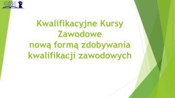 Kwalifikacyjne Kursy Zawodowe nową formą zdobywania kwalifikacji zawodowych Kwalifikacyjne kursy zawodowe Kwalifikacyjny kurs zawodowy to pozaszkolna forma kształcenia ustawicznego, której program nauczania uwzględnia podstawę programową kształcenia w zawodach w zakresie jednej kwalifikacji. Ukończenie umożliwia przystąpienie do egzaminu potwierdzającego kwalifikacje w zawodzie w zakresie tej kwalifikacji. art. 3 pkt 20 ustawy z dnia 19 sierpnia 2011 r. o zmianie ustawy o systemie oświaty oraz niektórych innych ustaw Kwalifikacyjne kursy zawodowe Warunki organizacji i prowadzenia kwalifikacyjnego kursu zawodowego są określone w rozporządzeniu MEN z 11 stycznia 2012 r. w sprawie kształcenia ustawicznego w formach pozaszkolnych (Dz.U. z 2012 r., poz. 186 z późn. zm.) Podmioty uprawnione do prowadzenia kwalifikacyjnych kursów zawodowych art. 68a ust. 2 ustawy o systemie oświaty publiczne i niepubliczne placówki kształcenia ustawicznego, placówki kształcenia praktycznego, ośrodki dokształcania i doskonalenia zawodowego, szkoły prowadzące kształcenie zawodowe, publiczne i niepubliczne posiadające uprawnienia szkół publicznych – w zakresie zawodów, w których kształcą (technikum, ZSZ, szkoła policealna), instytucje rynku pracy działające na podstawie ustawy z 20 kwietnia 2004 r. o promocji zatrudnienia i instytucjach rynku pracy, prowadzące działalność edukacyjno-szkoleniową, podmioty prowadzące działalność oświatową na podstawie przepisów o swobodzie działalności gospodarczej. Kwalifikacyjne kursy zawodowe Kwalifikacyjne kursy zawodowe (KKZ) są ofertą kształcenia zawodowego dla osób dorosłych (ukończone 18 lat), które są absolwentami co najmniej szkoły podstawowej (także wcześniejszej 8-letniej szkoły podstawowej). Jest to oferta edukacyjna także dla osób, które ukończyły: gimnazjum, zasadniczą szkołę zawodową, technikum, liceum ogólnokształcące, szkołę policealną, wyższą uczelnię. Kwalifikacyjne kursy zawodowe oferują kształcenie w zakresie 214 kwalifikacji wyodrębnionych w 162 zawodach, w których kształcenie odbywa się w zasadniczych szkołach zawodowych, technikach, szkołach policealnych. Kwalifikacyjne kursy zawodowe Pierwszą czynnością osoby zainteresowanej tą formą kształcenia powinno być sprawdzenie w klasyfikacji zawodów szkolnictwa zawodowego, czy kształcenie w danej kwalifikacji może być prowadzone na kwalifikacyjnym kursie zawodowym. (rozporządzenie MEN z dnia 23 grudnia 2011 roku zawodowego - Dz.U. 2012 r., poz. 7 z późn. zm.). w sprawie klasyfikacji zawodów szkolnictwa Kwalifikacyjne kursy zawodowe Kwalifikacyjne kursy zawodowe Kwalifikacyjny kurs zawodowy jest prowadzony według programu nauczania uwzględniającego podstawę programową kształcenia w zawodach, w zakresie tej kwalifikacji, której dotyczy dany kurs. Ukończenie kwalifikacyjnego kursu zawodowego umożliwia przystąpienie do egzaminu potwierdzającego kwalifikacje w zawodzie, przeprowadzanego na takich samych warunkach i w taki sam sposób, jak w przypadku kształcenia realizowanego w systemie szkolnym. Kwalifikacyjne kursy zawodowe Oferują absolwentom zasadniczych szkół zawodowych: dalszą naukę w zakresie kwalifikacji, co daje możliwość uzyskania dyplomu potwierdzającego kwalifikacje w zawodzie na poziomie technikum, gdy osoba uzyska świadectwo ukończenia szkoły średniej, krótszy okres kształcenia w nowym zawodzie, dalsza nauka w kwalifikacjach z zawodów pokrewnych, gdy potwierdzone już kwalifikacje (zasadnicza szkoła zawodowa) są wspólne dla innego zawodu/innych zawodów. Kwalifikacyjne kursy zawodowe Oferują absolwentom technikum zdobycie w krótszym czasie nowego zawodu w kwalifikacjach wyodrębnionych w zawodach pokrewnych, gdy potwierdzone wcześniej kwalifikacje są wspólne dla tego zawodu/tych zawodów. Przykład kwalifikacji wspólnej dla zawodów (A.18) Oznaczenie kwalifikacji Nazwa kwalifikacji A.22 (K 2) Prowadzenie działalności handlowej A.21 (K 2) Prowadzenie działalności informacyjnobibliograficznej A.18 (K 1) Prowadzenie sprzedaży Nazwa zawodu/typ szkoły Nazwa zawodu/typ szkoły Nazwa zawodu/typ szkoły Technik handlowiec technikum Technik księgarstwa technikum Sprzedawca zasadnicza szkoła zawodowa Technik handlowiec technikum Technik księgarstwa technikum Ukończenie kwalifikacyjnego kursu zawodowego daje możliwość: uzyskania nowych kwalifikacji zawodowych, zdobycia nowego zawodu, zwiększa szanse przy poszukiwaniu zatrudnienia, rozpoczęcia własnej działalności gospodarczej. Forma kształcenia na kwalifikacyjnych kursach zawodowych Stacjonarne kształcenie - (co najmniej przez trzy dni w tygodniu) lub zaoczne (co najmniej raz na dwa tygodnie przez dwa dni). Kwalifikacyjne kursy zawodowe mogą być także organizowane z wykorzystaniem metod i technik kształcenia na odległość, z wyłączeniem zajęć praktycznych i laboratoryjnych. Kwalifikacyjne kursy zawodowe kwalifikacyjny kurs zawodowy może rozpocząć się w dowolnym czasie, może rozpoczynać się lub kończyć w trakcie trwania semestru, minimalna liczba godzin kształcenia na kwalifikacyjnym kursie zawodowym jest równa minimalnej liczbie godzin kształcenia zawodowego określonej w podstawie programowej kształcenia w zawodach dla danej kwalifikacji, okres nauki na kwalifikacyjnym kursie zawodowym z zakresu poszczególnych kwalifikacji może być różny, najczęściej od 2 do 4 semestrów, podmiot prowadzący KKZ jest obowiązany poinformować okręgową komisję egzaminacyjną o rozpoczęciu kształcenia na kwalifikacyjnym kursie zawodowym w terminie 14 dni od daty rozpoczęcia kursu Kwalifikacyjne kursy zawodowe wymagania egzaminacyjne określa podstawa programowa kształcenia w zawodach dla danej kwalifikacji. Umiejętności z podstawy programowej kształcenia w zawodach właściwe dla kwalifikacji są potwierdzane w części pisemnej i części praktycznej egzaminu, w jednym terminie, n