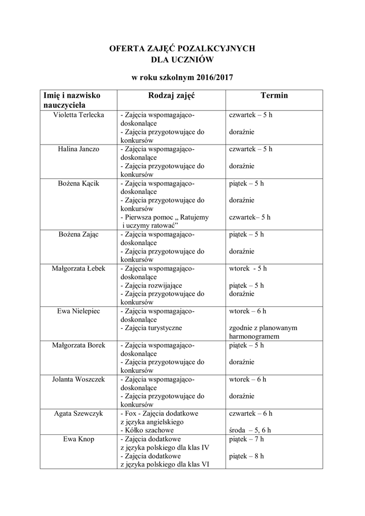 OFERTA ZAJĘĆ POZALKCYJNYCH DLA UCZNIÓW w roku szkolnym 2016/2017 Imię i nazwisko nauczyciela Violetta Terlecka Halina Janczo Bożena Kącik Bożena Zając Małgorzata Łebek Ewa Nielepiec Małgorzata Borek Jolanta Woszczek Agata Szewczyk Ewa Knop Rodzaj zajęć - Zajęcia wspomagającodoskonalące - Zajęcia przygotowujące do konkursów - Zajęcia wspomagającodoskonalące - Zajęcia przygotowujące do konkursów - Zajęcia wspomagającodoskonalące - Zajęcia przygotowujące do konkursów - Pierwsza pomoc „ Ratujemy i uczymy ratować” - Zajęcia wspomagającodoskonalące - Zajęcia przygotowujące do konkursów - Zajęcia wspomagającodoskonalące - Zajęcia rozwijające - Zajęcia przygotowujące do konkursów - Zajęcia wspomagającodoskonalące - Zajęcia turystyczne - Zajęcia wspomagającodoskonalące - Zajęcia przygotowujące do konkursów - Zajęcia wspomagającodoskonalące - Zajęcia przygotowujące do konkursów - Fox - Zajęcia dodatkowe z języka angielskiego - Kółko szachowe - Zajęcia dodatkowe z języka polskiego dla klas IV - Zajęcia dodatkowe z języka polskiego dla klas VI Termin czwartek – 5 h doraźnie czwartek – 5 h doraźnie piątek – 5 h doraźnie czwartek– 5 h piątek – 5 h doraźnie wtorek - 5 h piątek – 5 h doraźnie wtorek – 6 h zgodnie z planowanym harmonogramem piątek – 5 h doraźnie wtorek – 6 h doraźnie czwartek – 6 h środa – 5, 6 h piątek – 7 h piątek – 8 h Dorota Szwej Olga Lipecka - Zajęcia dodatkowe z matematyki dla klas VI - Zajęcia dodatkowe z matematyki dla klas IV - Zajęcia dodatkowe z matematyki dla klas V - Kółko matematyczne - Kółko historyczne Elżbieta Doniec - Kółko misyjne - Konsultacje religijne Aleksandra Janikowska - Zajęcia dodatkowe z języka polskiego wyrównawcze, artystyczne – wg potrzeb klasa V b klasa V a, VI a Anna Siwiła - Kółko języka niemieckiego - Konsultacje z języka niemieckiego Monika Skorupa - Konsultacje historyczne wtorek – 7 h środa – 6 h czwartek - 7 h czwartek – 8 h poniedziałek – 7 h I wtorek miesiąca – 8 h wtorek – 8 h poniedziałek – 7 h środa – 7 h kl. poniedziałek – 7 h czwartek – 8 h środa – 7 h - Konsultacje przyrodnicze środa – 7 h Joanna Rogala - Zajęcia sportowo – rekreacyjne środa – 7,8 h Barbara Gacek - Warsztaty dziennikarskie poniedziałek – 7 h Alicja Jakubowska Piotr Olbrychowski - Warsztaty dziennikarskie - Zajęcia teatralne - Kółko plastyczne poniedziałek – 7 h czwartek – 13.30 – 14.30 czwartek – 7 h Agnieszka Rozwadowska Beata Feszter - Zajęcia dodatkowe z języka angielskiego - Zajęcia umuzykalniające środa – 7 h Agnieszka Niziórska - Zajęcia czytelnicze poniedziałek - 13.30 – 14.30 Renata Wrona - Zajęcia artystyczne piątek – 13.30 – 14.30 - Zajęcia ruchowe ( kółko taneczne) - Zajęcia radzenia sobie ze stresem - Szkolny klub gier planszowych wtorek – 12.50 – 13.50 Urszula Nowosielska Justyna Gęborska Katarzyna Sobczak Dorota Rapacz- Perz środa - 13.30 – 14.30 wtorek – 14.40 – 15.00 poniedziałek – 13.00 – 16.00