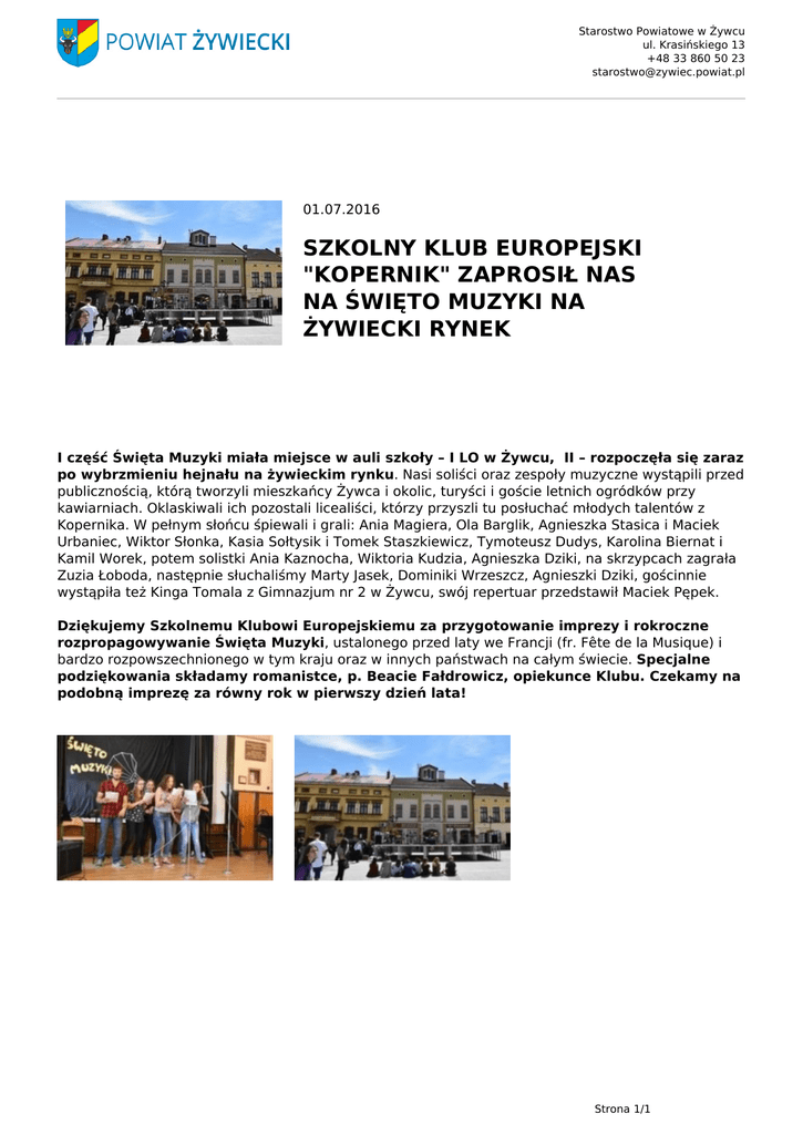Starostwo Powiatowe w Żywcu ul. Krasińskiego 13 +48 33 860 50 23 [email protected] 01.07.2016 SZKOLNY KLUB EUROPEJSKI "KOPERNIK" ZAPROSIŁ NAS NA ŚWIĘTO MUZYKI NA ŻYWIECKI RYNEK I część Święta Muzyki miała miejsce w auli szkoły – I LO w Żywcu, II – rozpoczęła się zaraz po wybrzmieniu hejnału na żywieckim rynku. Nasi soliści oraz zespoły muzyczne wystąpili przed publicznością, którą tworzyli mieszkańcy Żywca i okolic, turyści i goście letnich ogródków przy kawiarniach. Oklaskiwali ich pozostali licealiści, którzy przyszli tu posłuchać młodych talentów z Kopernika. W pełnym słońcu śpiewali i grali: Ania Magiera, Ola Barglik, Agnieszka Stasica i Maciek Urbaniec, Wiktor Słonka, Kasia Sołtysik i Tomek Staszkiewicz, Tymoteusz Dudys, Karolina Biernat i Kamil Worek, potem solistki Ania Kaznocha, Wiktoria Kudzia, Agnieszka Dziki, na skrzypcach zagrała Zuzia Łoboda, następnie słuchaliśmy Marty Jasek, Dominiki Wrzeszcz, Agnieszki Dziki, gościnnie wystąpiła też Kinga Tomala z Gimnazjum nr 2 w Żywcu, swój repertuar przedstawił Maciek Pępek. Dziękujemy Szkolnemu Klubowi Europejskiemu za przygotowanie imprezy i rokroczne rozpropagowywanie Święta Muzyki, ustalonego przed laty we Francji (fr. Fête de la Musique) i bardzo rozpowszechnionego w tym kraju oraz w innych państwach na całym świecie. Specjalne podziękowania składamy romanistce, p. Beacie Fałdrowicz, opiekunce Klubu. Czekamy na podobną imprezę za równy rok w pierwszy dzień lata! Strona 1/1 Powered by TCPDF (www.tcpdf.org)