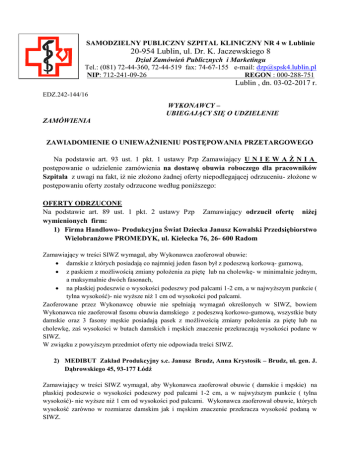 SAMODZIELNY PUBLICZNY SZPITAL KLINICZNY NR 4 w Lublinie 20-954 Lublin, ul. Dr. K. Jaczewskiego 8 Dział Zamówień Publicznych i Marketingu Tel.: (081) 72-44-360, 72-44-519 fax: 74-67-155 e-mail: [email protected] NIP: 712-241-09-26 REGON : 000-288-751 Lublin , dn. 03-02-2017 r. EDZ.242-144/16 WYKONAWCY – UBIEGAJĄCY SIĘ O UDZIELENIE ZAMÓWIENIA ZAWIADOMIENIE O UNIEWAŻNIENIU POSTĘPOWANIA PRZETARGOWEGO Na podstawie art. 93 ust. 1 pkt. 1 ustawy Pzp Zamawiający U N I E W A Ż N I A postępowanie o udzielenie zamówienia na dostawę obuwia roboczego dla pracowników Szpitala z uwagi na fakt, iż nie złożono żadnej oferty niepodlegającej odrzuceniu- złożone w postępowaniu oferty zostały odrzucone według poniższego: OFERTY ODRZUCONE Na podstawie art. 89 ust. 1 pkt. 2 ustawy Pzp Zamawiający odrzucił ofertę niżej wymienionych firm: 1) Firma Handlowo- Produkcyjna Świat Dziecka Janusz Kowalski Przedsiębiorstwo Wielobranżowe PROMEDYK, ul. Kielecka 76, 26- 600 Radom Zamawiający w treści SIWZ wymagał, aby Wykonawca zaoferował obuwie: damskie z których posiadają co najmniej jeden fason był z podeszwą korkową- gumową, z paskiem z możliwością zmiany położenia za piętę lub na cholewkę- w minimalnie jednym, a maksymalnie dwóch fasonach, na płaskiej podeszwie o wysokości podeszwy pod palcami 1-2 cm, a w najwyższym punkcie ( tylna wysokość)- nie wyższe niż 1 cm od wysokości pod palcami. Zaoferowane przez Wykonawcę obuwie nie spełniają wymagań określonych w SIWZ, bowiem Wykonawca nie zaoferował fasonu obuwia damskiego z podeszwą korkowo-gumową, wszystkie buty damskie oraz 3 fasony męskie posiadają pasek z możliwością zmiany położenia za piętę lub na cholewkę, zaś wysokości w butach damskich i męskich znaczenie przekraczają wysokości podane w SIWZ. W związku z powyższym przedmiot oferty nie odpowiada treści SIWZ. 2) MEDIBUT Zakład Produkcyjny s.c. Janusz Brudz, Anna Krystosik – Brudz, ul. gen. J. Dąbrowskiego 45, 93-177 Łódź Zamawiający w treści SIWZ wymagał, aby Wykonawca zaoferował obuwie ( damskie i męskie) na płaskiej podeszwie o wysokości podeszwy pod palcami 1-2 cm, a w najwyższym punkcie ( tylna wysokość)- nie wyższe niż 1 cm od wysokości pod palcami. Wykonawca zaoferował obuwie, których wysokość zarówno w rozmiarze damskim jak i męskim znaczenie przekracza wysokość podaną w SIWZ. W związku z powyższym przedmiot oferty nie odpowiada treści SIWZ. Dziękuję za udział w postępowaniu. Z poważaniem,