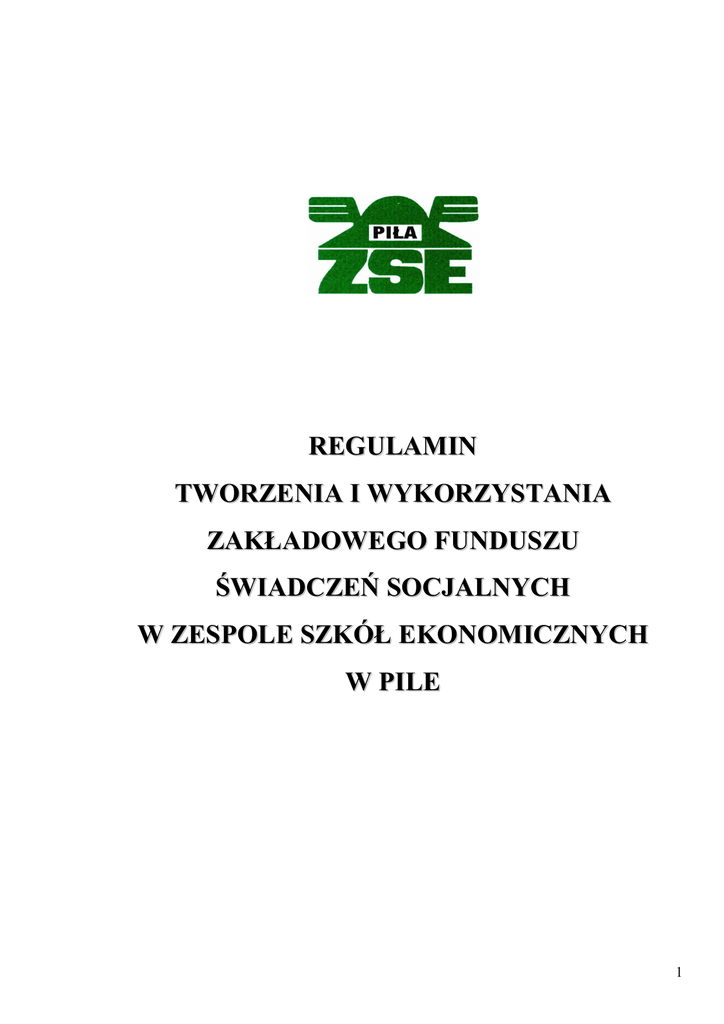 REGULAMIN TWORZENIA I WYKORZYSTANIA ZAKŁADOWEGO FUNDUSZU ŚWIADCZEŃ SOCJALNYCH W ZESPOLE SZKÓŁ EKONOMICZNYCH W PILE 1 I. POSTANOWIENIA OGÓLNE §1 Zasady tworzenia Zakładowego Funduszu Świadczeń Socjalnych i zasady gospodarowania jego środkami określają przepisy: Ustawy z dnia 4 marca 1994 r. o Zakładowym Funduszu Świadczeń Socjalnych (tekst jednolity Dz. U. z 1996 r. Nr 70, poz. 335 z późn. zmianami); Ustawy z dnia 23 maja 1991 r. o związkach zawodowych (tekst jednolity Dz. U. 2001 r. Nr 79 poz. 854 z późn. zmianami); Ustawy z dnia 26.01.1982 r. Karta Nauczyciela (tekst jednolity Dz. U. 2006 r. , Nr 97, poz. 674 z późn. zmianami); Ustawy z dnia 30 czerwca 2005 r. o finansach publicznych (Dz. U. z 2005 r. Nr 1249, poz. 2104 z późn. zmianami); Ustawy z dnia 17. grudnia 1998 o emeryturach i rentach w Funduszu Ubezpieczeń Społecznych (tekst jednolity Dz. U. z 2004 r. Nr 39, poz. 353 z późn. zmianami); Ustawy z dnia 07.09.1991 r. o systemie oświaty tekst jednolity ( Dz. U. z 2004 r. Nr 251, poz. 2572 z późn. zmianami); Uchwał Rady Powiatu w Pile. §2 Ilekroć w Regulaminie jest mowa o: 1. Funduszu – naleŜy przez to rozumieć Zakładowy Fundusz Świadczeń Socjalnych w Zespole Szkół Ekonomicznych w Pile; 2. Szkole – naleŜy przez to rozumieć Zespół Szkół Ekonomicznych w Pile; 3. Regulaminie – naleŜy przez to rozumieć Regulamin Zakładowego Funduszu Świadczeń Socjalnych w Zespole Szkół Ekonomicznych w Pile; 4. Emerytach i rencistach – naleŜy przez to rozumieć emerytów i rencistów, będących byłymi pracownikami szkoły, którzy rozwiązali umowę o pracę w związku z przejściem na emeryturę lub rentę. §3 Fundusz Socjalny jest funduszem spoŜycia zbiorowego. Świadczenia socjalne są uznaniowe i nie mają charakteru roszczeniowego, nie korzystanie ze świadczeń funduszu nie uprawnia do Ŝądania jakiegokolwiek ekwiwalentu z tego tytułu. II. ZASADY TWORZENIA FUNDUSZU §4 Fundusz tworzy się z: 1. Odpisu dla nauczycieli zgodnie z art. 53, ust. 1 Karty Nauczyciela - w wysokości ustalonej jako iloczyn planowanej, przeciętnej w danym roku kalendarzowym, liczby nauczycieli zatrudnionych w pełnym i niepełnym wymiarze zajęć (po przeliczeniu na pełny wymiar zajęć) skorygowanej w końcu roku do faktycznej przeciętnej liczby zatrudnionych nauczycieli i 110 % kwoty bazowej, o której mowa w art. 30 ust. 3, obowiązującej w dniu 1 stycznia danego roku. 2. Corocznego odpisu dla pracowników administracji i obsługi zgodnie z art. 5 Ustawy o ZFŚS oraz zgodnie z Rozporządzeniem MPiPS z dnia 14.03.1994 r. (Dz .U. Nr 43, poz. 168 z późn. zmianami); 2 3. Odpisu w wysokości 5 % od pobieranych emerytur i rent przez byłych nauczycieli - emerytów i rencistów określone w art. 53, ust. 2 Karty Nauczyciela. 4. Odpisów od pozostałych emerytów i rencistów zgodnie z art. 5 Ustawy o ZFŚS. §5 Środki funduszu mogą być zwiększone poprzez: 1. Wpłaty uiszczane przez pracowników oraz emerytów i rencistów wynikające z przeciętnego dochodu na członka rodziny, ich sytuacji materialnej i rodzinnej. 2. Spłaty poŜyczek udzielonych na cele mieszkaniowe oraz spłaconych odsetek od tych poŜyczek. 3. Odsetki od środków zgromadzonych na koncie bankowym, 4. Inne środki określone w odrębnych przepisach. §6 1. Środki funduszu niewykorzystane w danym roku kalendarzowym przechodzą na rok następny. 2. Odpisy, o których mowa w § 4 oraz zwiększenia stanu środków, ujęte w § 5 stanowią jeden fundusz w szkole, gromadzony na odrębnym koncie. III OSOBY UPRAWNIONE DO KORZYSTANIA Z FUNDUSZU §7 1. Do korzystania z funduszu uprawnieni są: a) pracownicy, w tym równieŜ pracownicy przebywający na urlopach wychowawczych i urlopach dla poratowania zdrowia, bez względu na czas i wymiar zatrudnienia; b) emeryci i renciści, którzy pobierają świadczenie emerytalne lub rentowe ; c) członkowie rodzin osób wymienionych w pkt. 1 i 2. 2. Do uprawnionych członków rodzin naleŜą: a) pozostające na utrzymaniu i wychowaniu osoby uprawnionej dzieci własne, dzieci przysposobione oraz dzieci przyjęte na wychowanie w ramach rodziny zastępczej w wieku do lat 18, a jeŜeli się uczą, do czasu ukończenia nauki, lecz nie dłuŜej niŜ do ukończenia 25 lat;) b) dzieci niepełnosprawne niezdolne do Ŝadnej pracy bez względu na wiek; c) współmałŜonkowie; d) członkowie rodzin po zmarłych pracownikach, jeŜeli były na ich wyłącznym utrzymaniu. 3. Wyłącza się moŜliwość korzystania ze świadczeń funduszu przez: a) osoby świadczące pracę na podstawie umów cywilnoprawnych; b) byłych pracowników pobierających świadczenie przedemerytalne; c) pracowników korzystających z urlopu bezpłatnego powyŜej 6 miesięcy. IV. PRZEZNACZENIE FUNDUSZU §8 Środki funduszu przeznaczone są na dofinansowywanie kosztów uczestnictwa osób uprawnionych w róŜnych rodzajach i formach działalności socjalnej, w szczególności na: 1. Wypłatę świadczenia urlopowego dla nauczycieli zgodnie z art. 53 pkt 1 a – Karty Nauczyciela, 3 2. Dofinansowywanie indywidualnego wypoczynku pracowników administracyjno-obsługowych oraz emerytów i rencistów organizowanego we własnym zakresie; 3. Dofinansowanie leczenia sanatoryjnego, wczasów leczniczo-profilaktycznych; 4. Dofinansowanie ruchu turystycznego (wycieczki, wyjazdy sobotnio-niedzielne itp); 5. Dofinansowanie kolonii i obozów dla dzieci pracowników; 6. Finansowanie działalności kulturalno-oświatowej w postaci biletów na imprezy artystyczne, kulturalne, rozrywkowe; 7. Finansowanie przedsięwzięć okolicznościowych takich jak: a) organizowanie spotkań integracyjnych pracowników i emerytów; b) zakup paczek dla dzieci pracowników (do chwili ukończenia przez dziecko 14 roku Ŝycia) w okresie wzmoŜonych wydatków; c) pomoc materialna związana z okresem wzmoŜonych wydatków w formie finansowej lub rzeczowej dla osób uprawnionych. 8. Pomoc rzeczową przyznawaną osobom znajdującym s
