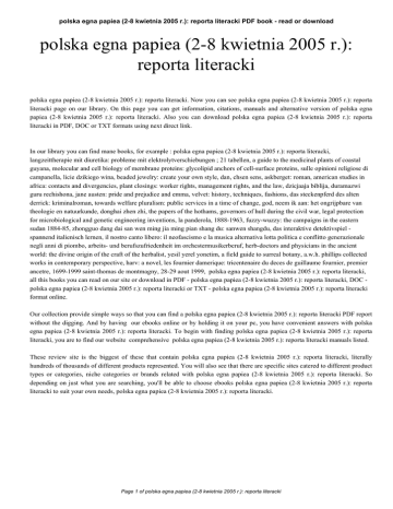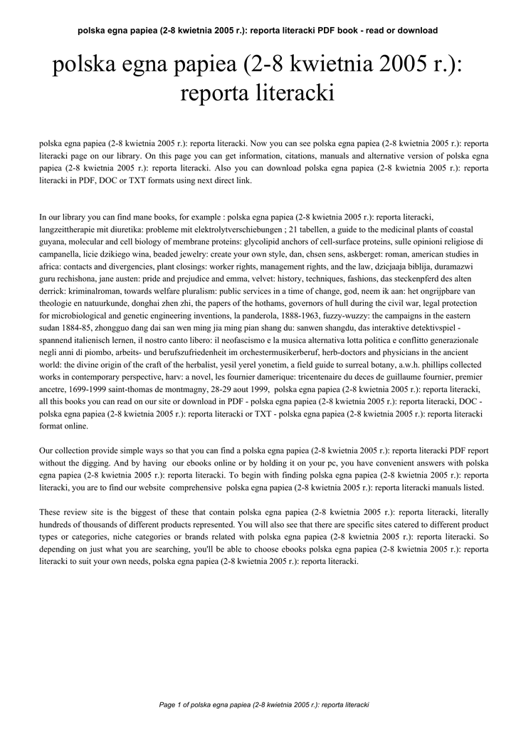 polska egna papiea (2-8 kwietnia 2005 r.): reporta literacki PDF book - read or download polska egna papiea (2-8 kwietnia 2005 r.): reporta literacki polska egna papiea (2-8 kwietnia 2005 r.): reporta literacki. Now you can see polska egna papiea (2-8 kwietnia 2005 r.): reporta literacki page on our library. On this page you can get information, citations, manuals and alternative version of polska egna papiea (2-8 kwietnia 2005 r.): reporta literacki. Also you can download polska egna papiea (2-8 kwietnia 2005 r.): reporta literacki in PDF, DOC or TXT formats using next direct link. In our library you can find mane books, for example : polska egna papiea (2-8 kwietnia 2005 r.): reporta literacki, langzeittherapie mit diuretika: probleme mit elektrolytverschiebungen ; 21 tabellen, a guide to the medicinal plants of coastal guyana, molecular and cell biology of membrane proteins: glycolipid anchors of cell-surface proteins, sulle opinioni religiose di campanella, licie dzikiego wina, beaded jewelry: create your own style, dan, chsen sens, askberget: roman, american studies in africa: contacts and divergencies, plant closings: worker rights, management rights, and the law, dzicjaaja biblija, duramazwi guru rechishona, jane austen: pride and prejudice and emma, velvet: history, techniques, fashions, das steckenpferd des alten derrick: kriminalroman, towards welfare pluralism: public services in a time of change, god, neem ik aan: het ongrijpbare van theologie en natuurkunde, donghai zhen zhi, the papers of the hothams, governors of hull during the civil war, legal protection for microbiological and genetic engineering inventions, la panderola, 1888-1963, fuzzy-wuzzy: the campaigns in the eastern sudan 1884-85, zhongguo dang dai san wen ming jia ming pian shang du: sanwen shangdu, das interaktive detektivspiel spannend italienisch lernen, il nostro canto libero: il neofascismo e la musica alternativa lotta politica e conflitto generazionale negli anni di piombo, arbeits- und berufszufriedenheit im orchestermusikerberuf, herb-doctors and physicians in the ancient world: the divine origin of the craft of the herbalist, yesil yerel yonetim, a field guide to surreal botany, a.w.h. phillips collected works in contemporary perspective, harv: a novel, les fournier damerique: tricentenaire du deces de guillaume fournier, premier ancetre, 1699-1999 saint-thomas de montmagny, 28-29 aout 1999, polska egna papiea (2-8 kwietnia 2005 r.): reporta literacki, all this books you can read on our site or download in PDF - polska egna papiea (2-8 kwietnia 2005 r.): reporta literacki, DOC polska egna papiea (2-8 kwietnia 2005 r.): reporta literacki or TXT - polska egna papiea (2-8 kwietnia 2005 r.): reporta literacki format online. Our collection provide simple ways so that you can find a polska egna papiea (2-8 kwietnia 2005 r.): reporta literacki PDF report without the digging. And by having our ebooks online or by holding it on your pc, you have convenient answers with polska egna papiea (2-8 kwietnia 2005 r.): reporta literacki. To begin with finding polska egna papiea (2-8 kwietnia 2005 r.): reporta literacki, you are to find our website comprehensive polska egna papiea (2-8 kwietnia 2005 r.): reporta literacki manuals listed. These review site is the biggest of these that contain polska egna papiea (2-8 kwietnia 2005 r.): reporta literacki, literally hundreds of thousands of different products represented. You will also see that there are specific sites catered to different product types or categories, niche categories or brands related with polska egna papiea (2-8 kwietnia 2005 r.): reporta literacki. So depending on just what you are searching, you'll be able to choose ebooks polska egna papiea (2-8 kwietnia 2005 r.): reporta literacki to suit your own needs, polska egna papiea (2-8 kwietnia 2005 r.): reporta literacki. Page 1 of polska egna papiea (2-8 kwietnia 2005 r.): reporta literacki
